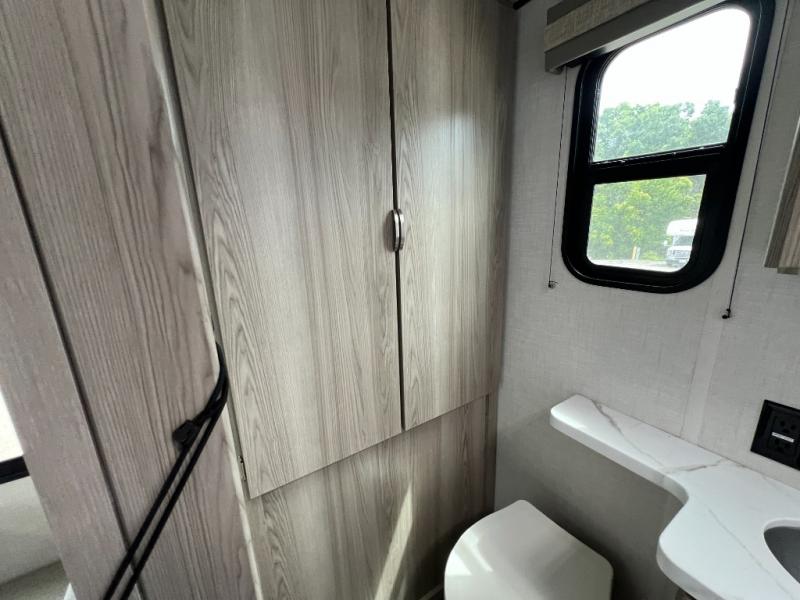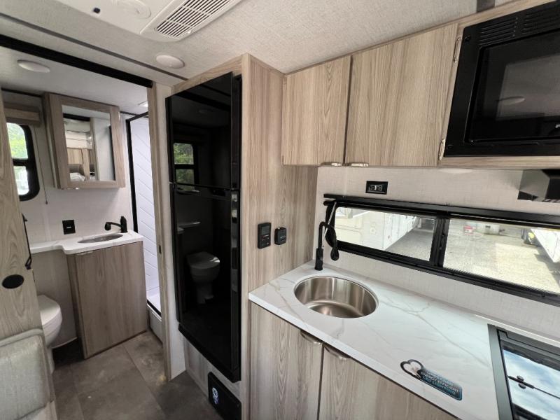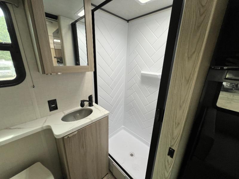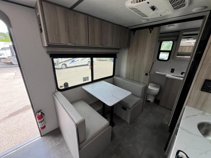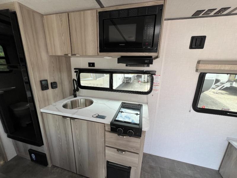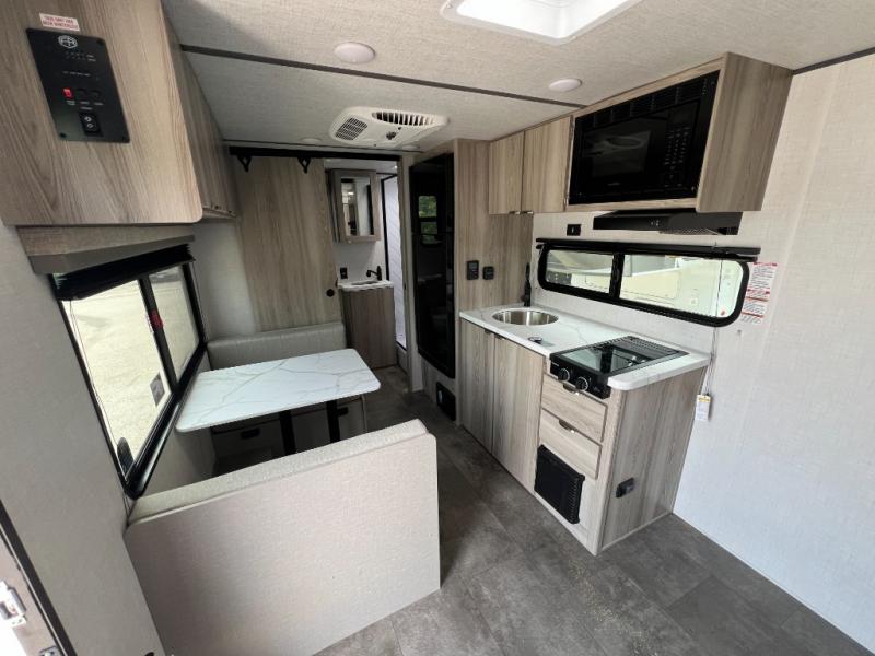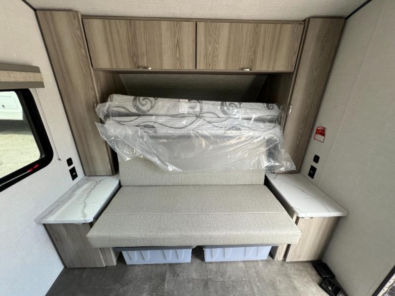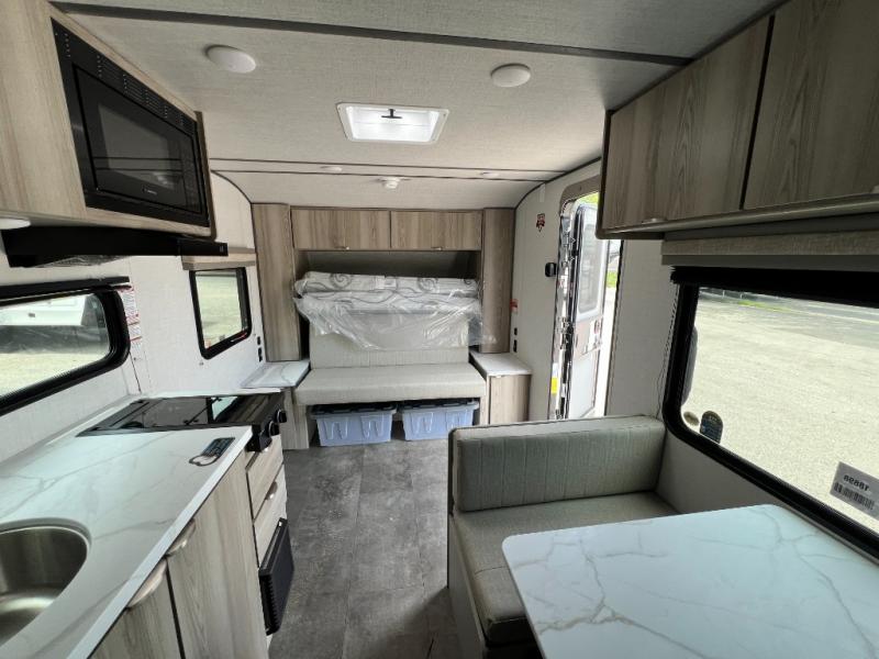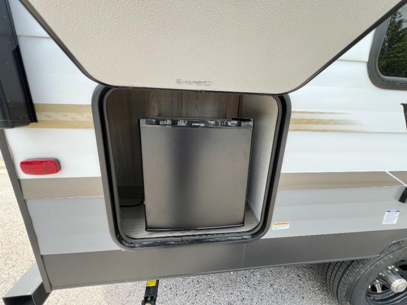 This travel trailer with a full rear bath and versatile sleeping space is your ticket to fun and adventure. While you're putting out the 12' power awning, you can grab the lawn chairs from the full pass-through storage. There is a two burner cooktop and a microwave oven to prepare your meals in, and a booth dinette to dine at. You'll love the RV queen Murphy bed to sleep on at night, and the sofa with storage to relax on during the day!