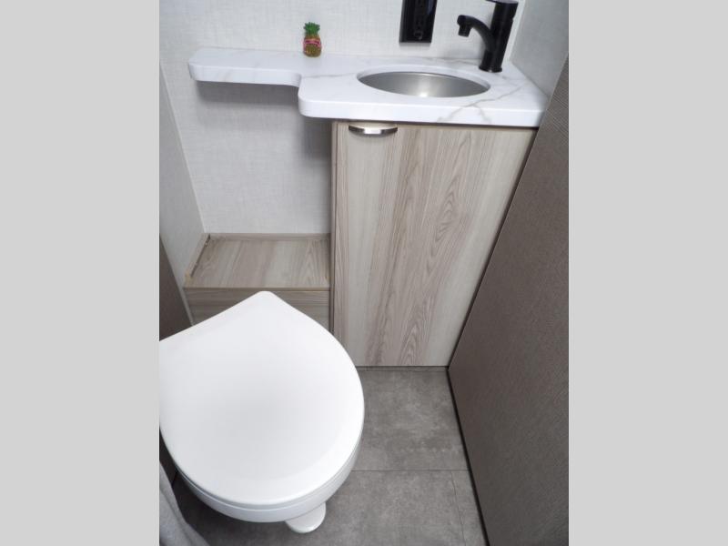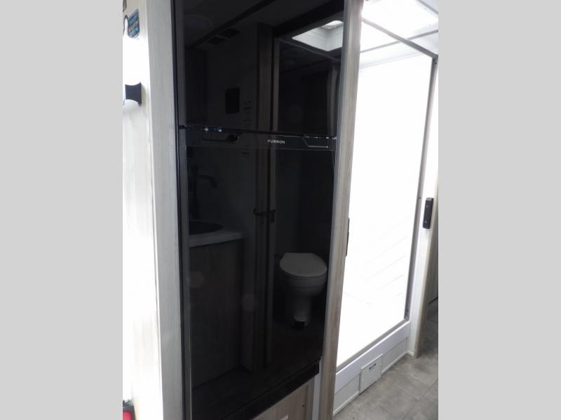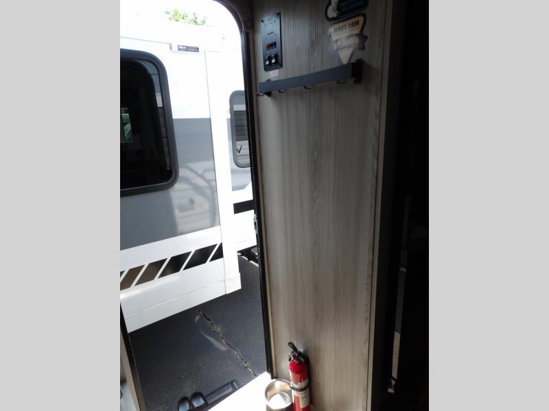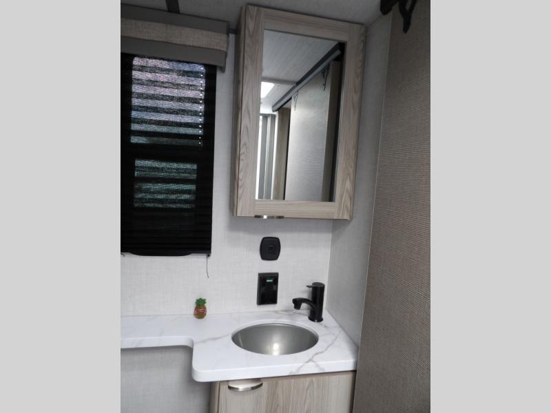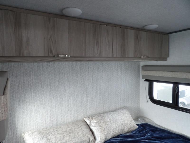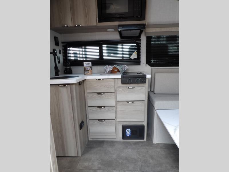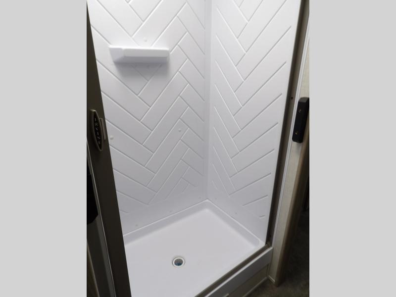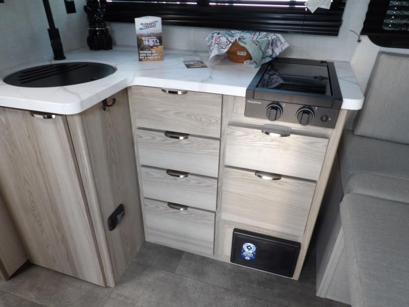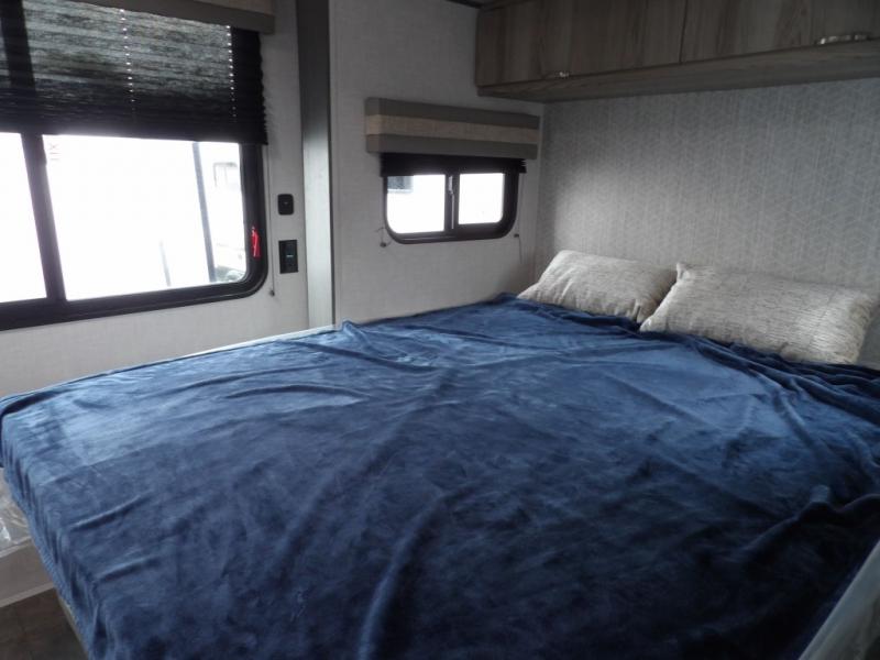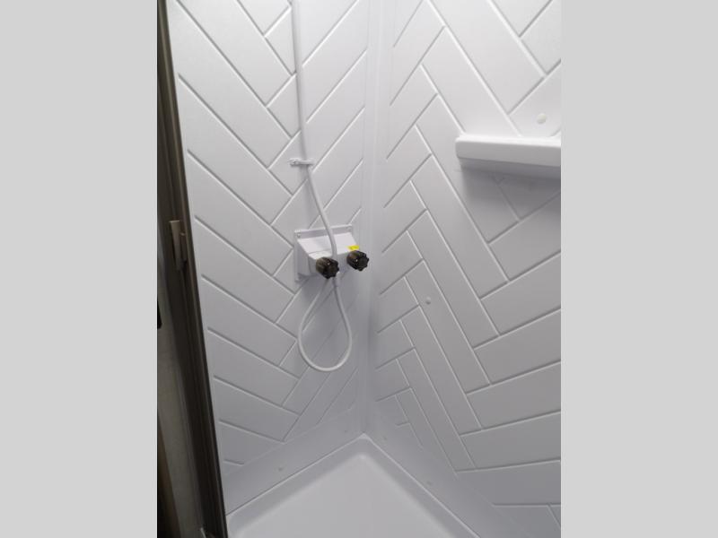 Adventure starts with this travel trailer in tow. Once you arrive at the campground, set up the 15' power awning with LED lights and fill the dog's water bowl using the hot/cold outside shower. Head inside to prepare lunch on the two burner cooktop, and you can dine together around the U-shaped dinette. This area can become your guests' sleeping space at night, while you enjoy the queen bed in the rear bedroom. There is a private toilet and sink, with the private shower right across the hall so two people can get ready for bed at the same time. How convenient!