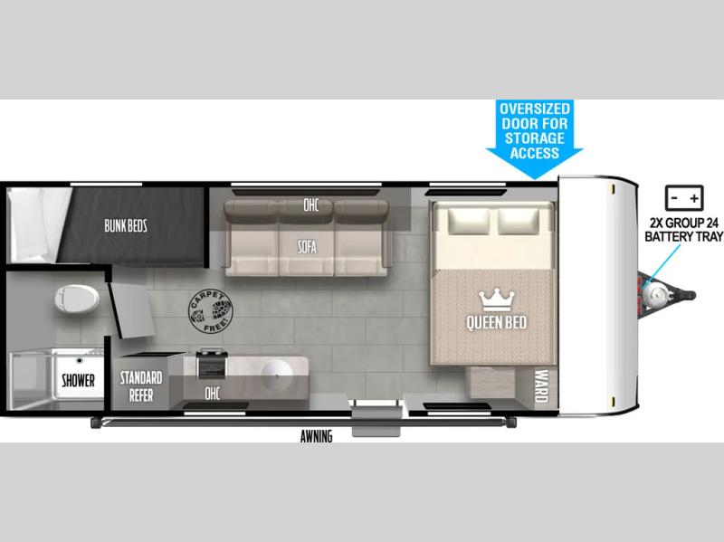 This Limited Edition Wildwood FSX travel trailer provides great value in a lightweight model! Included at no extra cost are a power awning, a 13,500 BTU air conditioner, full-size spare tire, and large under counter refrigerator. There's also a walk-on roof and prep for a ladder. There's room to sleep six, with a queen bed, a pair of bunk beds, and a convertible sofa. Extra thick luxury vinyl flooring is comfortable underfoot and easy to keep clean. The exterior storage has a large baggage door so you can fit those bigger items.