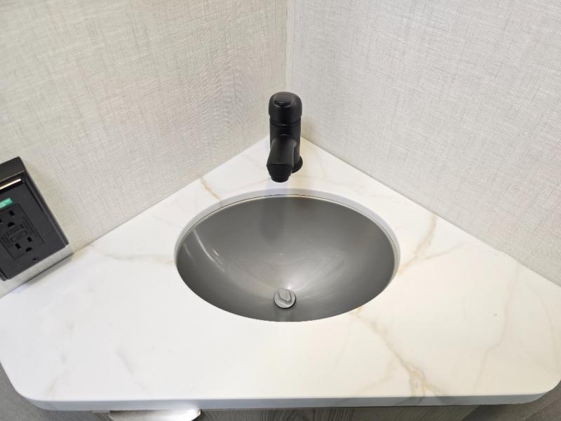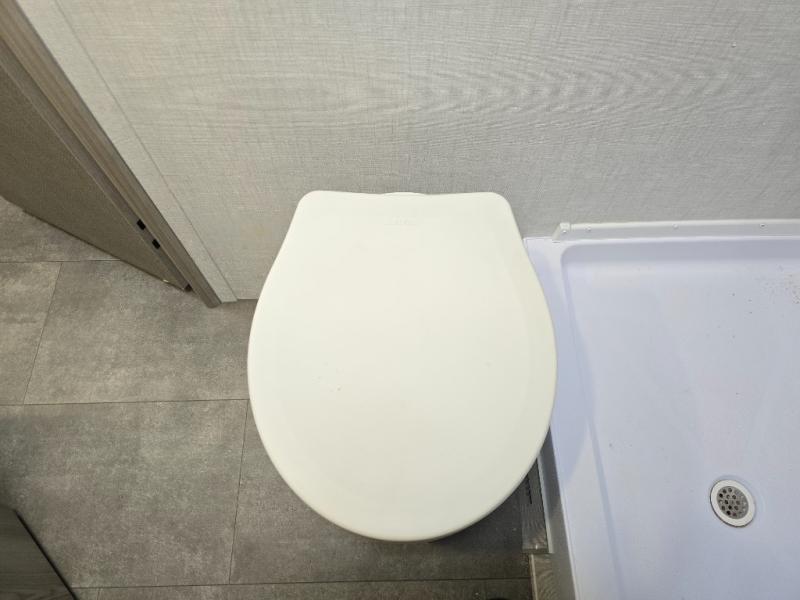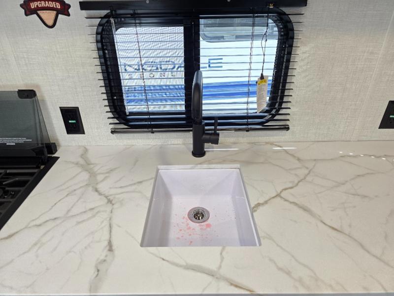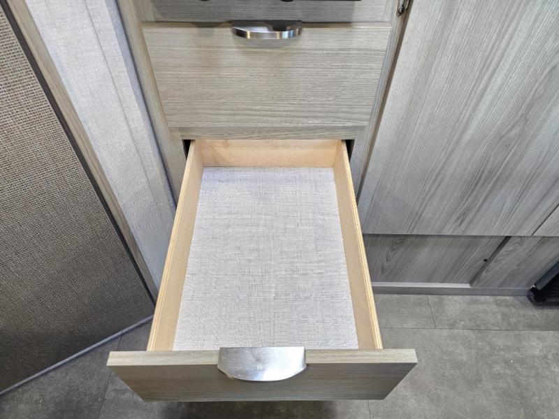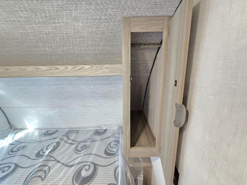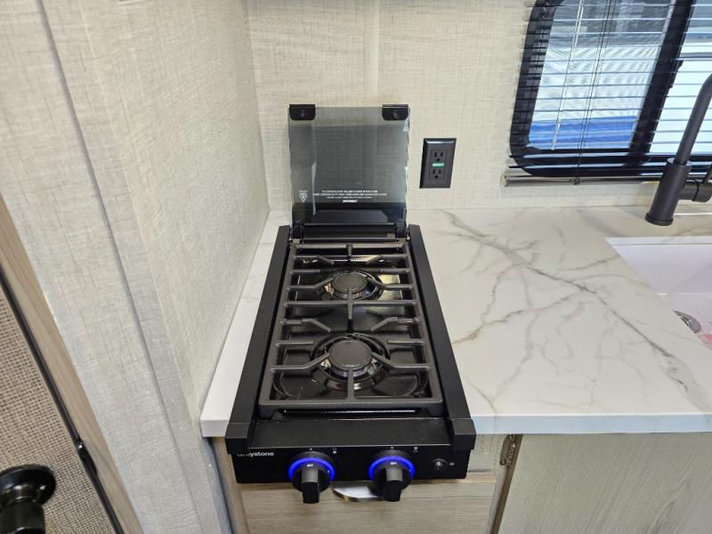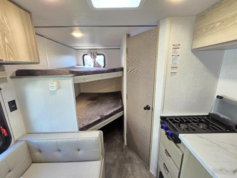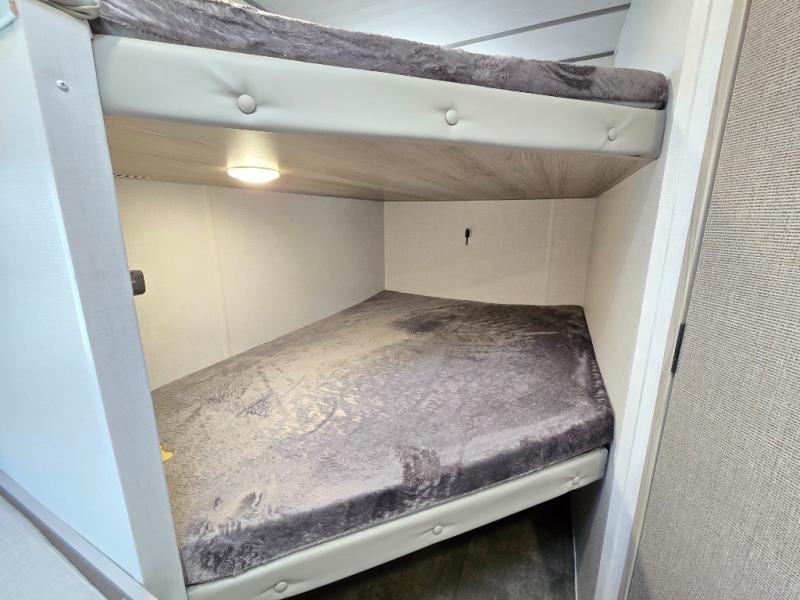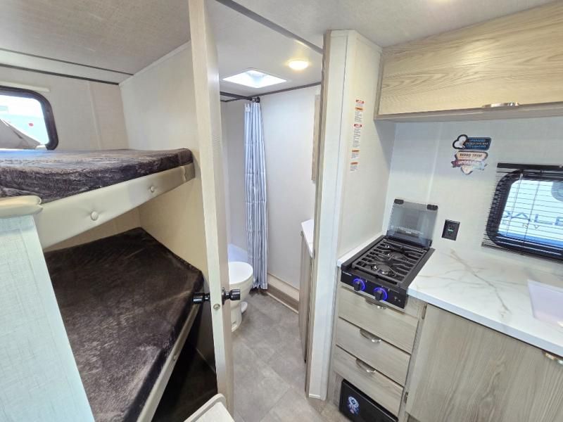 The double-size bunks with storage will be a big selling point in this travel trailer! While your guests take the bunks, you can have the front queen bed all to yourselves, and there is a wardrobe to keep your things organized. A two burner cooktop and microwave will let you make meals each day, and you can dine at the open lounge with a table.