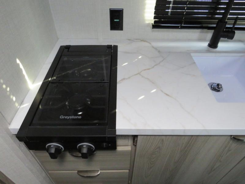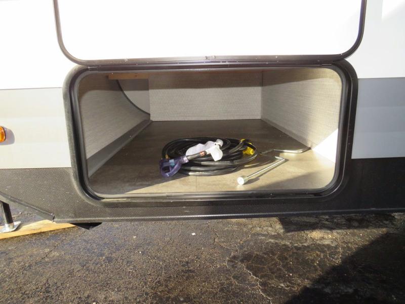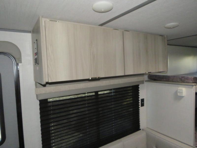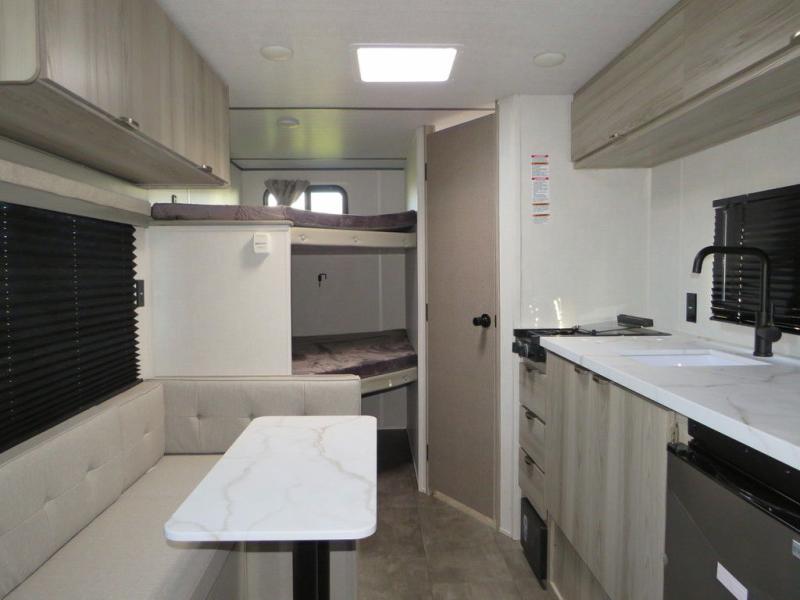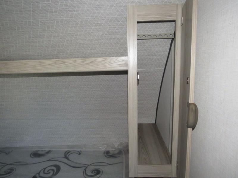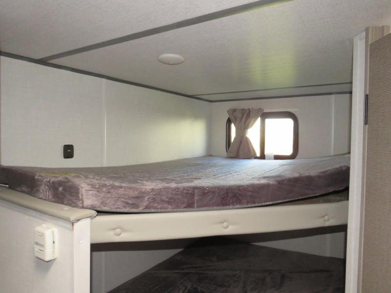 The double-size bunks with storage will be a big selling point in this travel trailer! While your guests take the bunks, you can have the front queen bed all to yourselves, and there is a wardrobe to keep your things organized. A two burner cooktop and microwave will let you make meals each day, and you can dine at the open lounge with a table.
