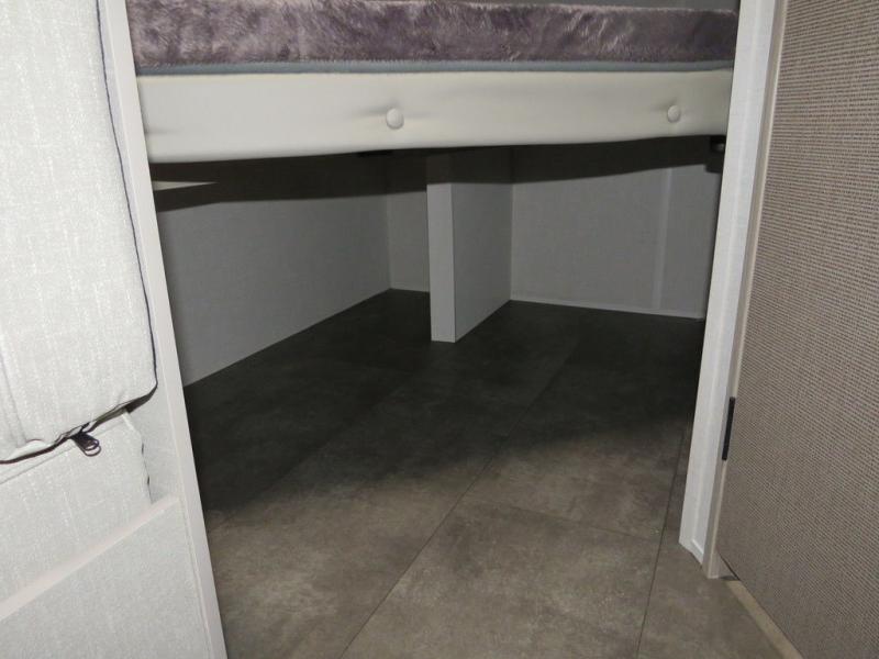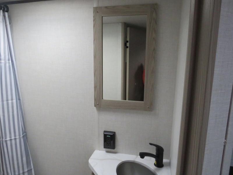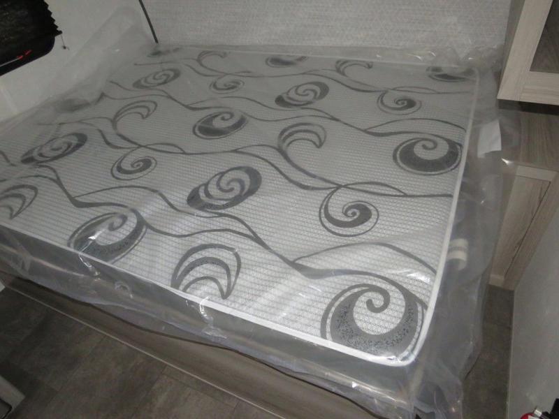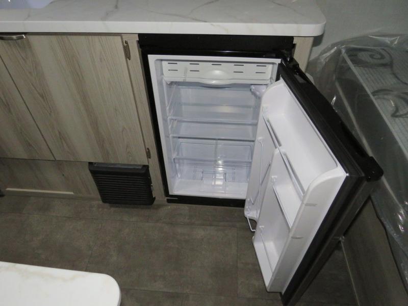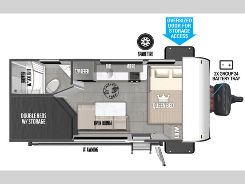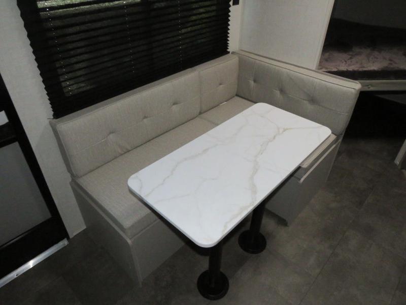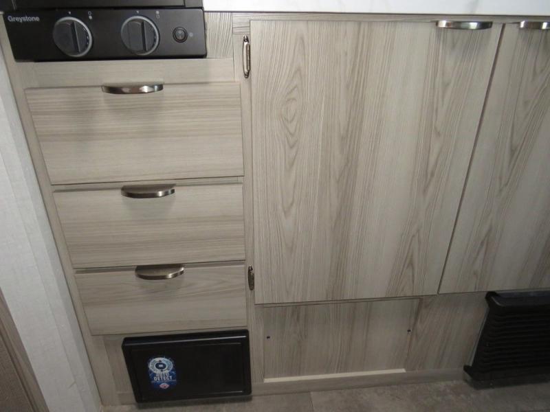 The double-size bunks with storage will be a big selling point in this travel trailer! While your guests take the bunks, you can have the front queen bed all to yourselves, and there is a wardrobe to keep your things organized. A two burner cooktop and microwave will let you make meals each day, and you can dine at the open lounge with a table.