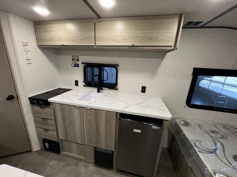 The double-size bunks with storage will be a big selling point in this travel trailer! While your guests take the bunks, you can have the front queen bed all to yourselves, and there is a wardrobe to keep your things organized. A two burner cooktop will let you make meals each day, and you can dine at the open lounge with a table.