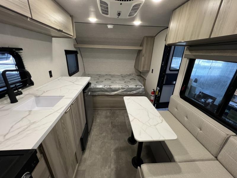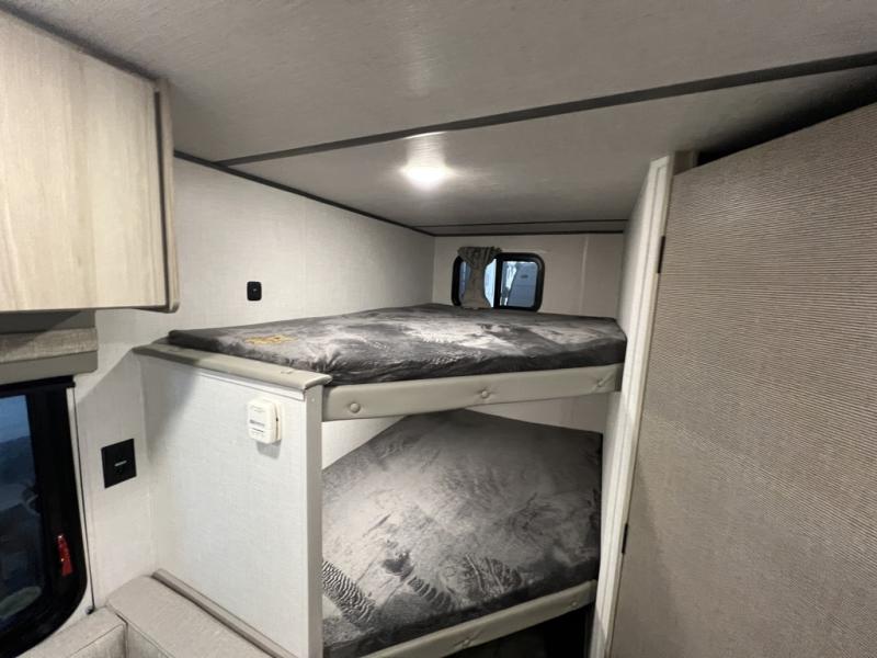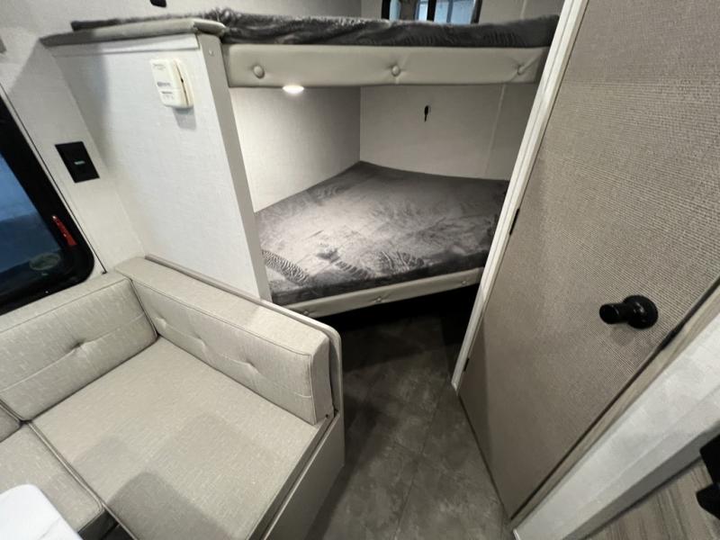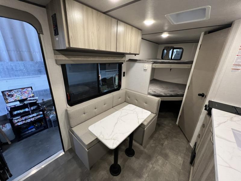The double-size bunks with storage will be a big selling point in this travel trailer! While your guests take the bunks, you can have the front queen bed all to yourselves, and there is a wardrobe to keep your things organized. A two burner cooktop and microwave will let you make meals each day, and you can dine at the open lounge with a table.