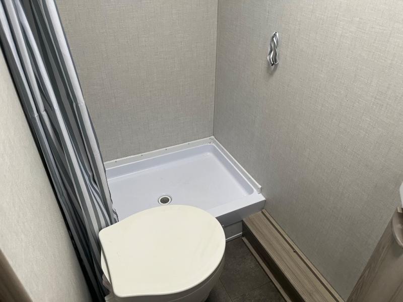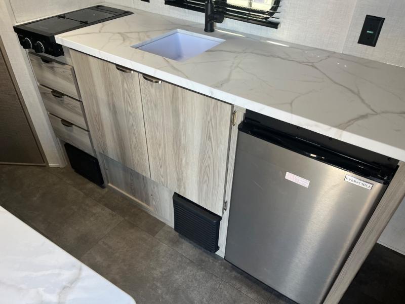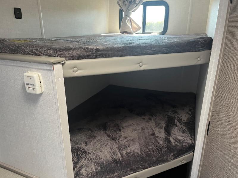 The double-size bunks with storage will be a big selling point in this travel trailer! While your guests take the bunks, you can have the front queen bed all to yourselves, and there is a wardrobe to keep your things organized. A two burner cooktop and microwave will let you make meals each day, and you can dine at the open lounge with a table.
