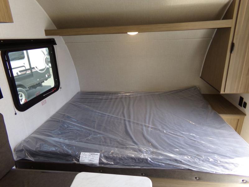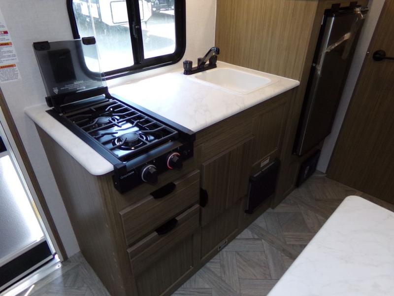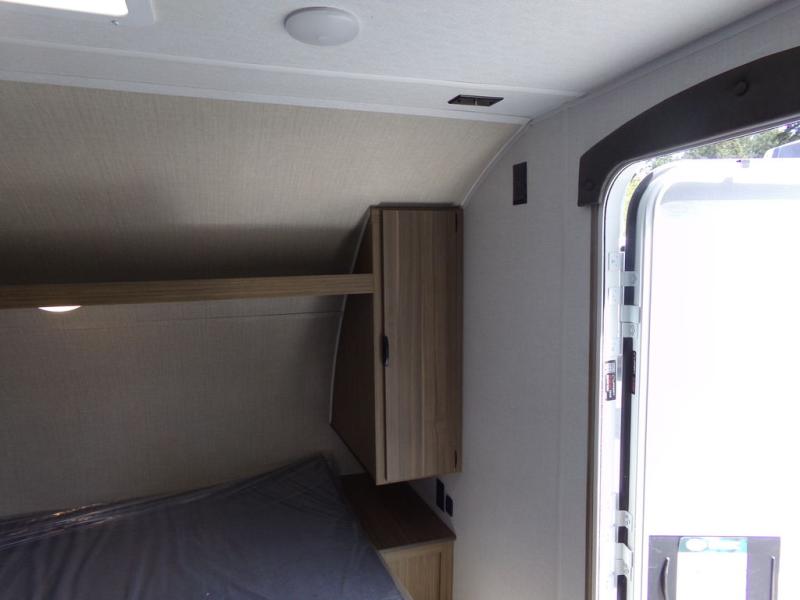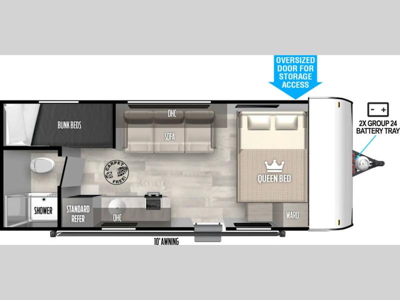 Wherever you decide to camp, this lightweight travel trailer will be perfect for your crew of five to six. There is a front queen bed and bunk beds to sleep on, plus a sofa that can double as seating and sleeping space. The private bath includes a shower and toilet so you don't have to use the camp's facilities at night. A cooktop and microwave oven will let you cook meals each day, and a refrigerator will keep cold items fresh. Outside, you'll enjoy the power awning with an LED light strip and the oversized door for storage access!