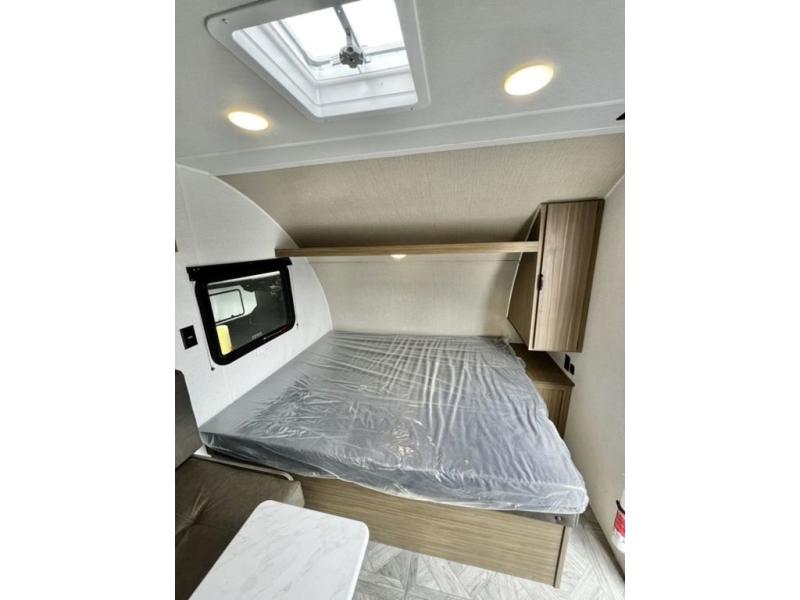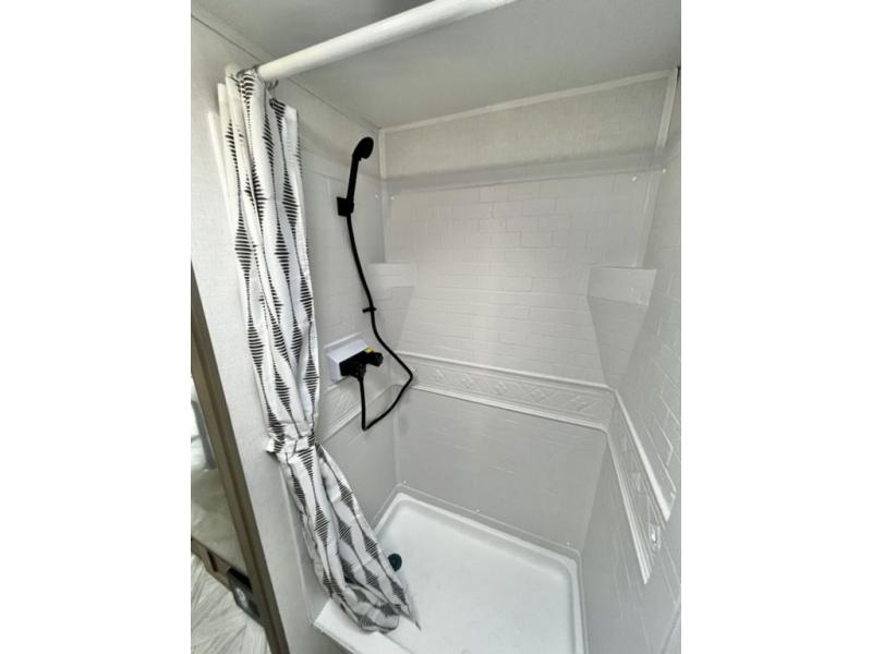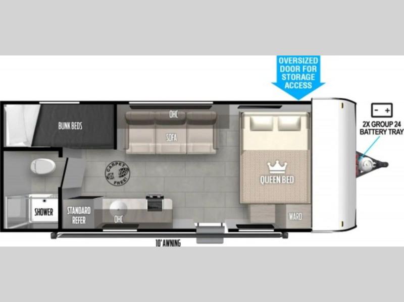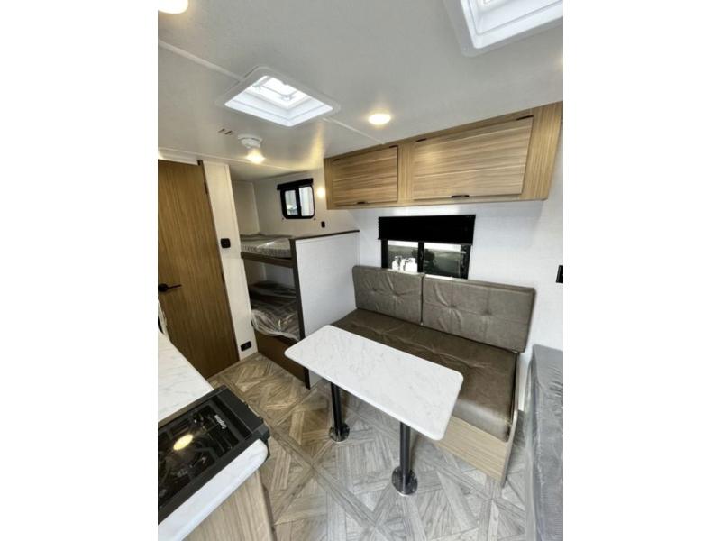 Wherever you decide to camp, this lightweight travel trailer will be perfect for your crew of five to six. There is a front queen bed and bunk beds to sleep on, plus a sofa that can double as seating and sleeping space. The private bath includes a shower and toilet so you don't have to use the camp's facilities at night. A cooktop and microwave oven will let you cook meals each day, and a refrigerator will keep cold items fresh. Outside, you'll enjoy the power awning with an LED light strip and the oversized door for storage access!