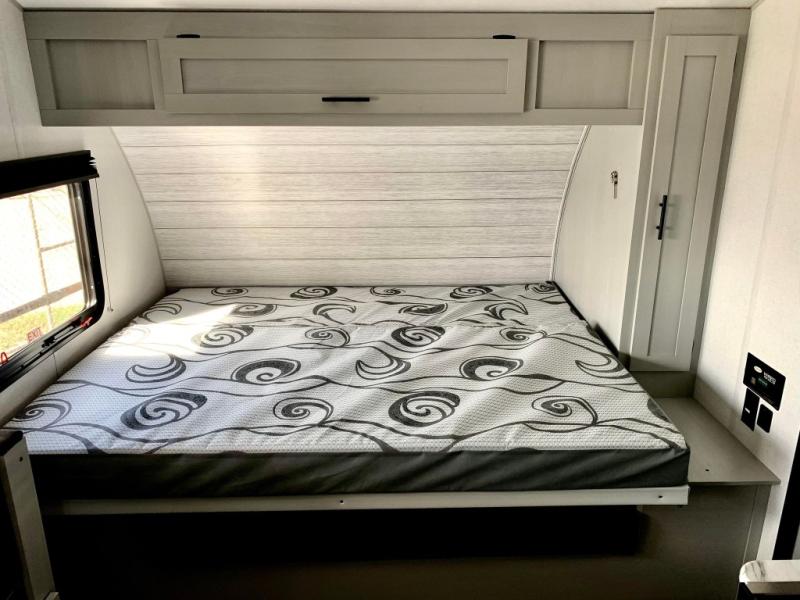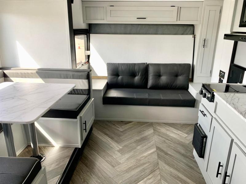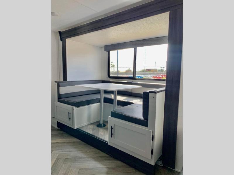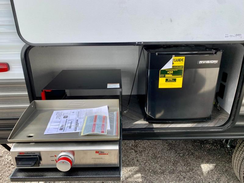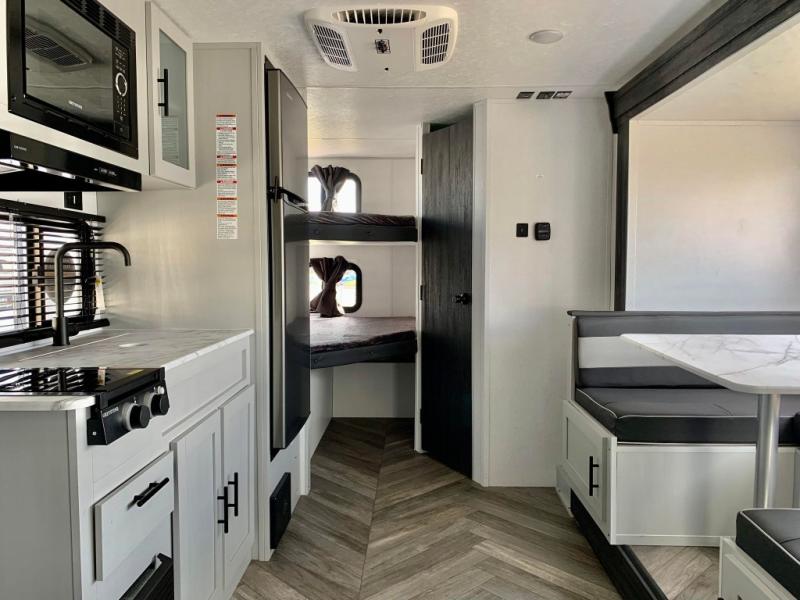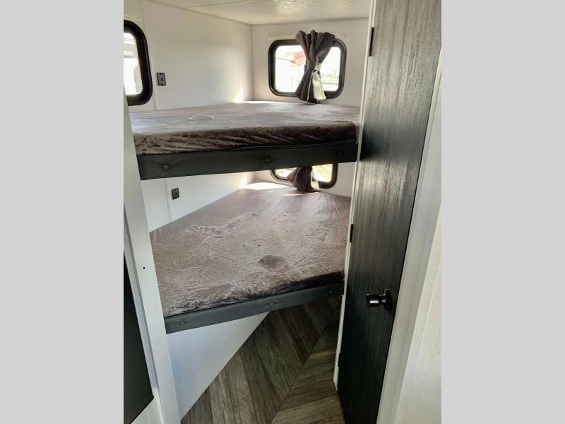 Bring your whole crew along for trips in this roomy travel trailer that can sleep eight people each night. Once you've set up the 14' power awning with LED lights, make lunch on the outside kitchen. Explore some trails or take your fishing poles down to the river, then head back to the trailer to clean up in the full bath. The kids may want to rest on the double-size bunks, while the adults play a game around the U-shaped dinette. This model also includes a sofa plus a Murphy bed that lowers over the sofa when you're ready for bed. Don't let this travel trailer slip away!