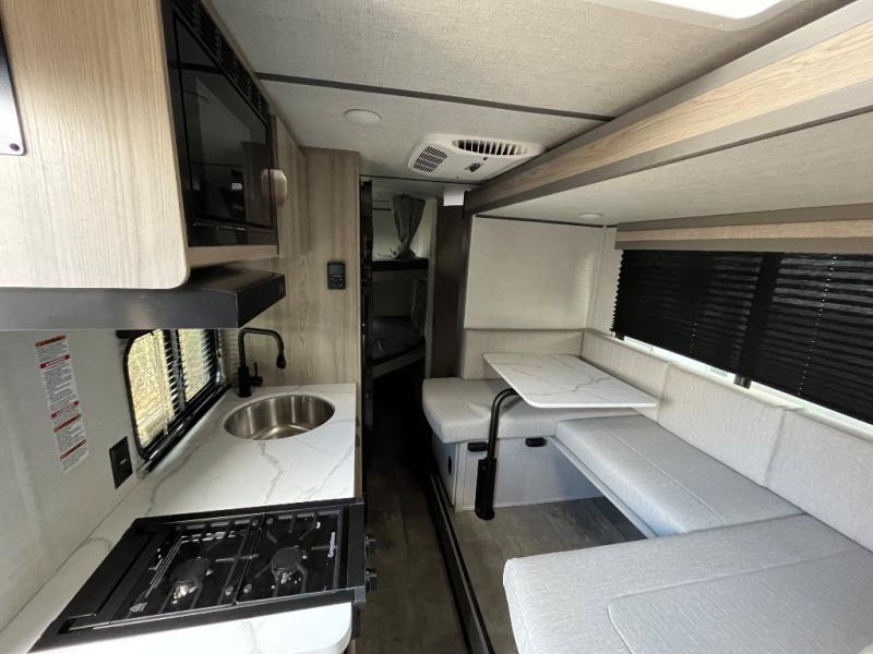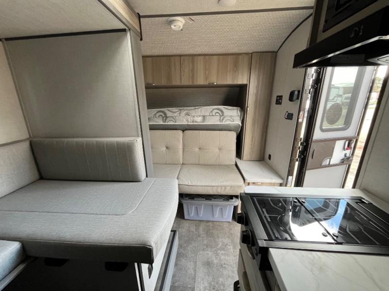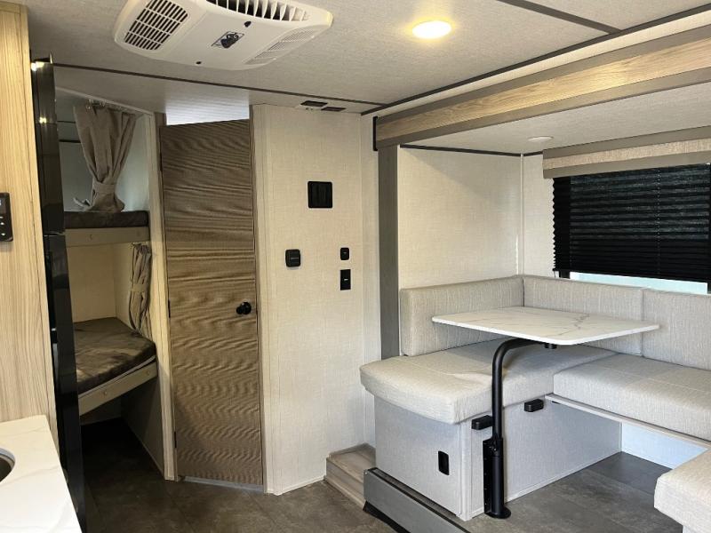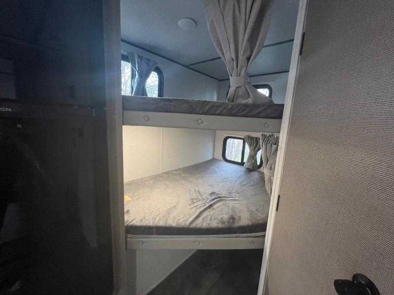 Bring your whole crew along for trips in this roomy travel trailer that can sleep eight people each night. Once you've set up the 14' power awning with LED lights, make lunch on the outside kitchen. Explore some trails or take your fishing poles down to the river, then head back to the trailer to clean up in the full bath. The kids may want to rest on the double-size bunks, while the adults play a game around the U-shaped dinette. This model also includes a sofa plus a Murphy bed that lowers over the sofa when you're ready for bed. Don't let this travel trailer slip away!