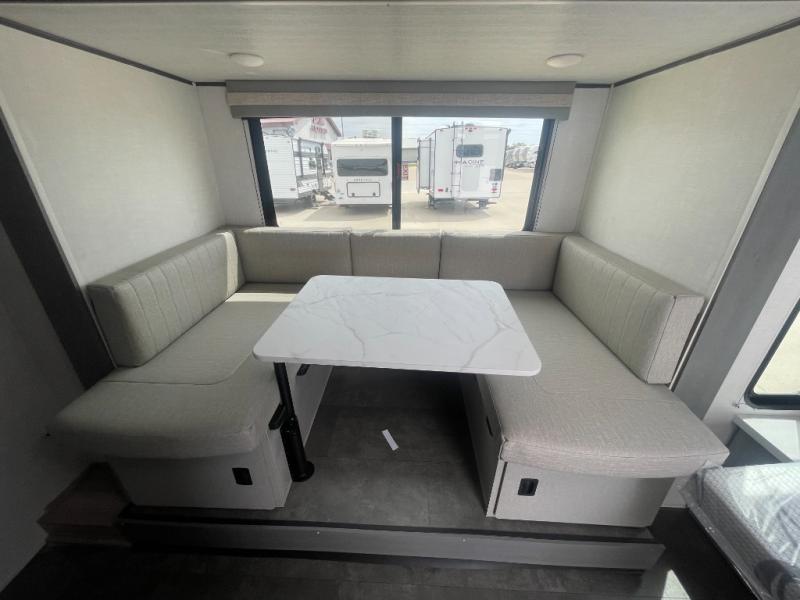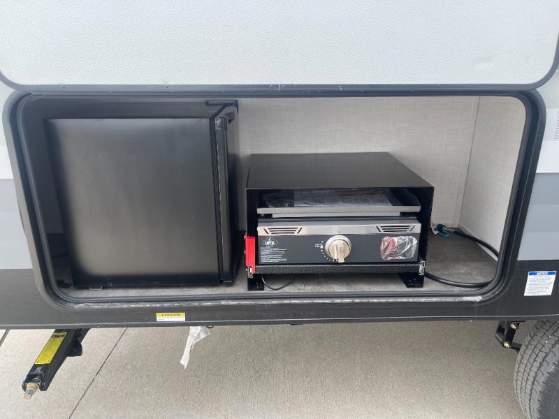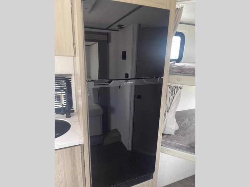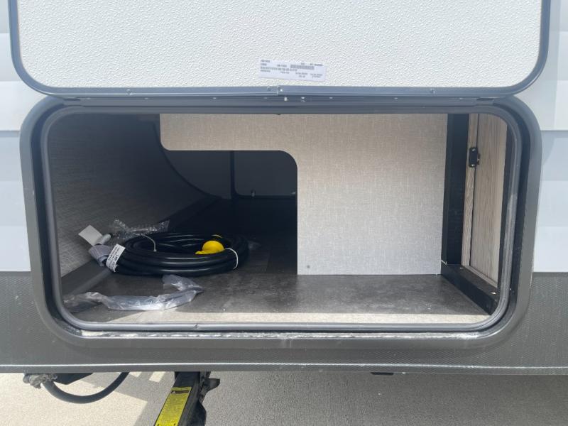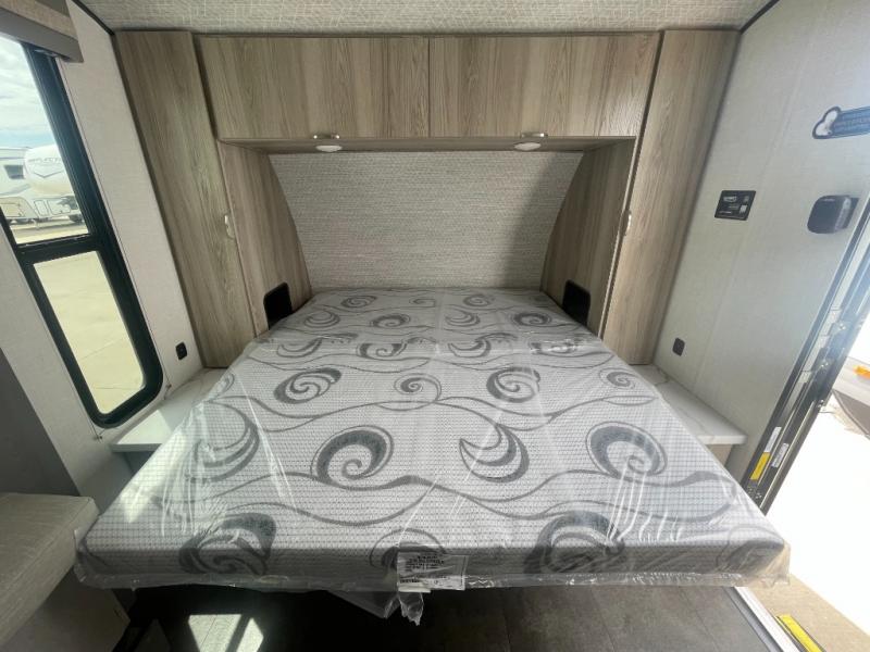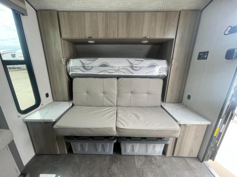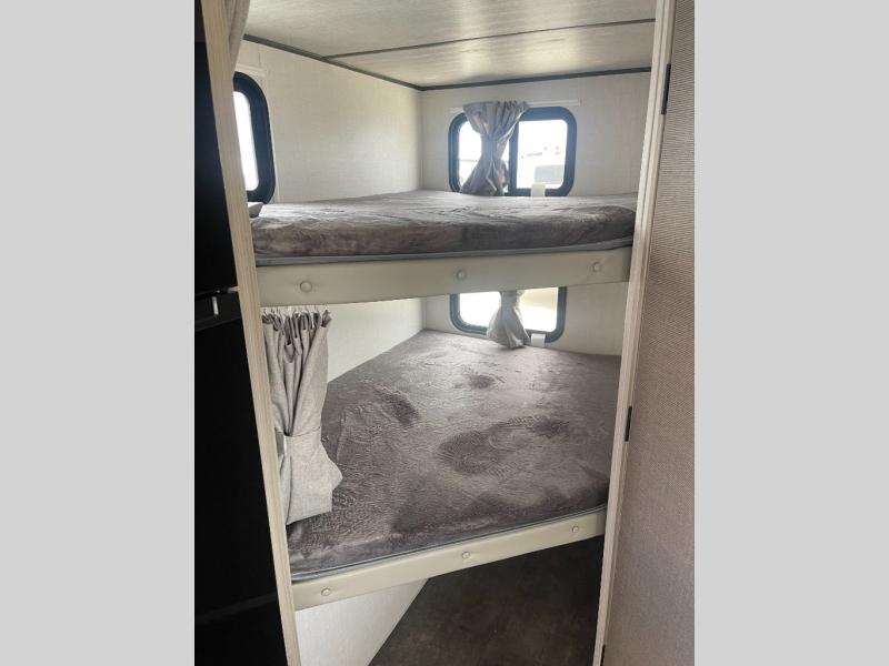 Bring your whole crew along for trips in this roomy travel trailer that can sleep eight people each night. Once you've set up the 14' power awning with LED lights, make lunch on the outside kitchen. Explore some trails or take your fishing poles down to the river, then head back to the trailer to clean up in the full bath. The kids may want to rest on the double-size bunks, while the adults play a game around the U-shaped dinette. This model also includes a sofa plus a Murphy bed that lowers over the sofa when you're ready for bed. Don't let this travel trailer slip away!