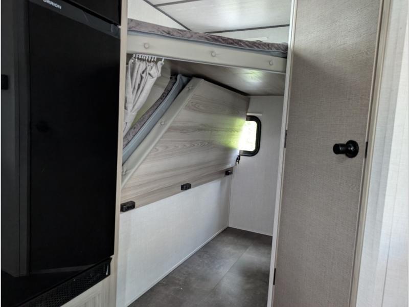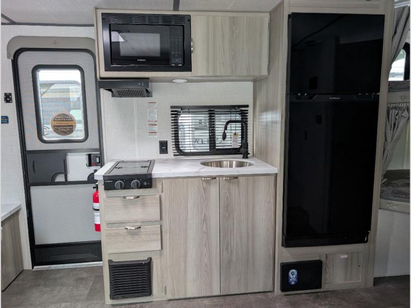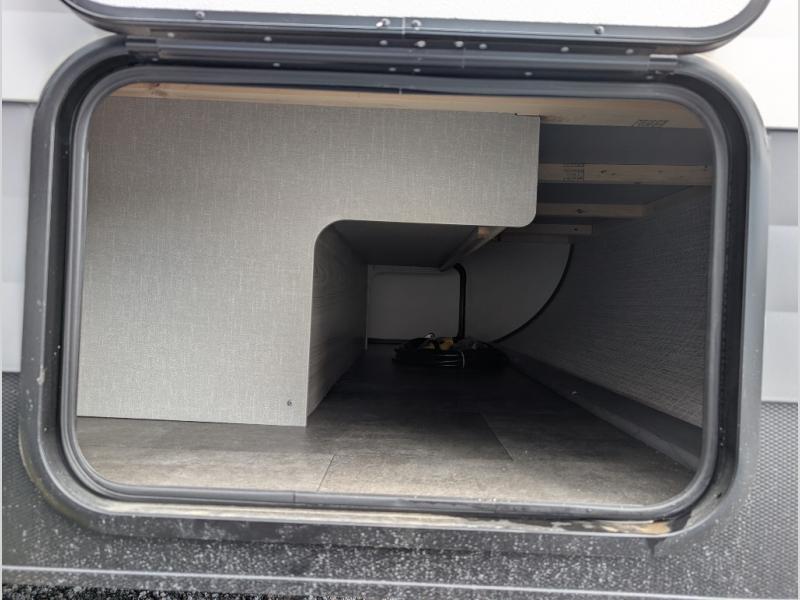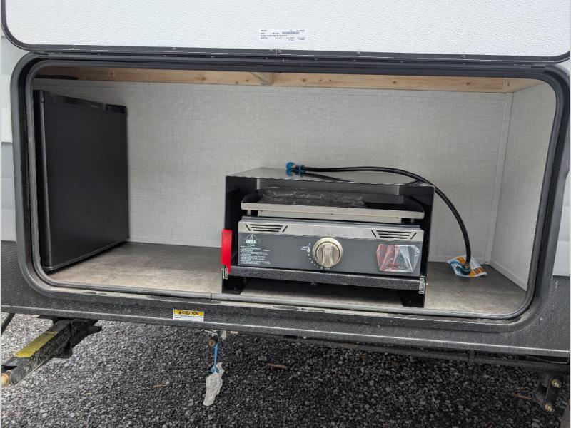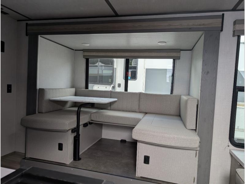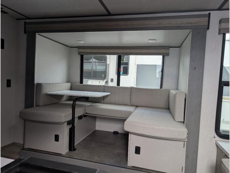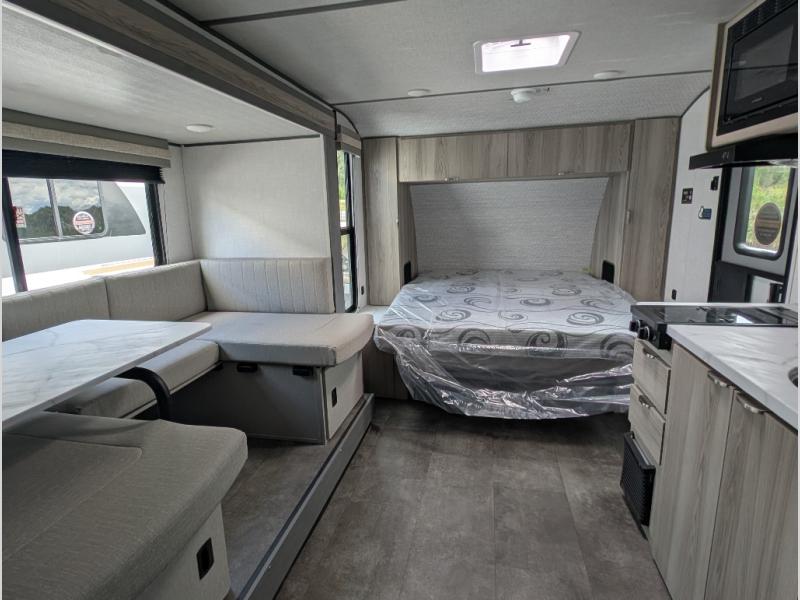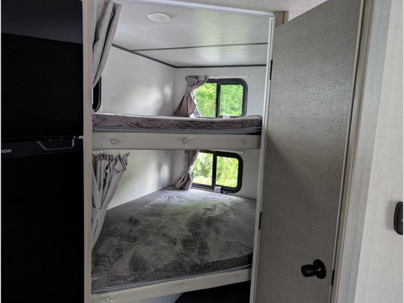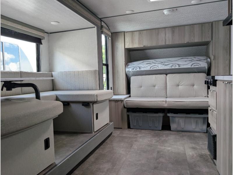 Bring your whole crew along for trips in this roomy travel trailer that can sleep eight people each night. Once you've set up the 14' power awning with LED lights, make lunch on the outside kitchen. Explore some trails or take your fishing poles down to the river, then head back to the trailer to clean up in the full bath. The kids may want to rest on the double-size bunks, while the adults play a game around the U-shaped dinette. This model also includes a sofa plus a Murphy bed that lowers over the sofa when you're ready for bed. Don't let this travel trailer slip away!