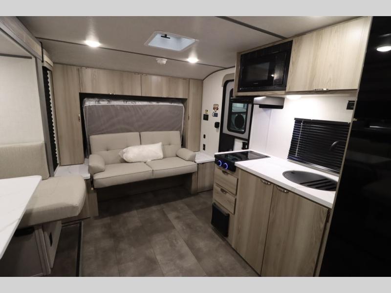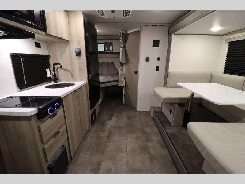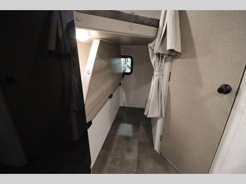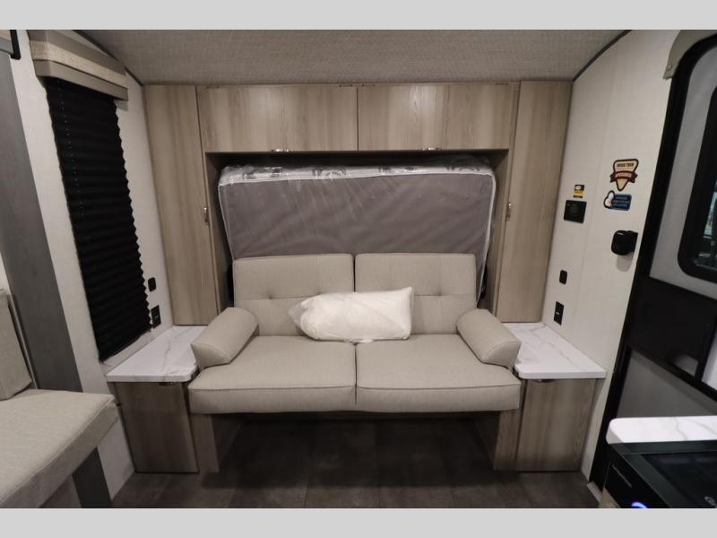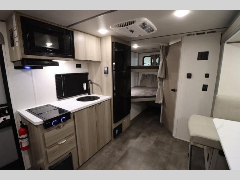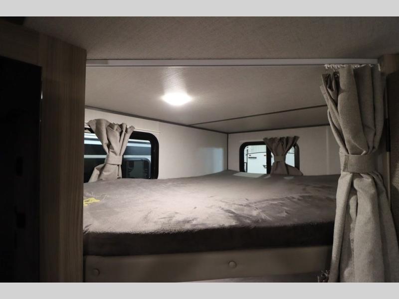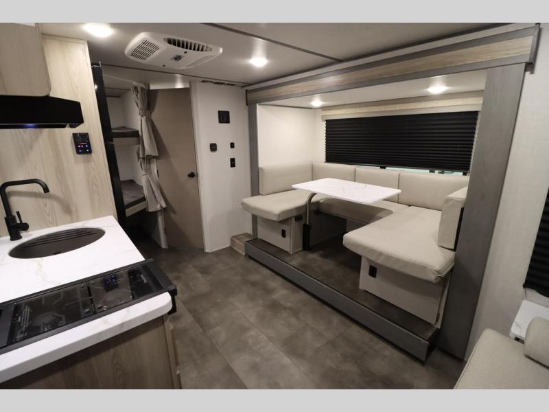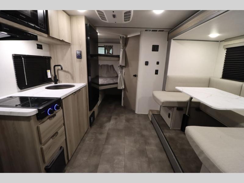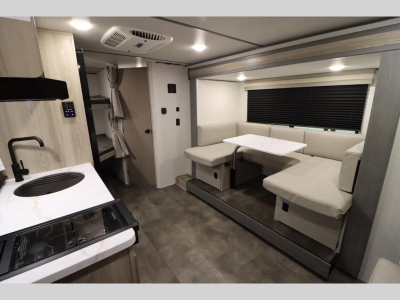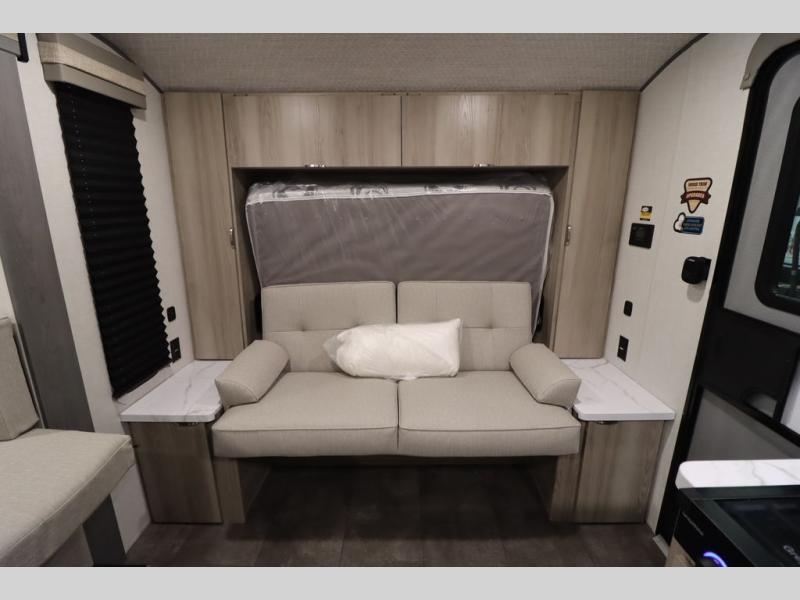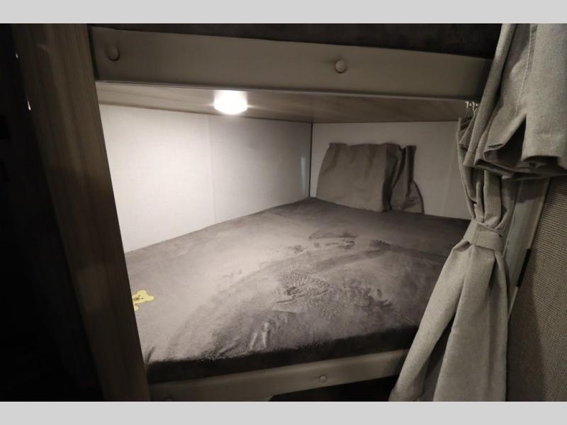 Bring your whole crew along for trips in this roomy travel trailer that can sleep eight people each night. Once you've set up the 14' power awning with LED lights, make lunch on the outside kitchen. Explore some trails or take your fishing poles down to the river, then head back to the trailer to clean up in the full bath. The kids may want to rest on the double-size bunks, while the adults play a game around the U-shaped dinette. This model also includes a sofa plus a Murphy bed that lowers over the sofa when you're ready for bed. Don't let this travel trailer slip away!