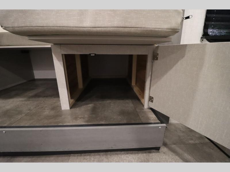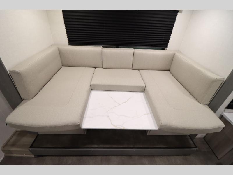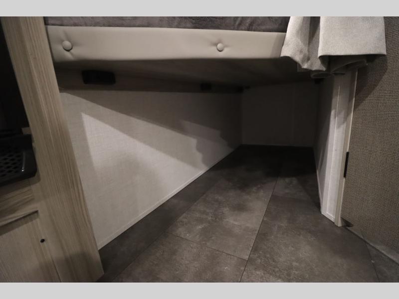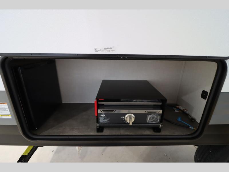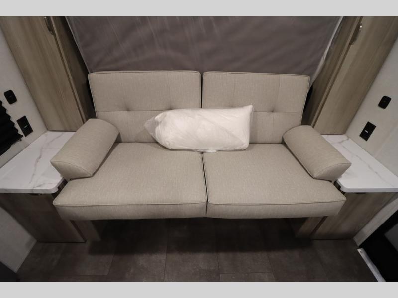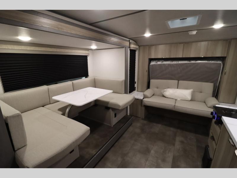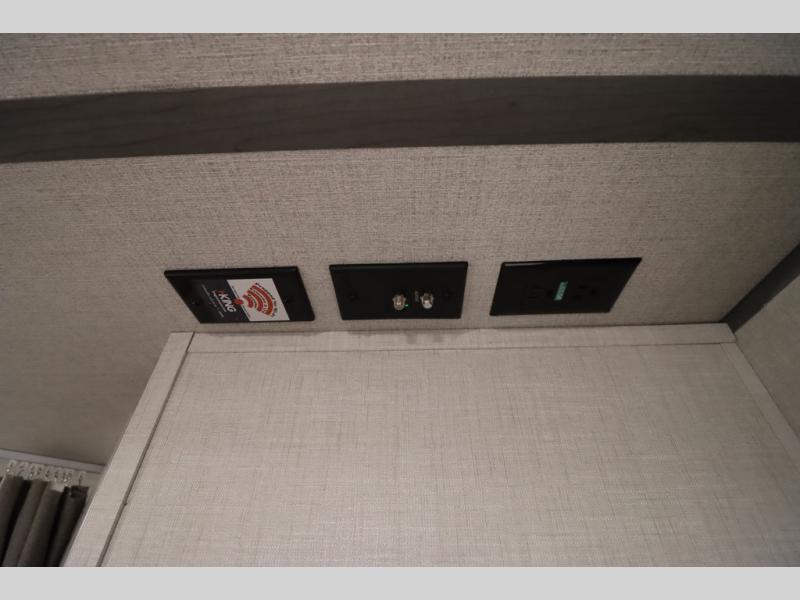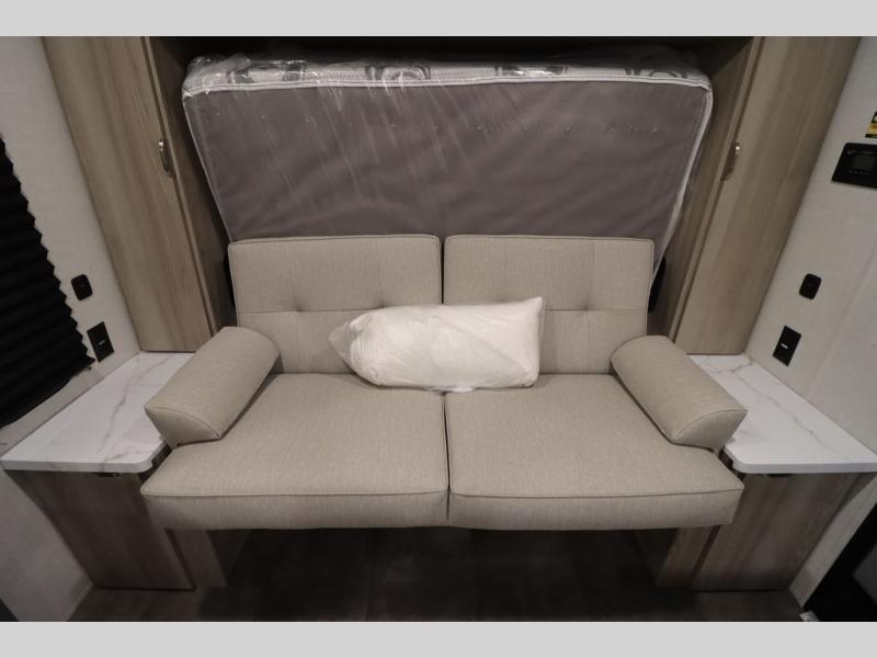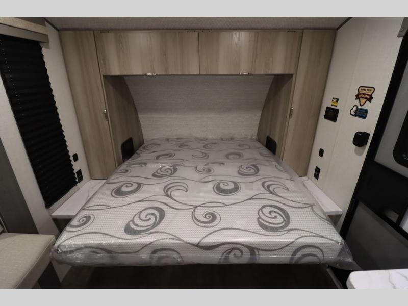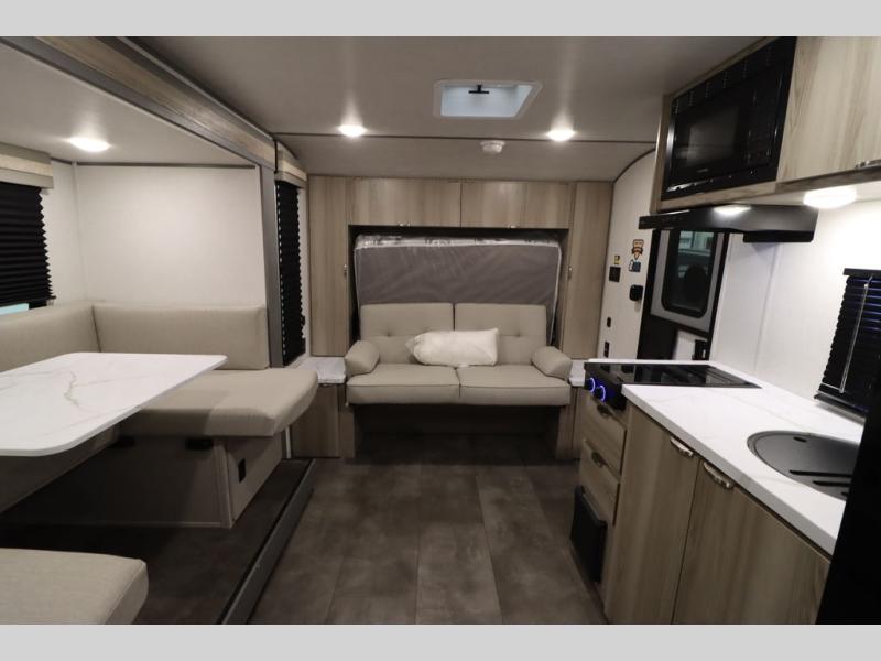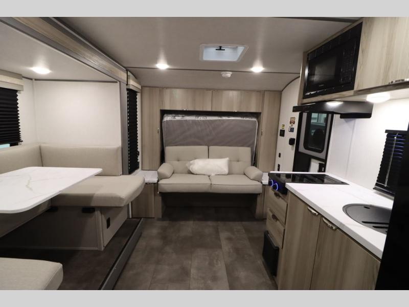 Bring your whole crew along for trips in this roomy travel trailer that can sleep eight people each night. Once you've set up the 14' power awning with LED lights, make lunch on the outside kitchen. Explore some trails or take your fishing poles down to the river, then head back to the trailer to clean up in the full bath. The kids may want to rest on the double-size bunks, while the adults play a game around the U-shaped dinette. This model also includes a sofa plus a Murphy bed that lowers over the sofa when you're ready for bed. Don't let this travel trailer slip away!