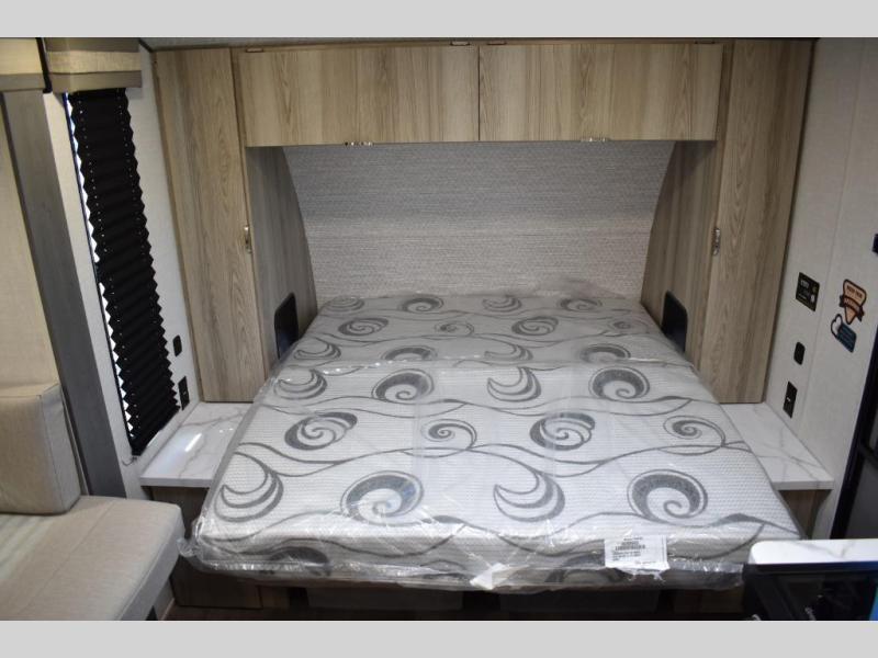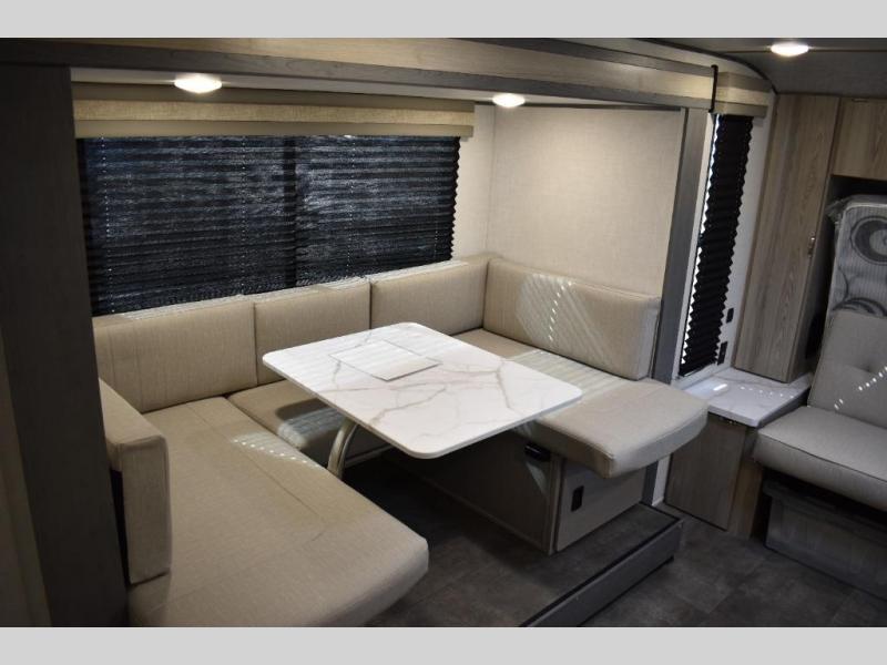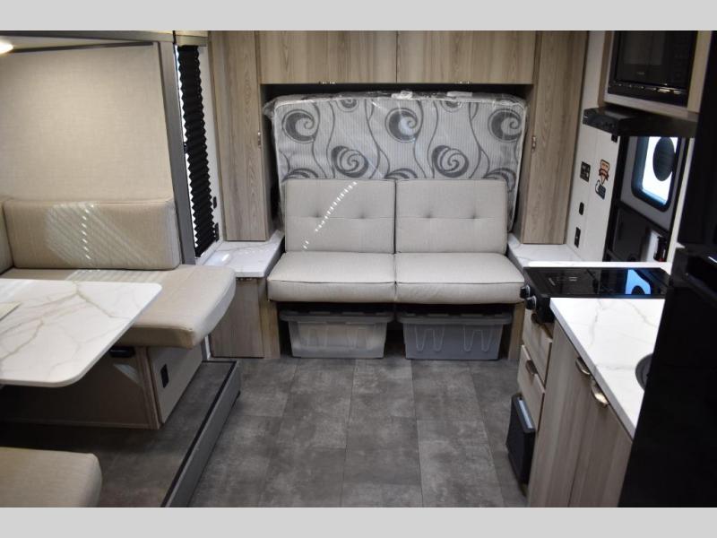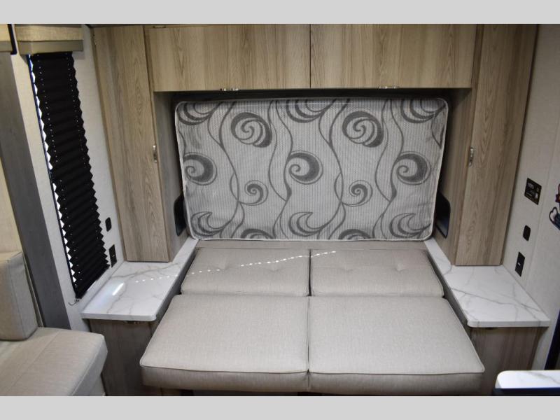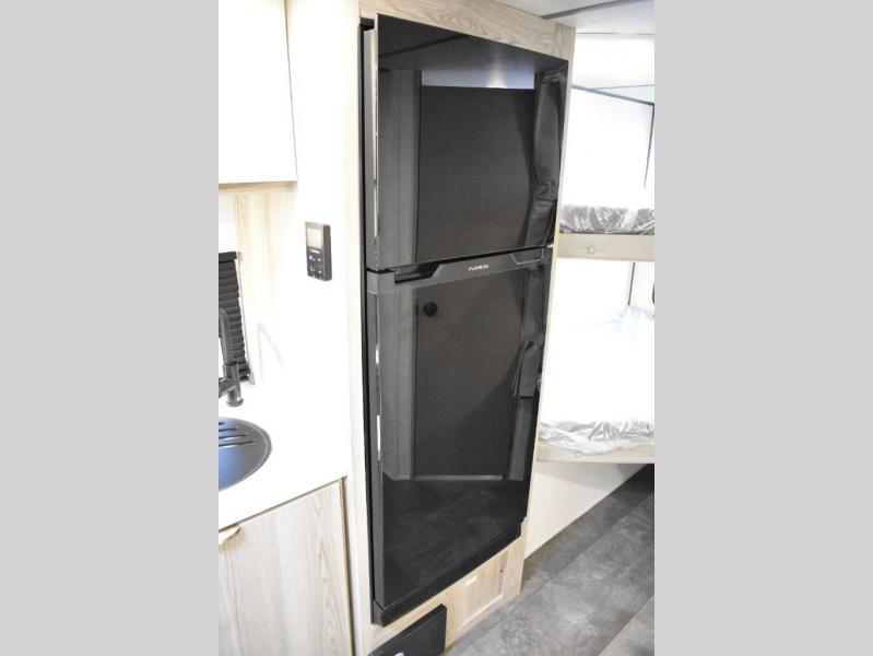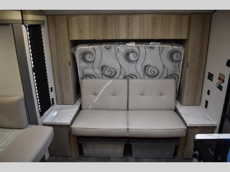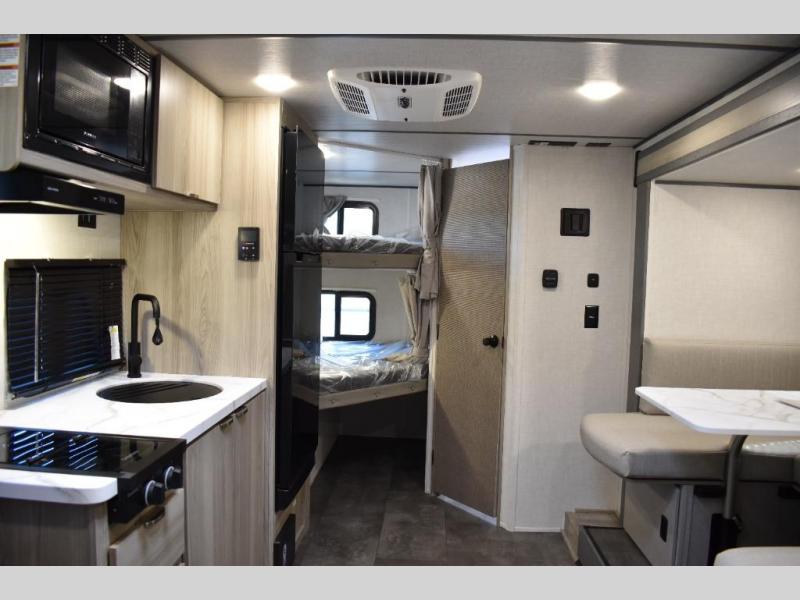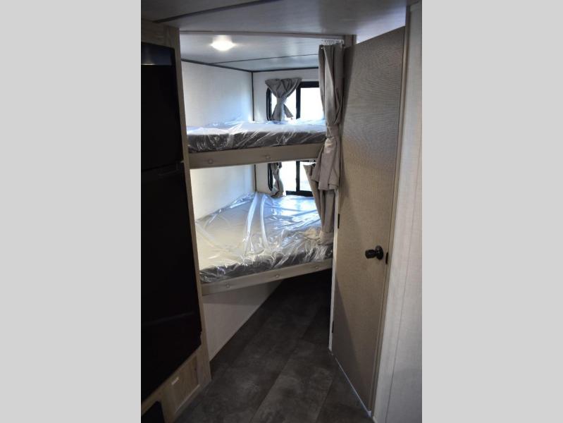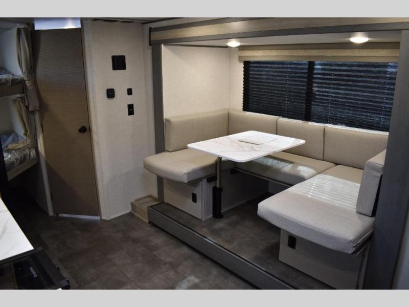 Bring your whole crew along for trips in this roomy travel trailer that can sleep eight people each night. Once you've set up the 14' power awning with LED lights, make lunch on the outdoor kitchen. Explore some trails or take your fishing poles down to the river, then head back to the trailer to clean up in the full bath. The kids may want to rest on the double-size bunks, while the adults play a game around the U-shaped dinette. This model also includes a sofa plus a Murphy bed that lowers over the sofa when you're ready for bed. Don't let this travel trailer slip away!