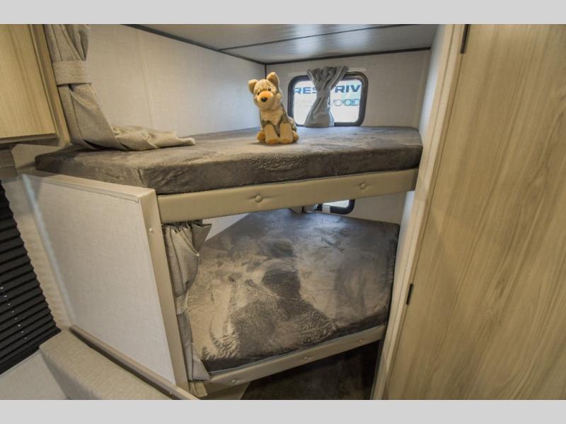 Find all you're looking for and more in this versatile travel trailer. The Murphy bed will be perfect for a great night's rest, and in the morning you can easily fold it up to relax on the sofa. The chef of your group can prepare breakfast on the two burner cooktop, or head outdoors to cook on the outside kitchen and enjoy the 14' power awning. The full bath allows you to stay clean all week, and the double-size bunks will be perfect for extra guests!