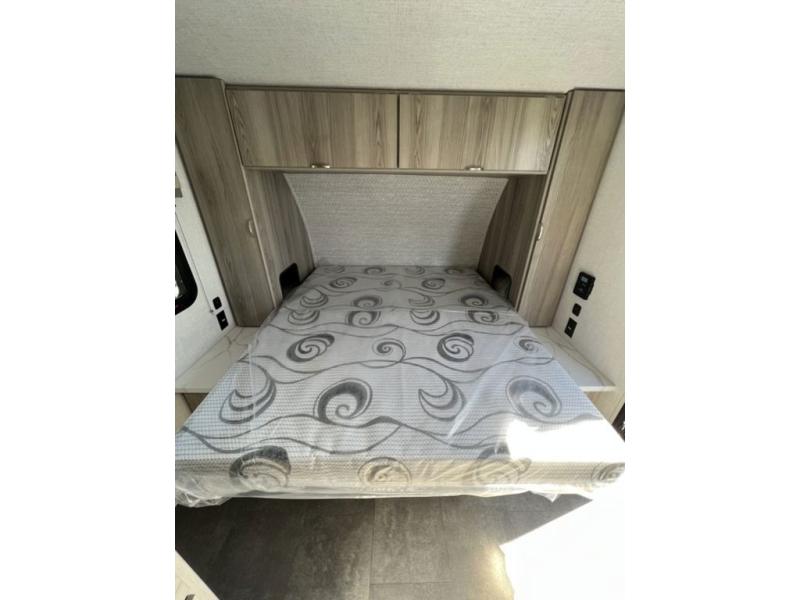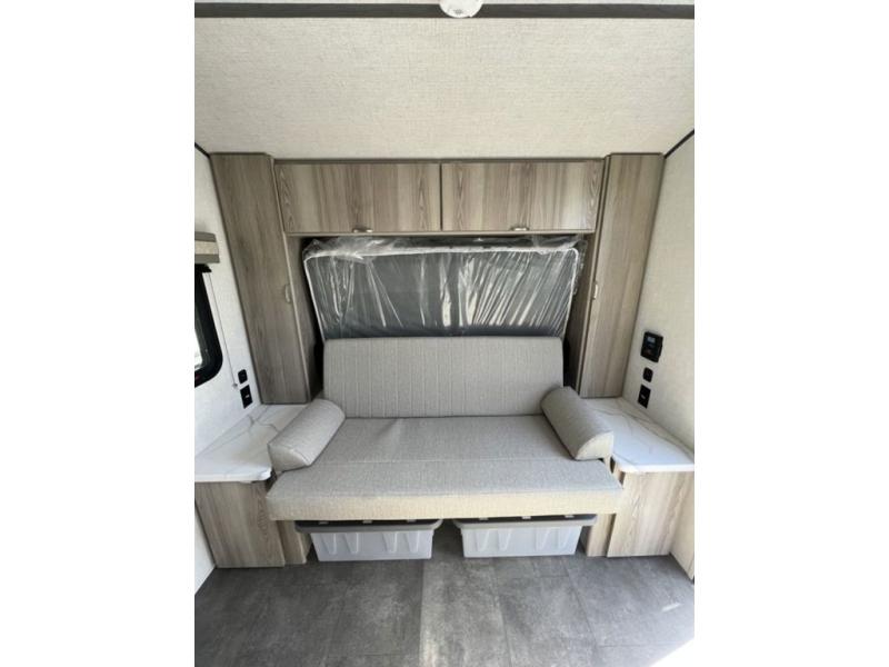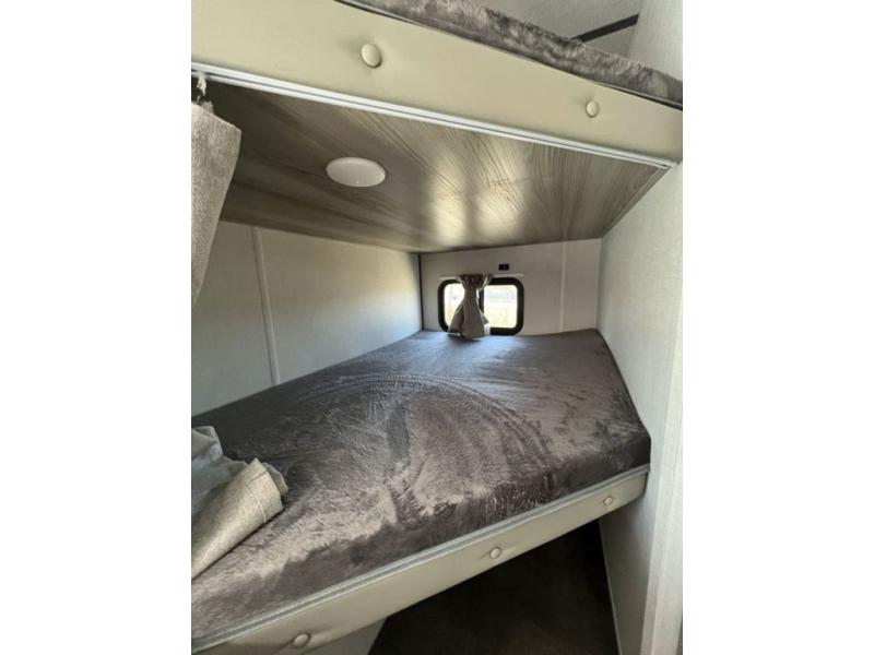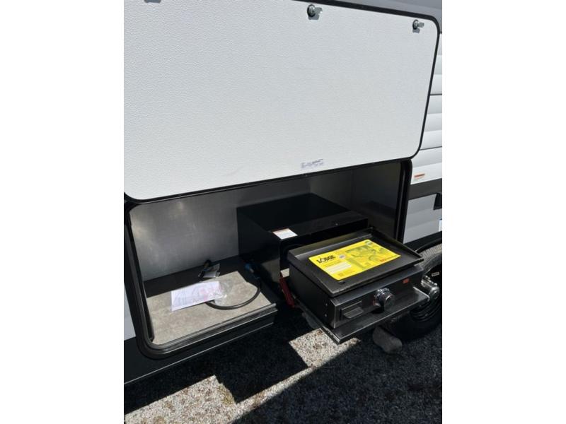 Find all you're looking for and more in this versatile travel trailer. The Murphy bed will be perfect for a great night's rest, and in the morning you can easily fold it up to relax on the sofa. The chef of your group can prepare breakfast on the two burner cooktop, or head outdoors to cook on the outside kitchen and enjoy the 14' power awning. The full bath allows you to stay clean all week, and the double-size bunks will be perfect for extra guests!