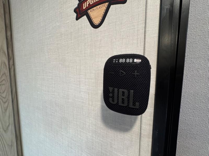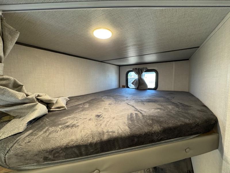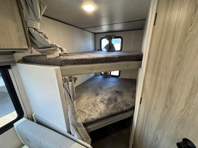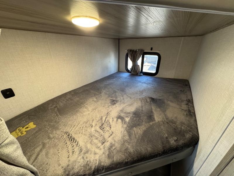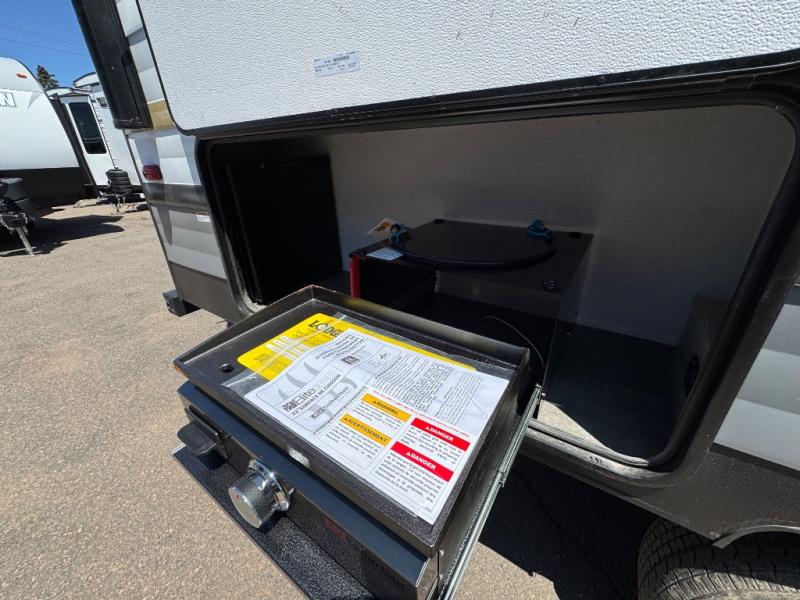 Find all you're looking for and more in this versatile travel trailer. The Murphy bed will be perfect for a great night's rest, and in the morning you can easily fold it up to relax on the sofa. The chef of your group can prepare breakfast on the two burner cooktop, or head outdoors to cook on the outside kitchen and enjoy the 14' power awning. The full bath allows you to stay clean all week, and the double-size bunks will be perfect for extra guests!