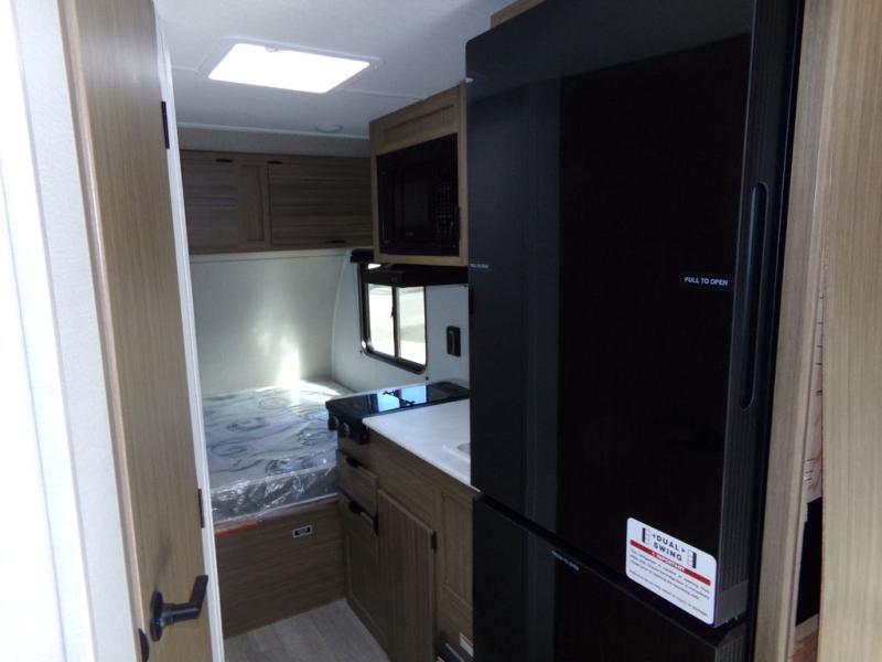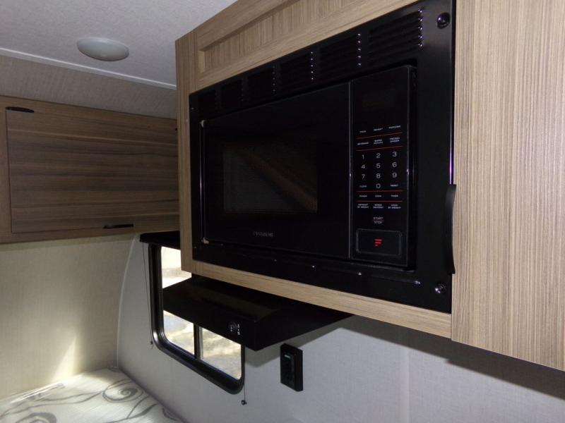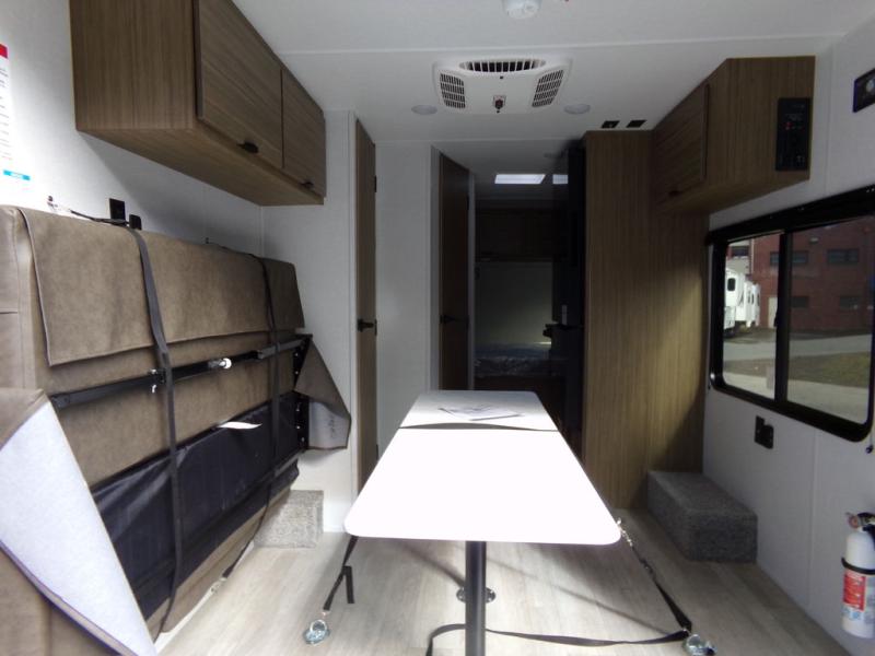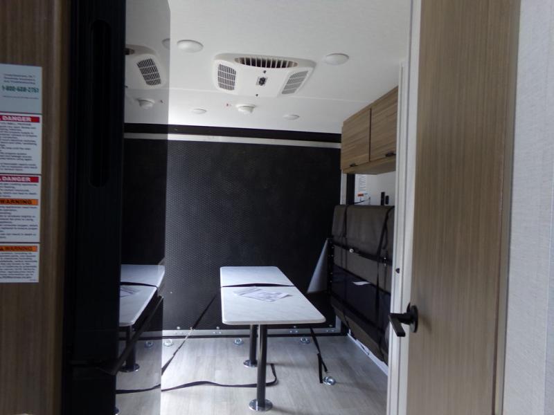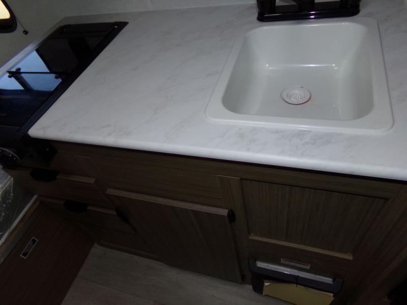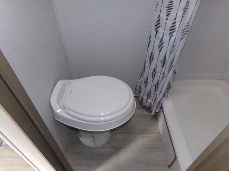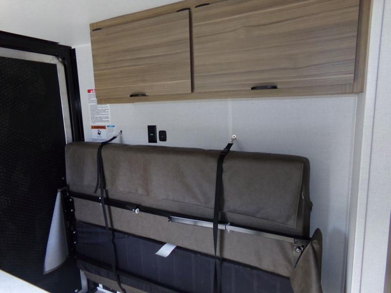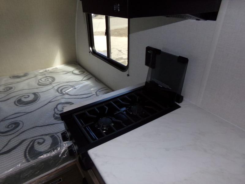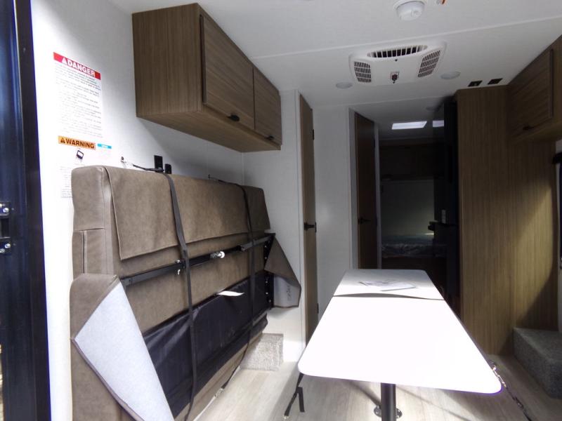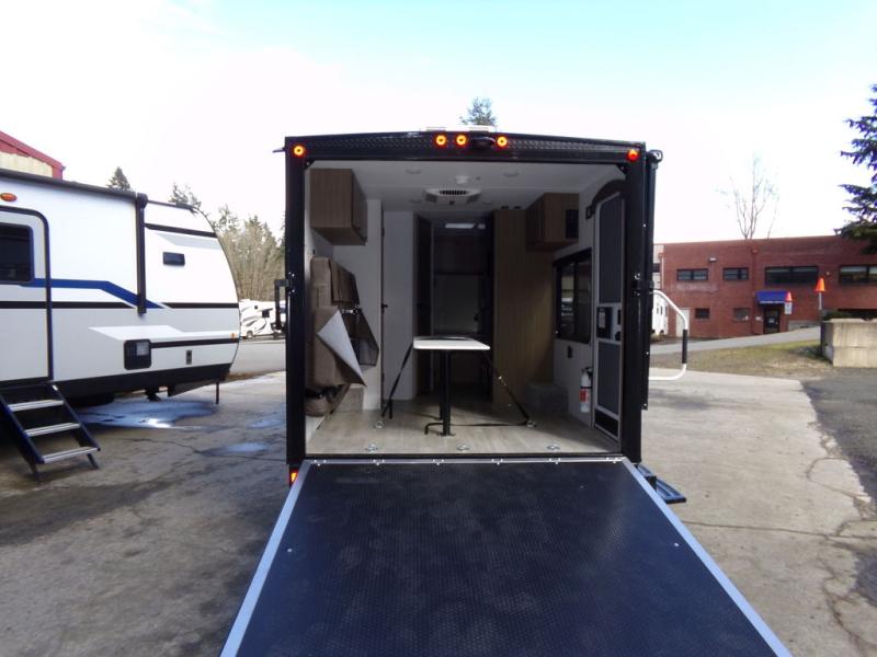 Load up the dirt bikes and grab your helmets for a fun weekend riding the trails. This lightweight toy hauler features a 3,000 lb. capacity ramp door for easy unloading, and you can enjoy a quick lunch at the table in front of the flip-down sofa before heading out. There is a private shower and toilet to freshen up in after your adventures, and the two burner cooktop will be perfect to whip up dinner. You'll want nothing more at the end of the day than to crash on the front queen bed with overhead storage for your belongings!