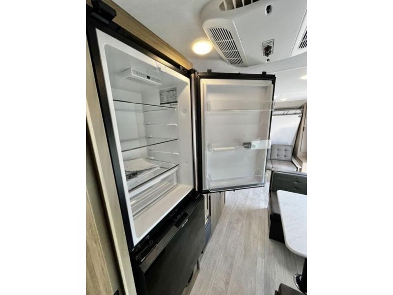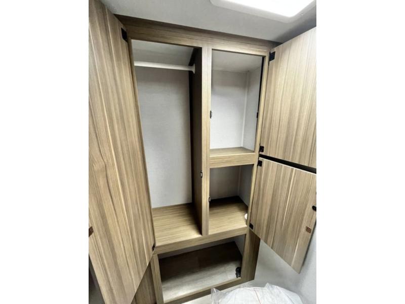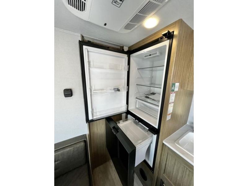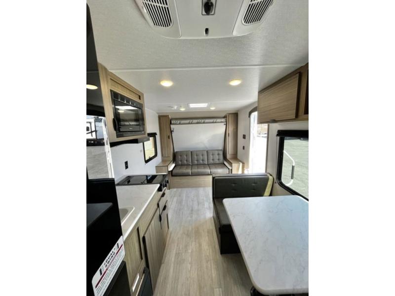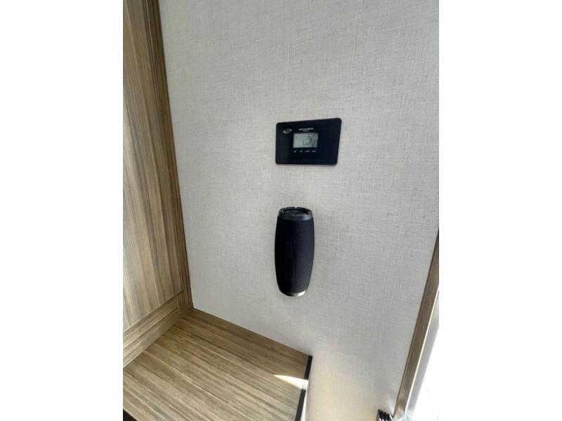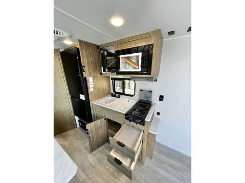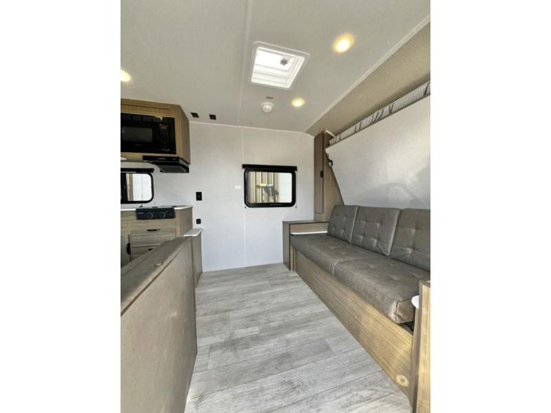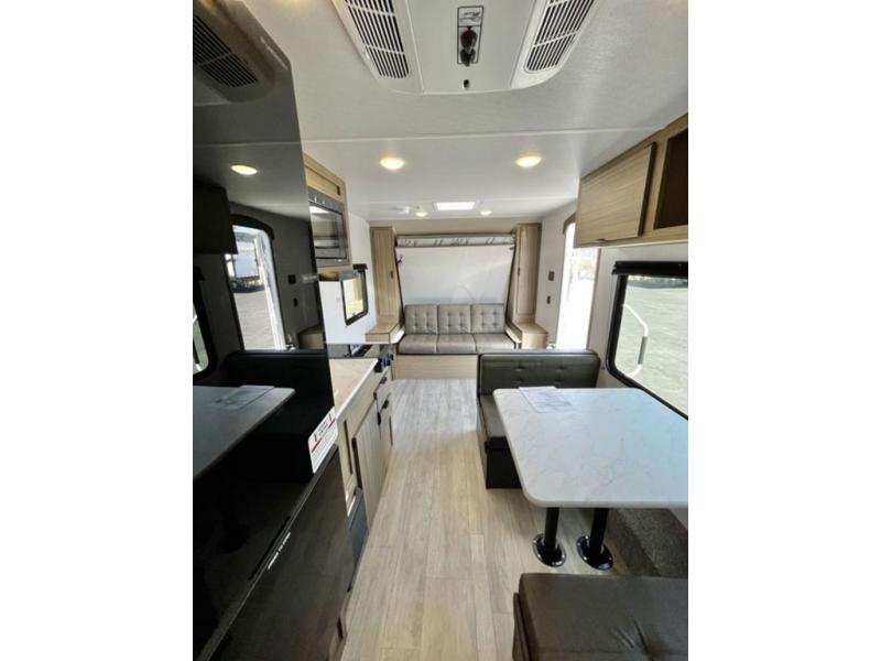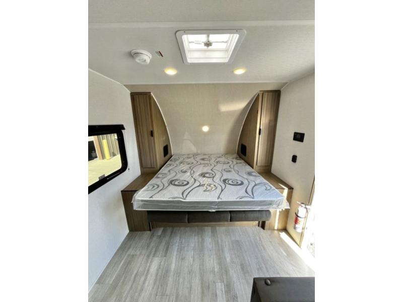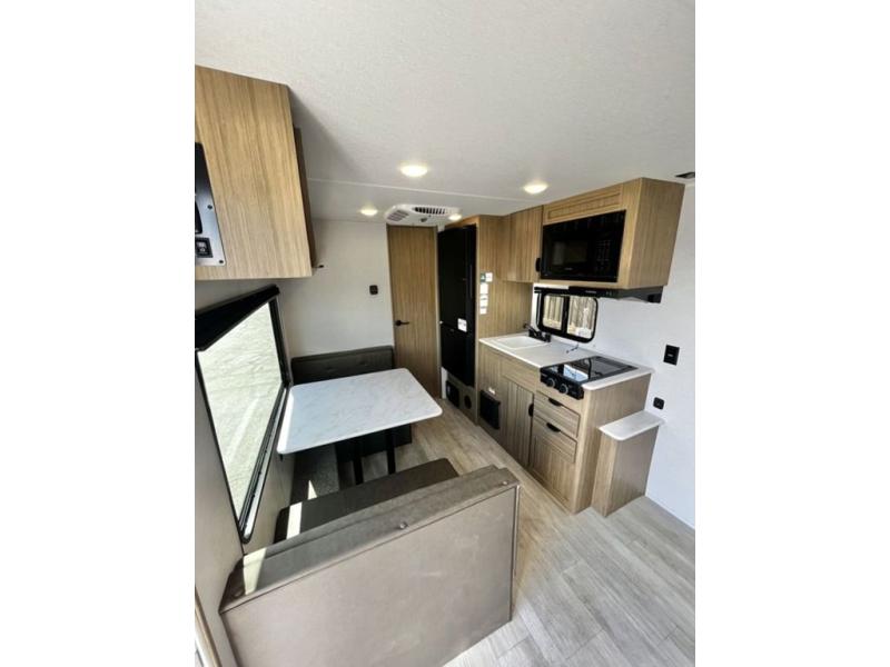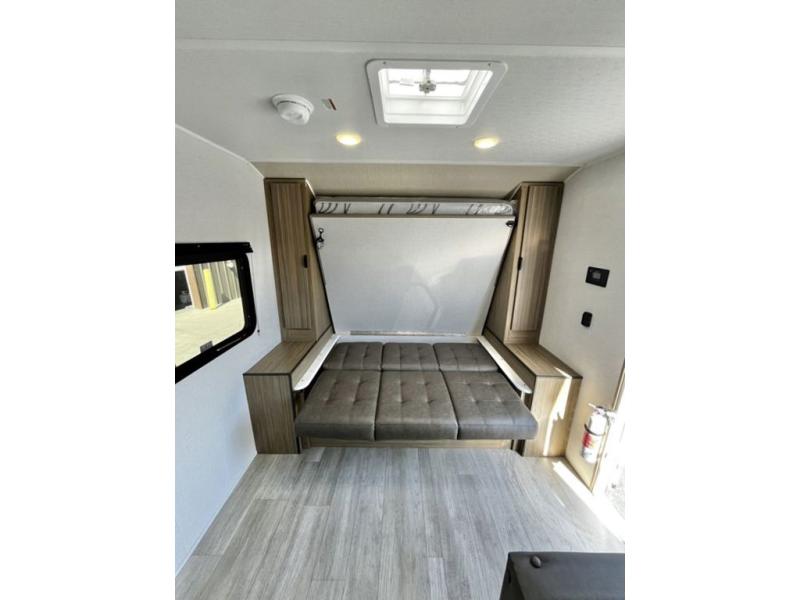 If versatile seating and sleeping arrangements sounds good to you, this travel trailer is the one! Since there is a front Murphy bed, you can get a great night's rest, and in the morning, fold the bed away to relax on the sofa. There are also dual wardrobes to keep your clothes tidy, along with overhead cabinets throughout for the rest of your camp gear. The bench dinette will provide a place to dine together if you don't want to sit outdoors under the 12' power awning, and the full rear bath will let you stay clean throughout your trip. You'll find a shower with a skylight, a toilet, medicine cabinet, and linen closet to keep towels close by. The oversized door for storage access is convenient when packing hiking gear, and you love having the 200W solar panel on this model for off-grid capabilities!