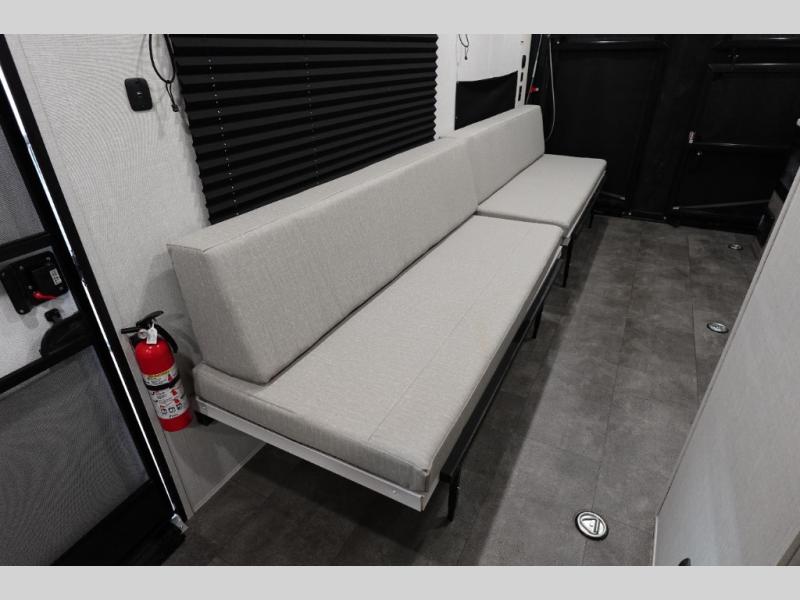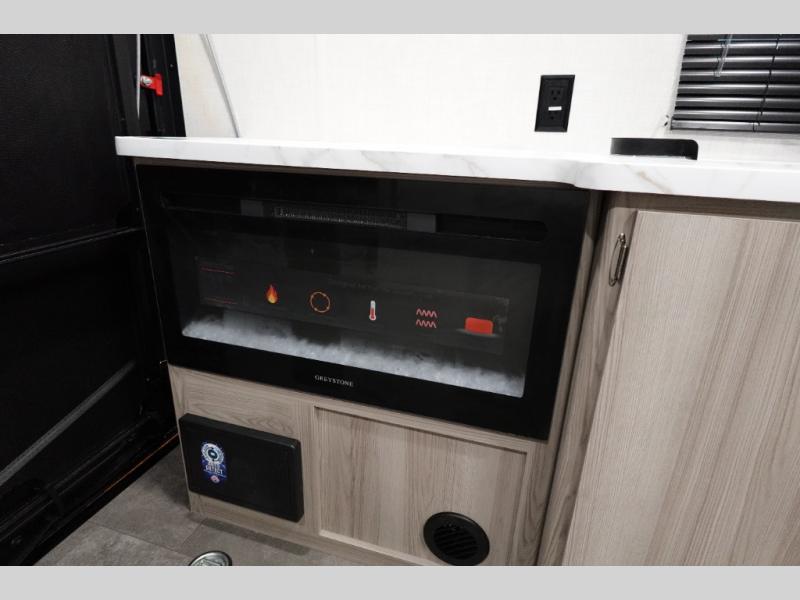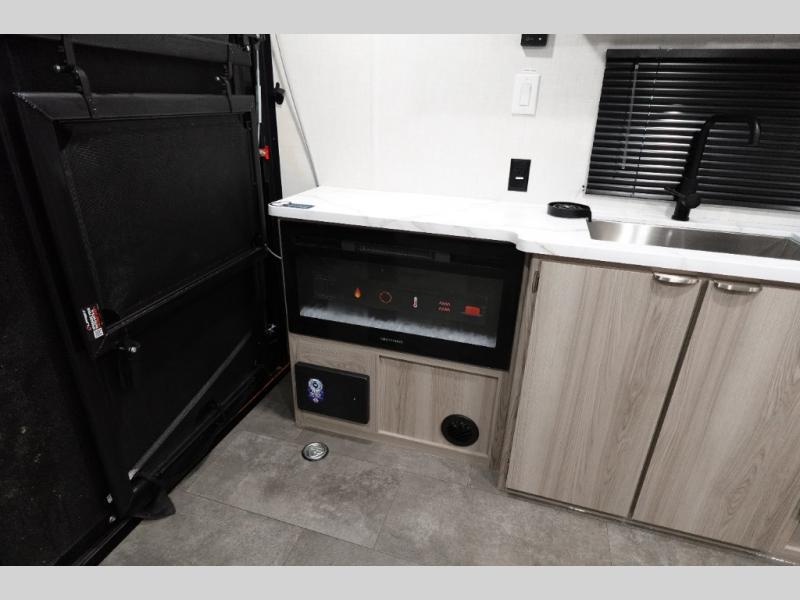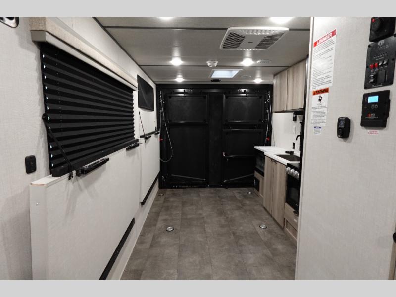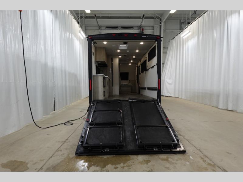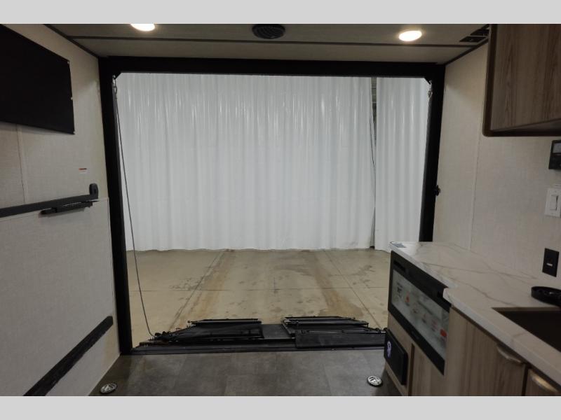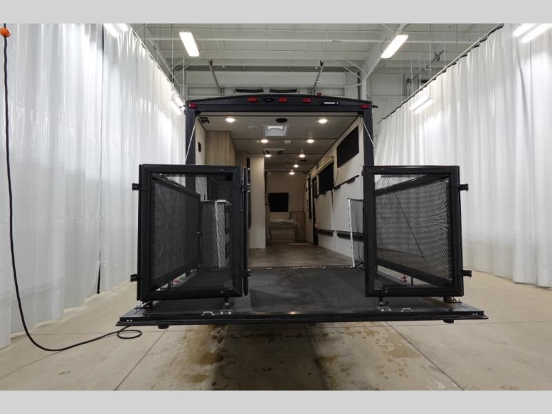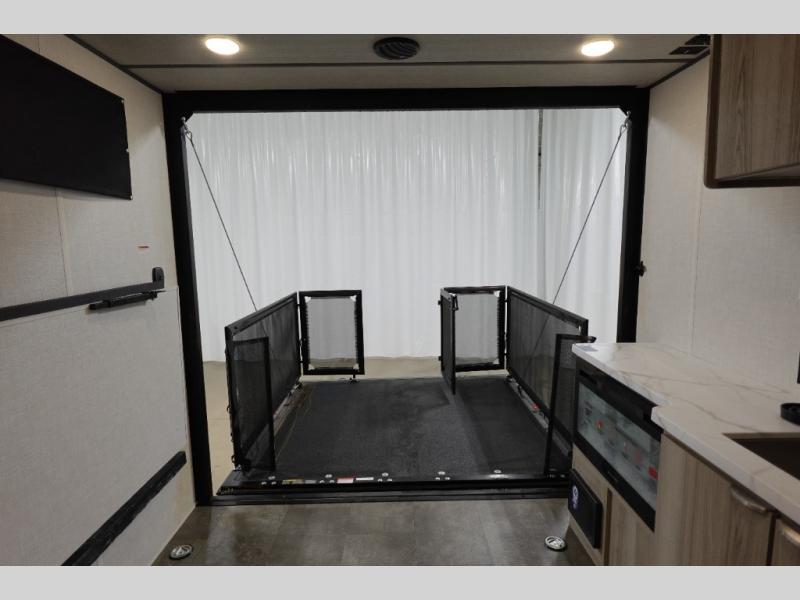 Be ready for anything with this toy hauler in tow! After you've unloaded your toys from the 3,000 lb. ramp door, enjoy the 1,500 lb. capacity patio with a cold drink in hand. There are two sofas inside the garage, plus a fireplace for those chilly nights. The chef of your group will have a full kitchen, complete with a microwave oven and a 12V refrigerator. The full bath includes a shower skylight that will not only let natural light in, but also provide more standing space. And check out the front bedroom with a queen bed and storage space for your belongings.