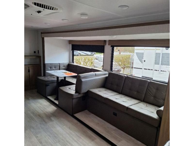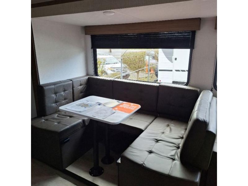 You're going to love the amount of interior space in this trailer thanks to the large slide out! Here, you'll enjoy relaxing on the Versa lounge and dining around the Versa U-shaped dinette, both of which can double as sleeping space. You can claim the front queen bed all to yourselves, and everyone will appreciate the full bath onboard. Head to the kitchen to prepare lunch on the three burner cooktop and microwave while you enjoy natural light from the skylight here.