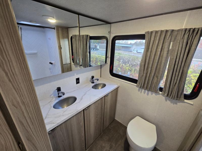 Camping is made easy in this travel trailer with a front private bedroom and a full rear bath with dual bath sink! There are dual bedroom wardrobes to keep your space neat and clean along with a king bed for more space to stretch out. Everyone can meet in the combined kitchen and living room to relax on the super U-lounge with a removable table while the chef of your group makes breakfast on the two burner cooktop. There is also a microwave oven for quick meals, plus a pantry and large under counter refrigerator for food storage!