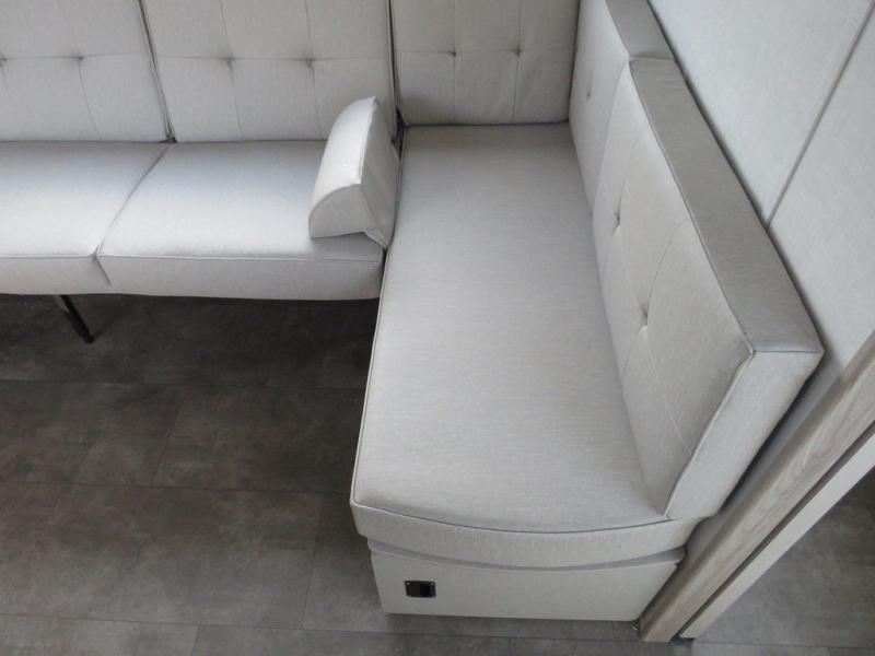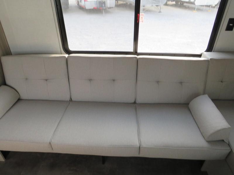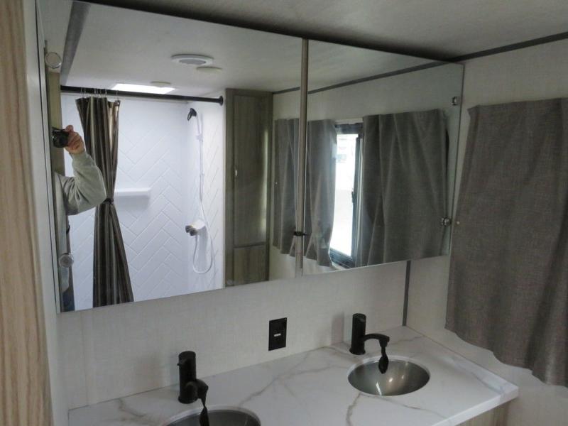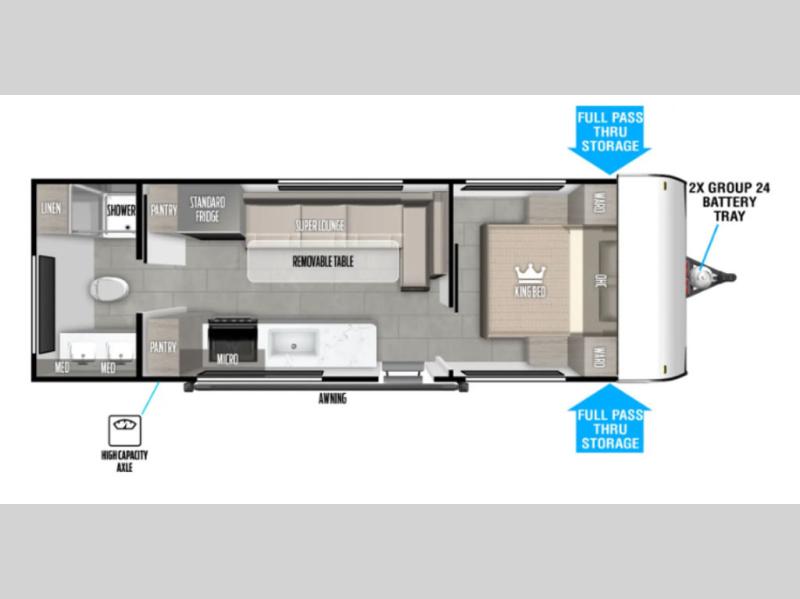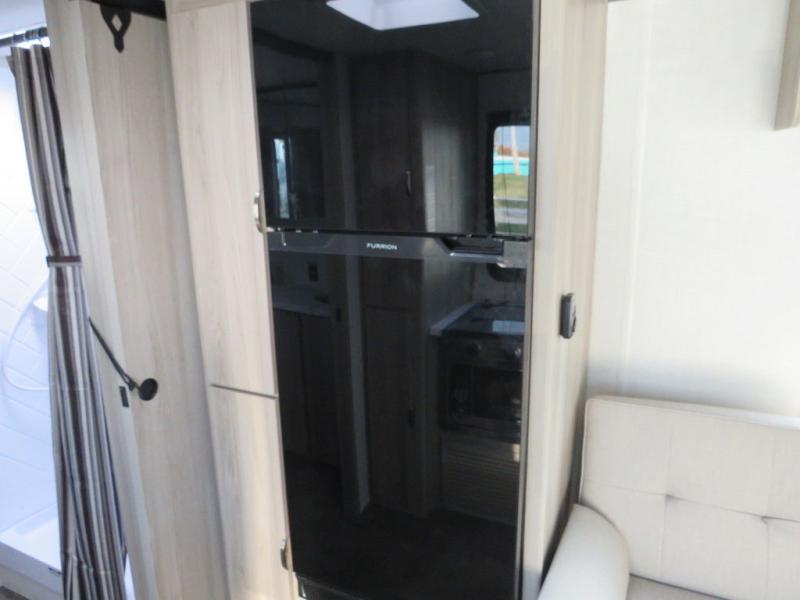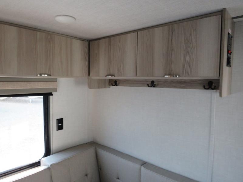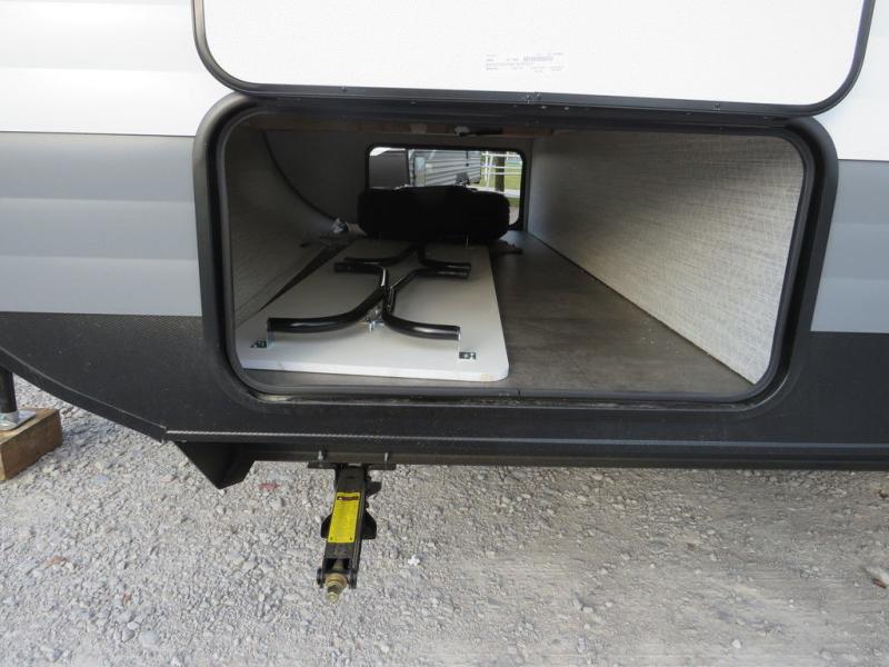 Camping is made easy in this travel trailer with a front private bedroom and a full rear bath with dual bath sink! There are dual bedroom wardrobes to keep your space neat and clean along with a king bed for more space to stretch out. Everyone can meet in the combined kitchen and living room to relax on the super U-lounge with a removable table while the chef of your group makes breakfast on the two burner cooktop. There is also a microwave oven for quick meals, plus a pantry and large under counter refrigerator for food storage!