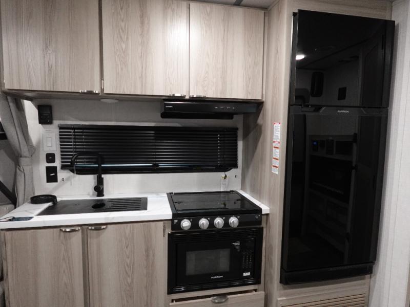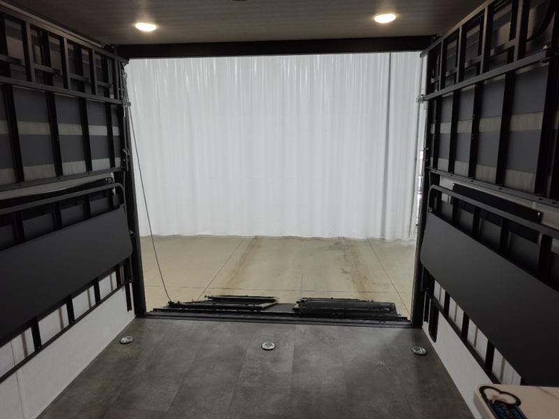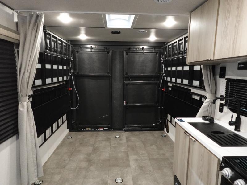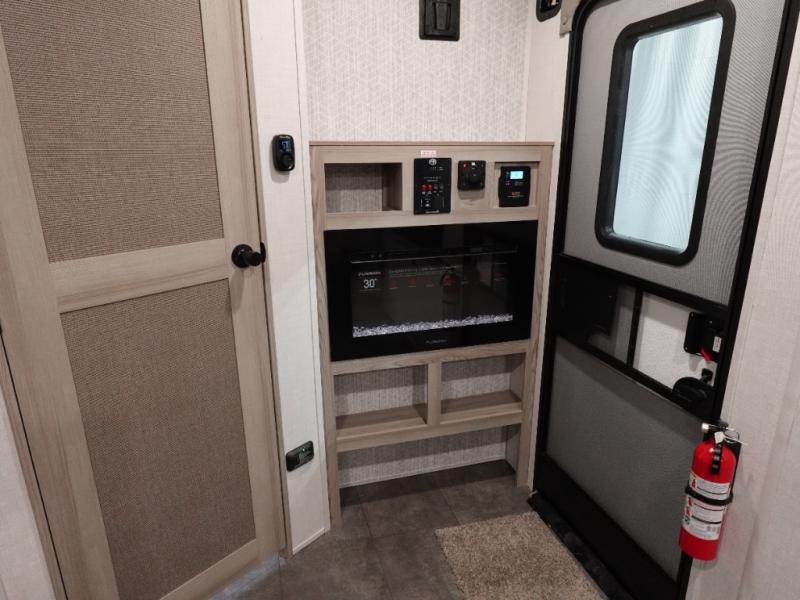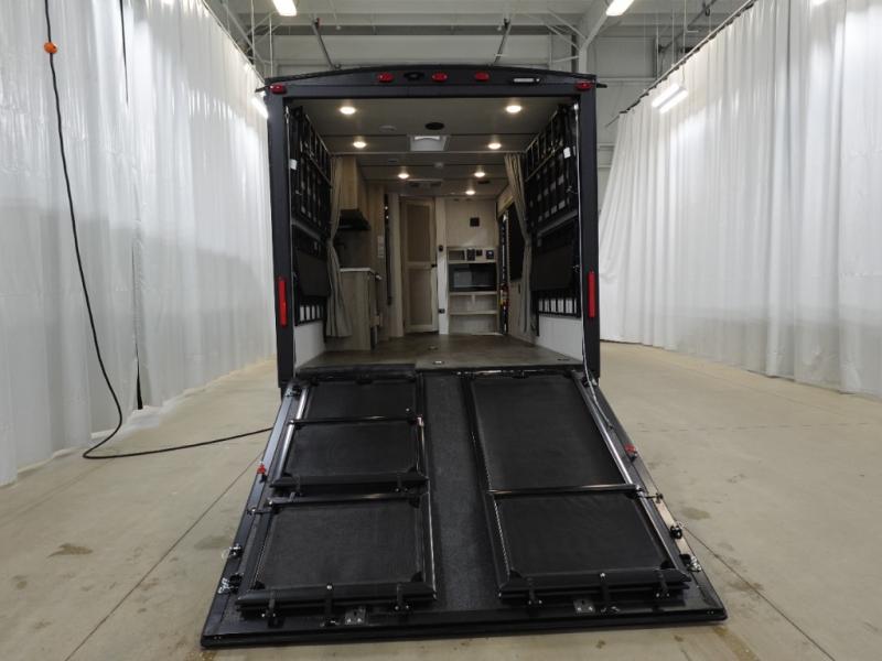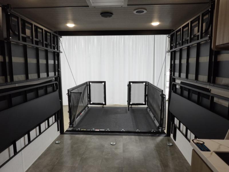 This toy hauler is packed to the Max with standard features and comforts. Once you unload your toys from the garage with a total of 13' 4" cargo space, you can enjoy lunch at the sofa/sleepers with a table. The kitchen includes a 12V refrigerator, and everyone will love the fireplace for a more at-home feel. Head through the bath to enjoy the front master bedroom with a king bed and dual wardrobes for your clothes!