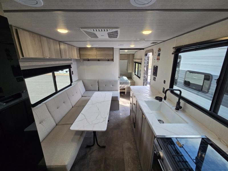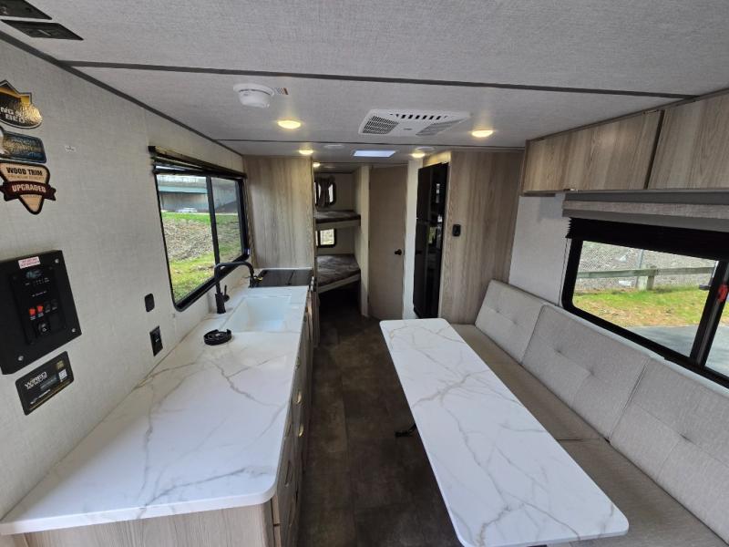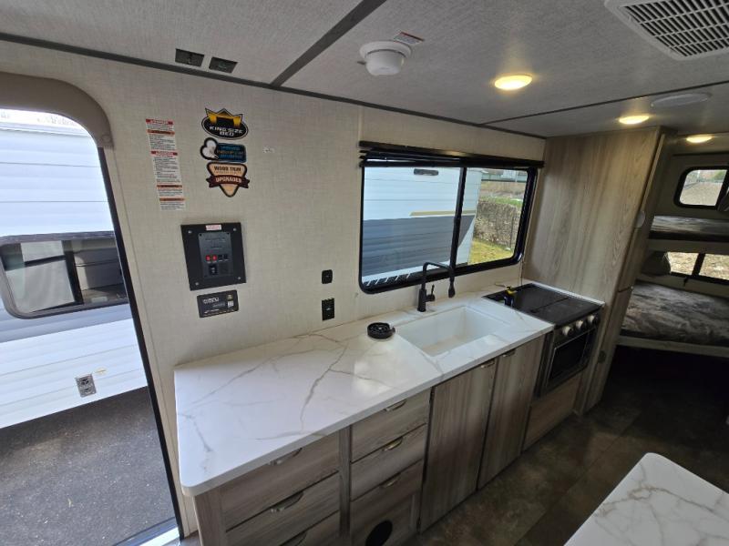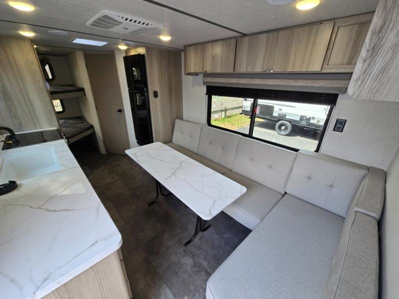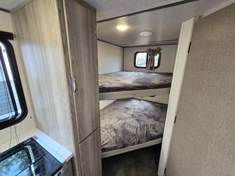 Camping is made easy in this travel trailer with more sleeping space and lots of comforts! The kids or your guests will enjoy the double-size bunks in the back, along with the full bath close by for easy nighttime use. You'll have the front private bedroom with a king bed all to yourselves, and there are dual bedroom wardrobes to keep your space neat and clean. Everyone can meet in the combined kitchen and living room to relax on the super U-lounge with a removable table while the chef of your group makes breakfast on the two burner cooktop. There is also a microwave oven for quick meals, plus a pantry and large under counter refrigerator for food storage!