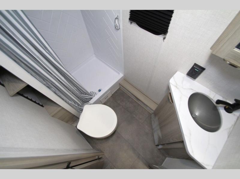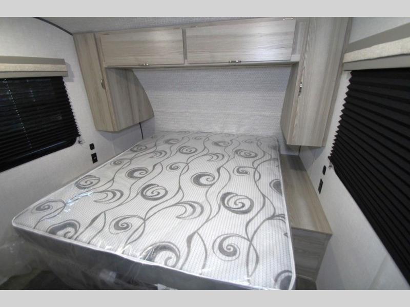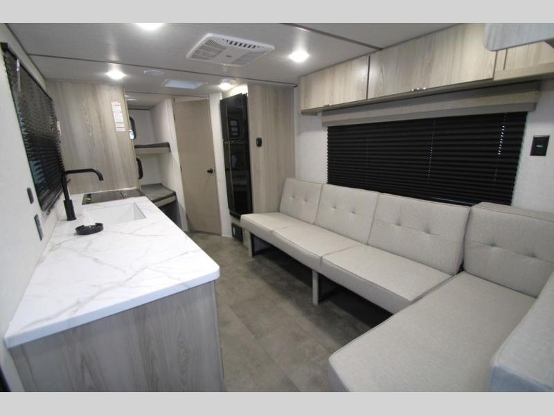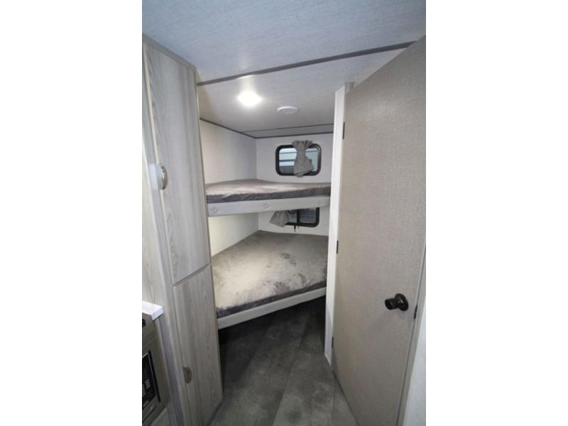 Camping is made easy in this travel trailer with more sleeping space and lots of comforts! The kids or your guests will enjoy the double-size bunks in the back, along with the full bath close by for easy nighttime use. You'll have the front private bedroom with a king bed all to yourselves, and there are dual bedroom wardrobes to keep your space neat and clean. Everyone can meet in the combined kitchen and living room to relax on the super U-lounge with a removable table while the chef of your group makes breakfast on the two burner cooktop. There is also a microwave oven for quick meals, plus a pantry and large under counter refrigerator for food storage!