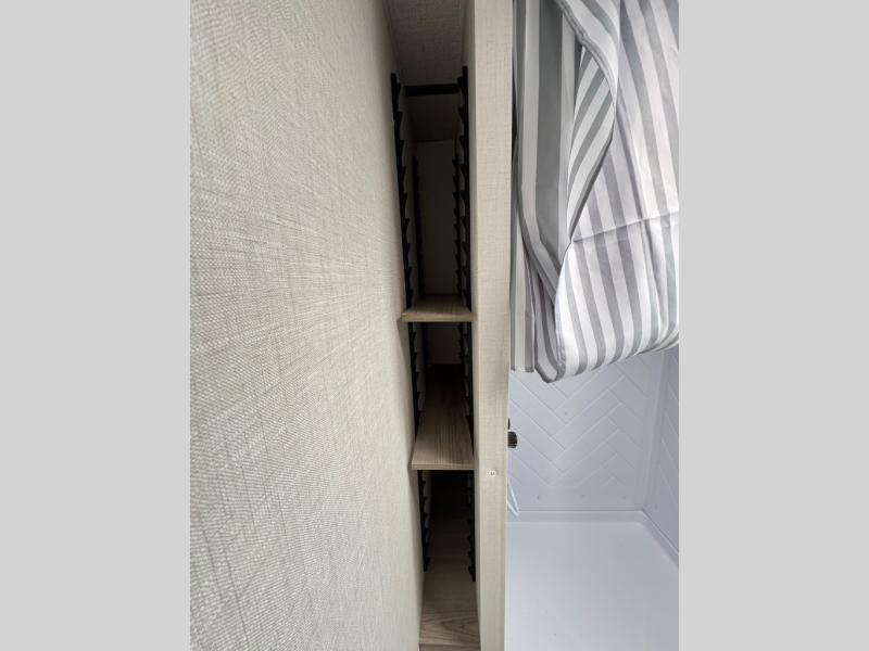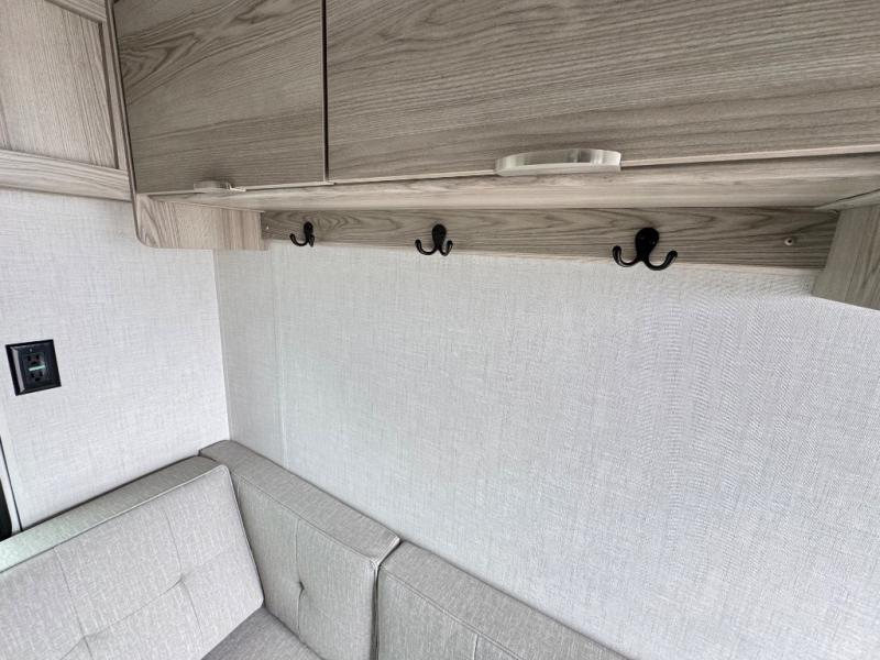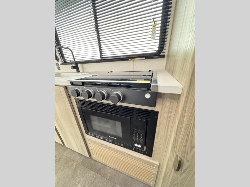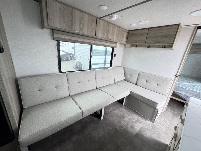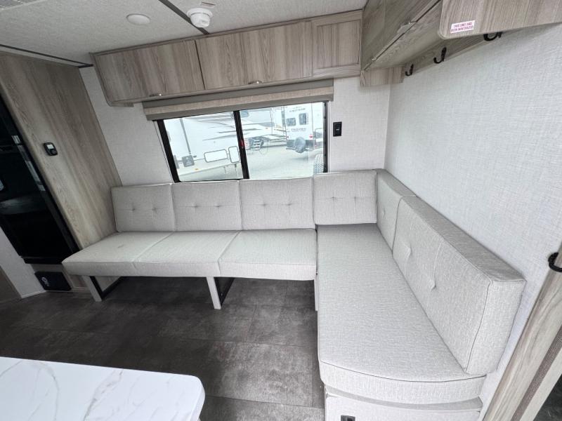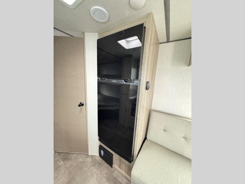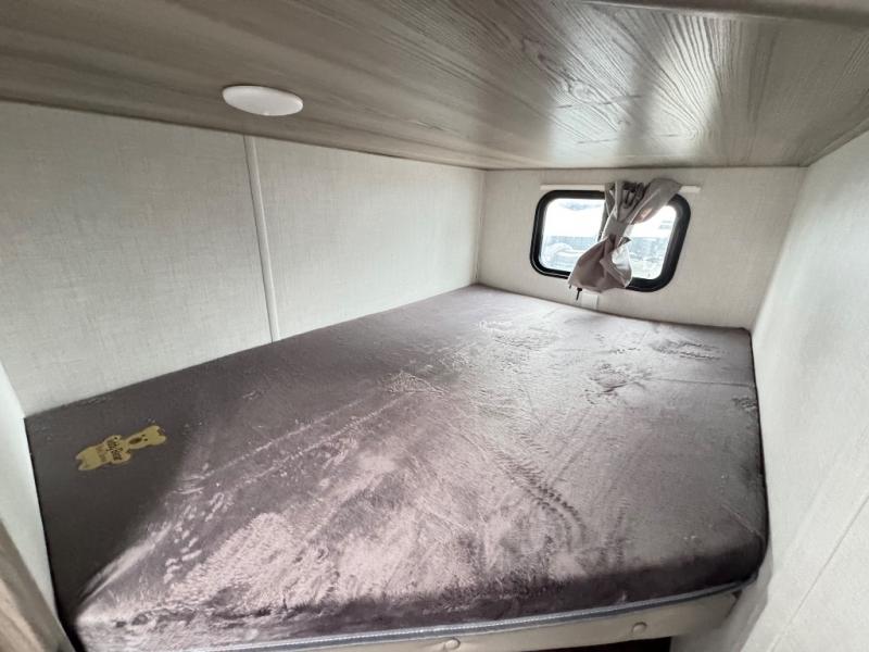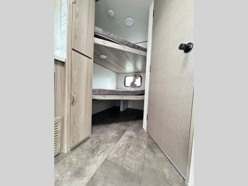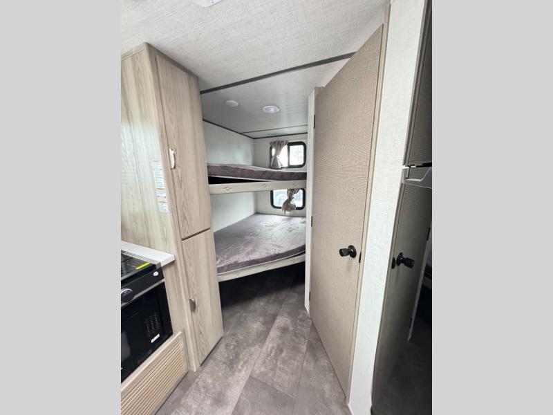 Camping is made easy in this travel trailer with more sleeping space and lots of comforts! The kids or your guests will enjoy the double-size bunks in the back, along with the full bath close by for easy nighttime use. You'll have the front private bedroom with a king bed all to yourselves, and there are dual bedroom wardrobes to keep your space neat and clean. Everyone can meet in the combined kitchen and living room to relax on the super U-lounge with a removable table while the chef of your group makes breakfast on the two burner cooktop. There is also a microwave oven for quick meals, plus a pantry and large under counter refrigerator for food storage!