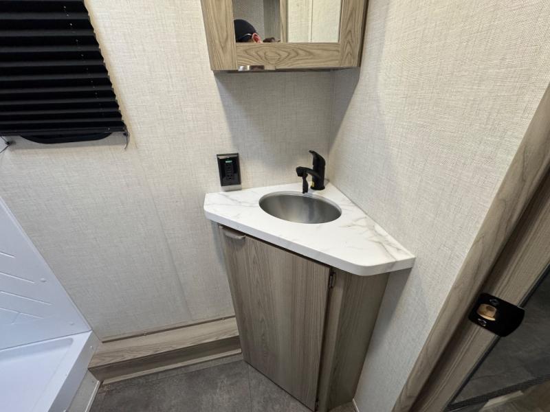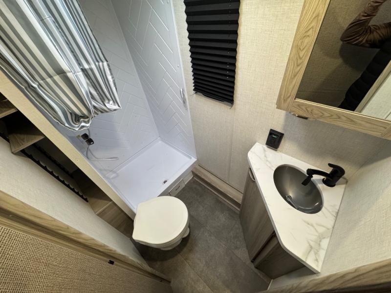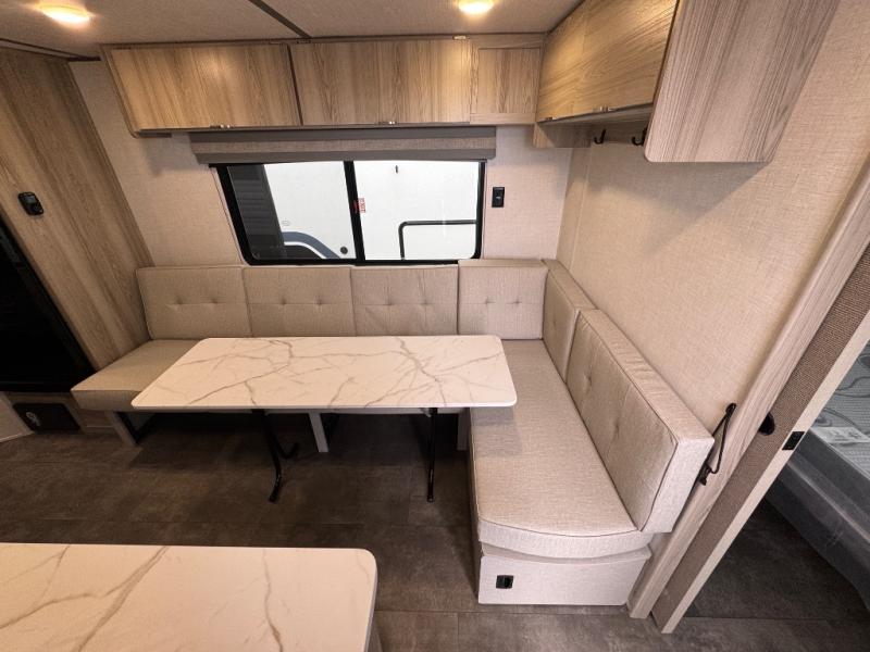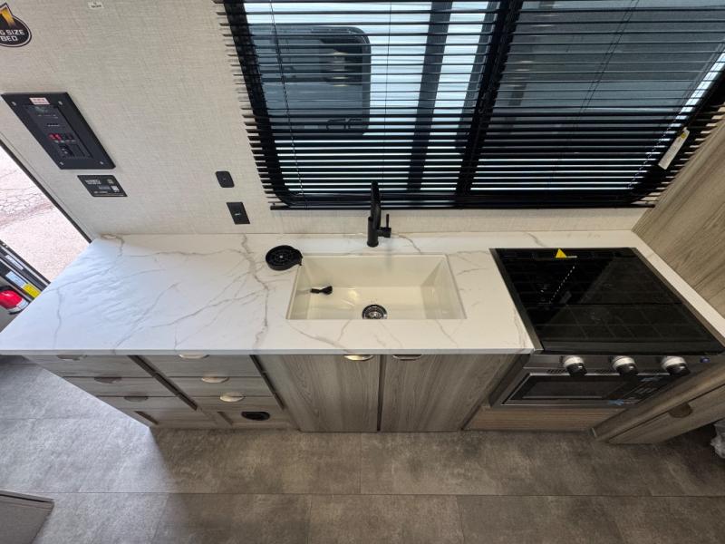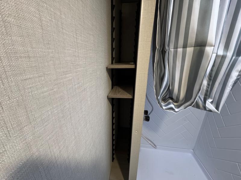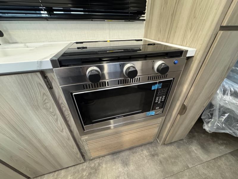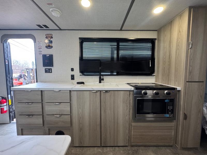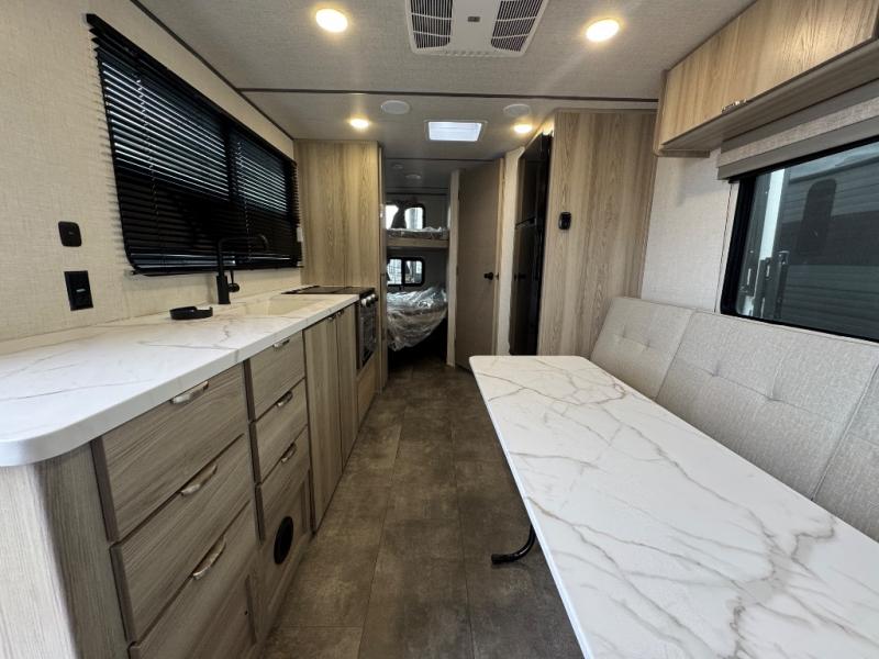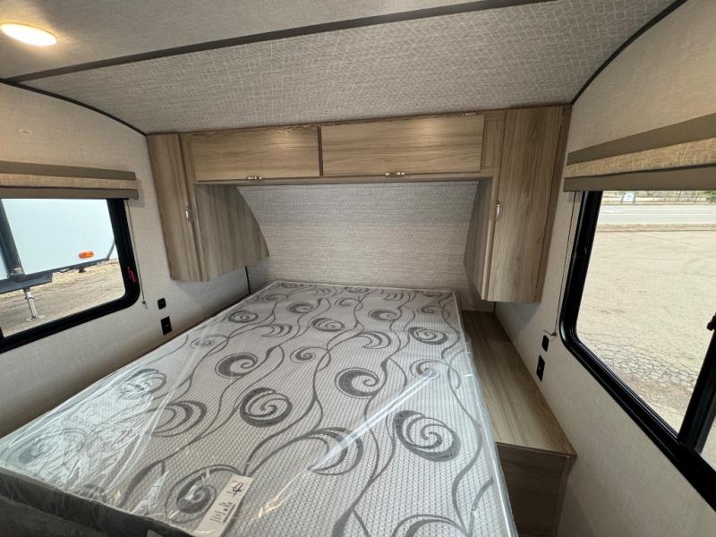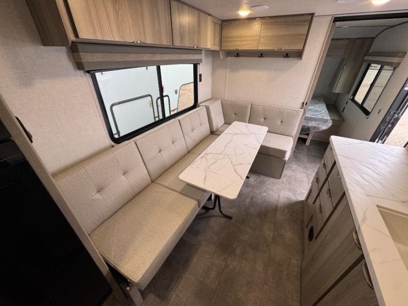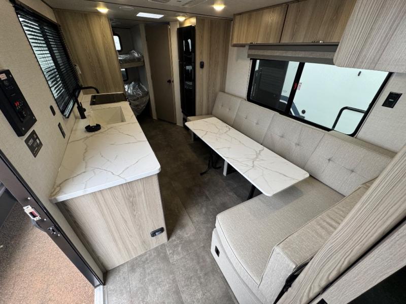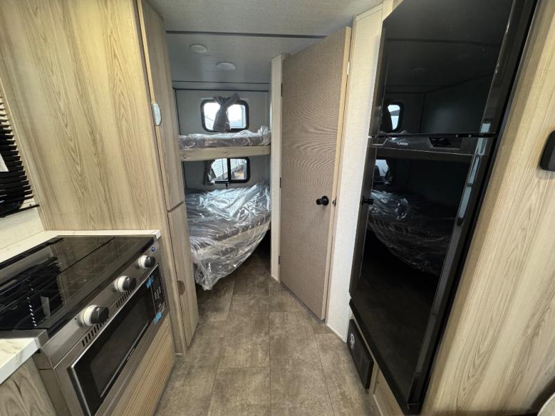 Camping is made easy in this travel trailer with more sleeping space and lots of comforts! The kids or your guests will enjoy the double-size bunks in the back, along with the full bath close by for easy nighttime use. You'll have the front private bedroom with a king bed all to yourselves, and there are dual bedroom wardrobes to keep your space neat and clean. Everyone can meet in the combined kitchen and living room to relax on the super U-lounge with a removable table while the chef of your group makes breakfast on the two burner cooktop. There is also a microwave oven for quick meals, plus a pantry and large under counter refrigerator for food storage!