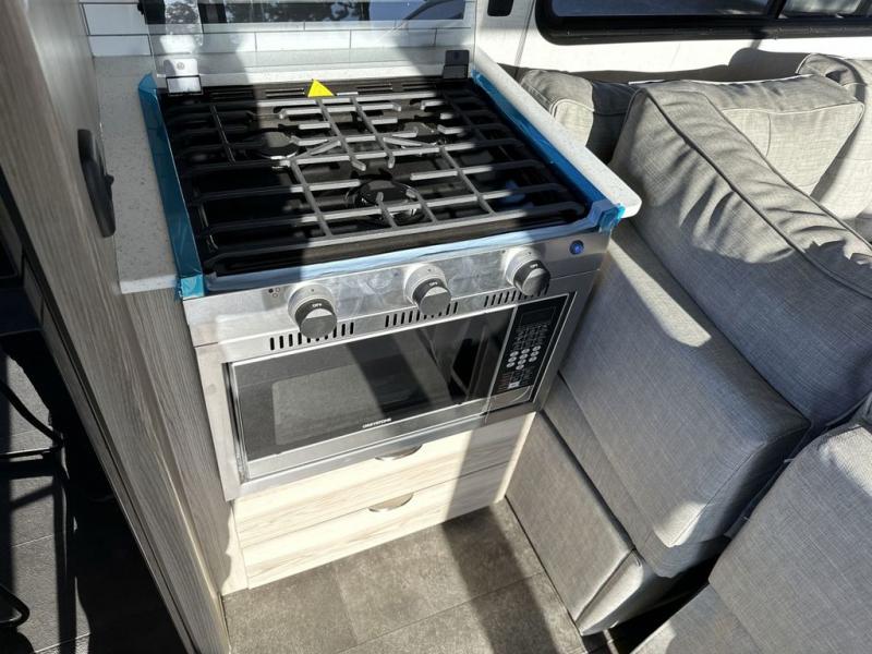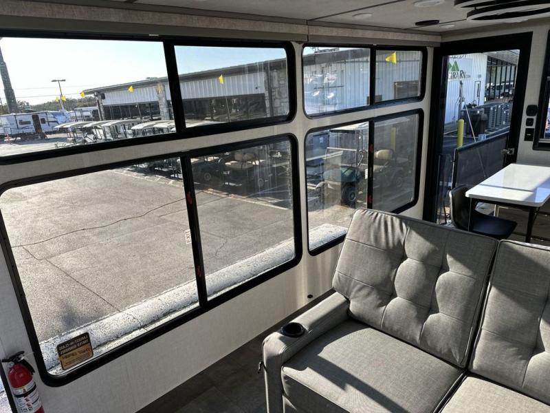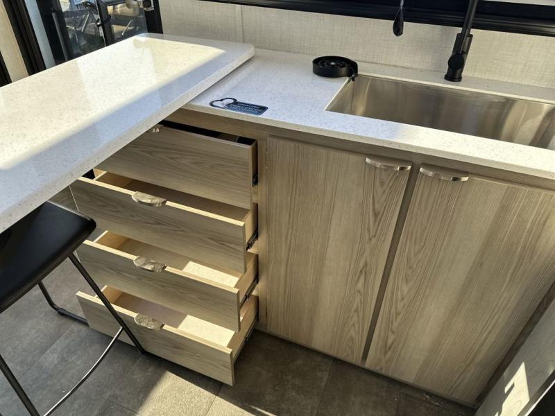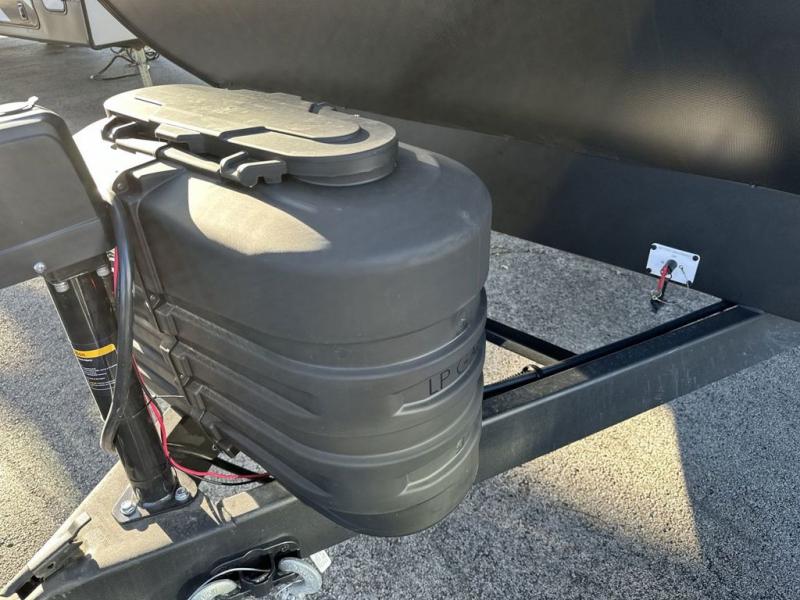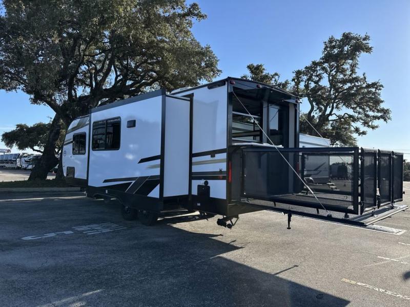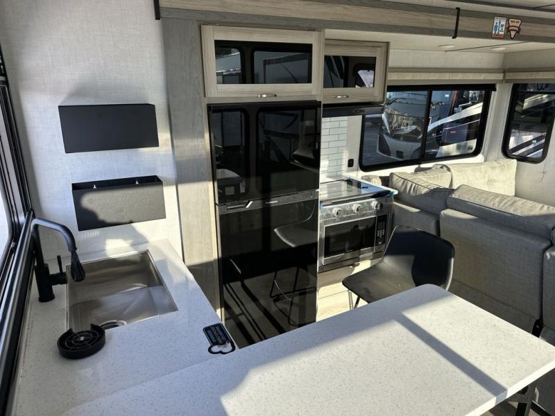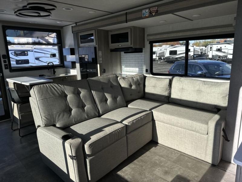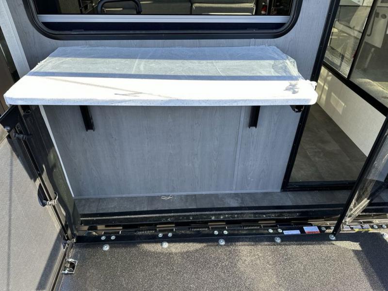 You'll love camping in this spacious trailer for three to four! There is a rear ramp door/patio so you can sit outdoors in your camp chairs, or you can sit under the side patio awning. The full kitchen includes a bar top with stools, a large sink, and a standard refrigerator to store perishables. A super lounge in the main living area will let you relax after a day of outdoor play, and the full bath will let you freshen up before bed. Speaking of bed, you'll be met with a king bed in the front bedroom for added comfort!