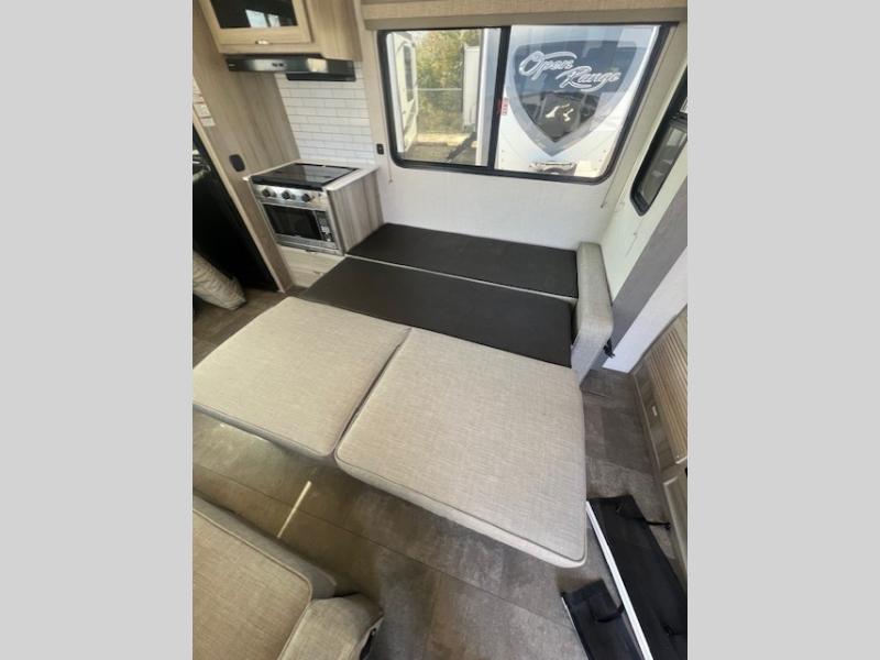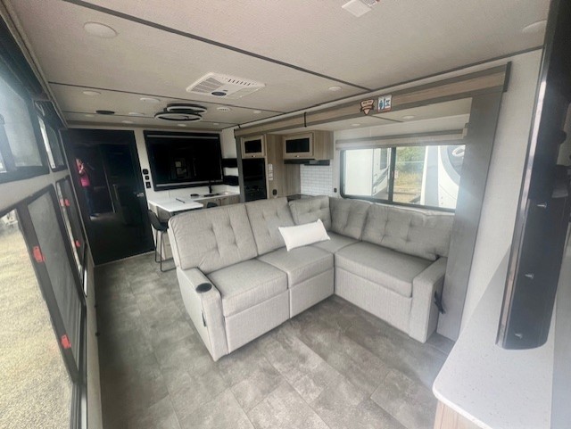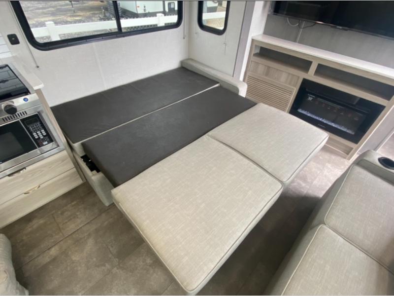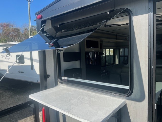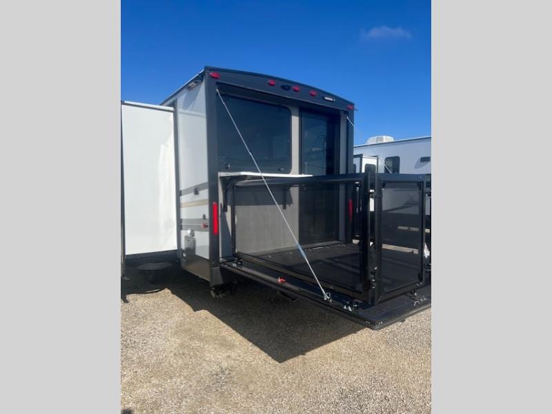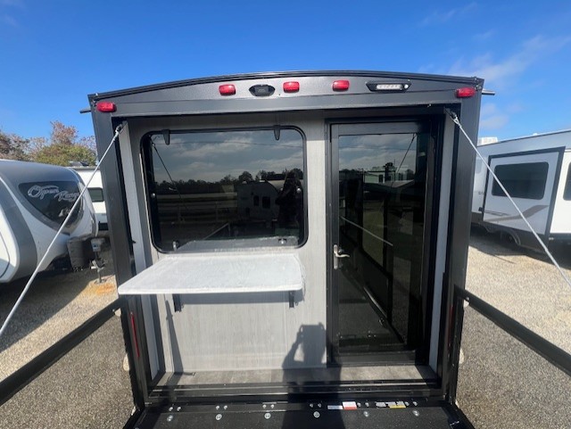This versatile cargo trailer is one to remember! There is a ramp door that converts to a patio, a large slide out for more interior space, plus a front private bedroom just like at home. Your crew can relax on the super lounge across from the entertainment center or head outdoors to visit under the awning. The chef of your group will love cooking in the kitchen with ample counter space, including a bar top with two stools. There is also a kitchen bar window that will allow the cook to visit with those sitting on the patio, and if you need to bring bicycles along, you can easily load them in through the ramp door!