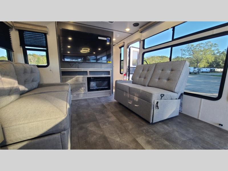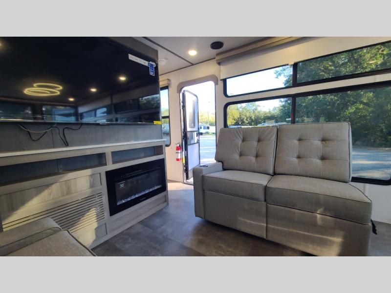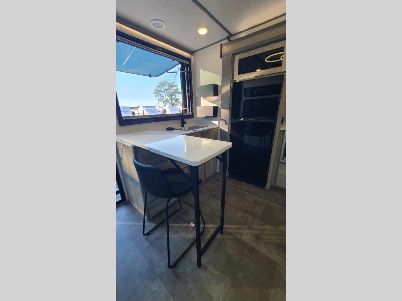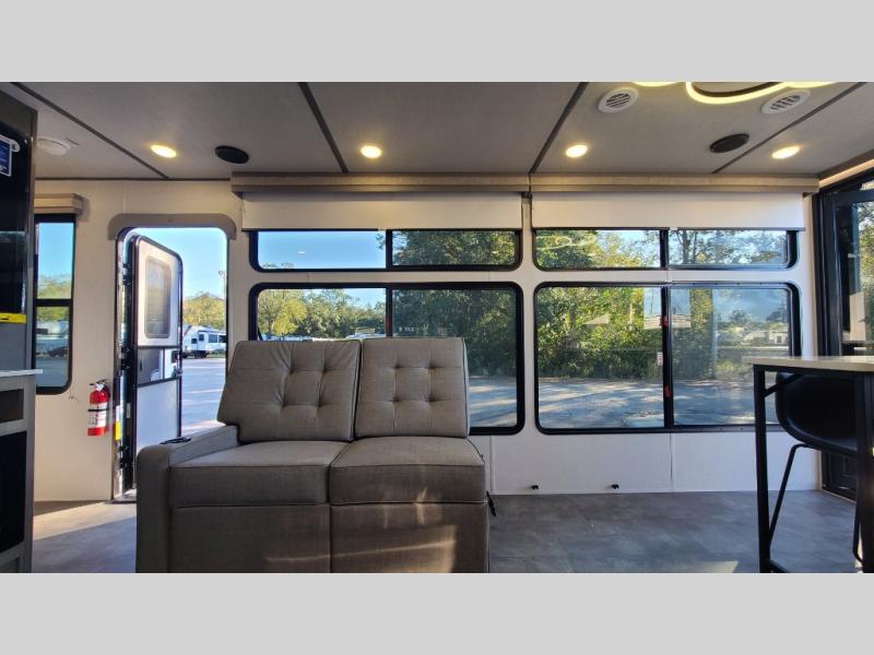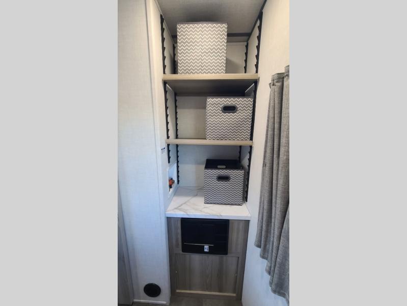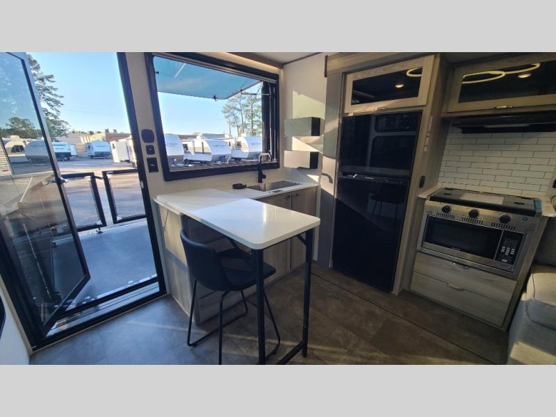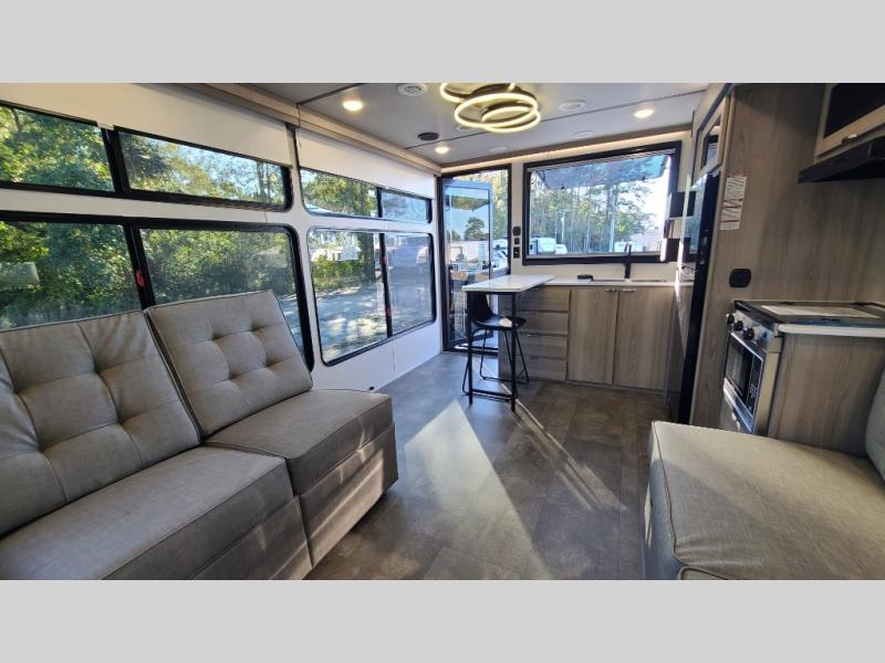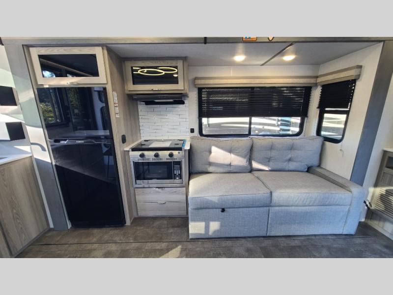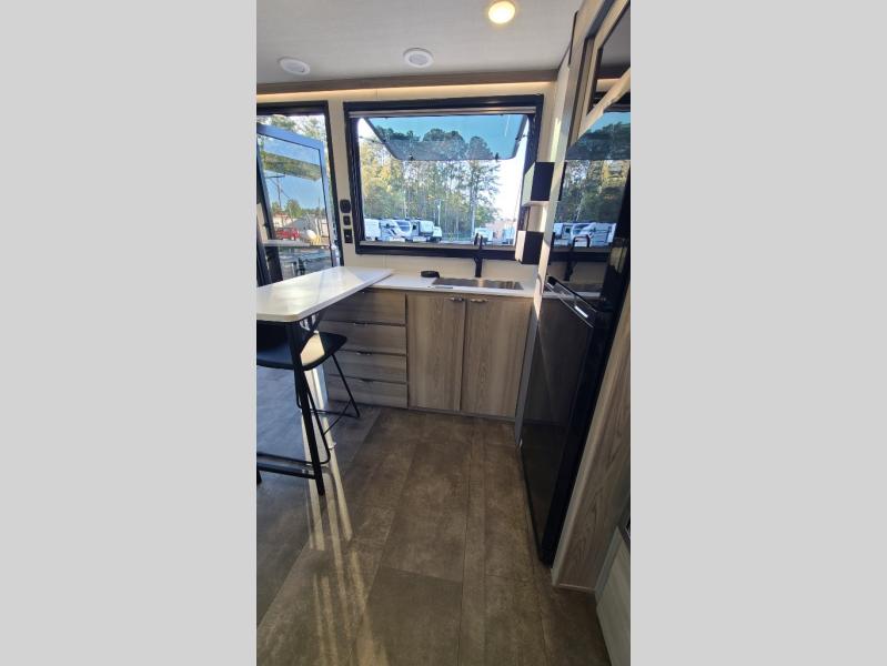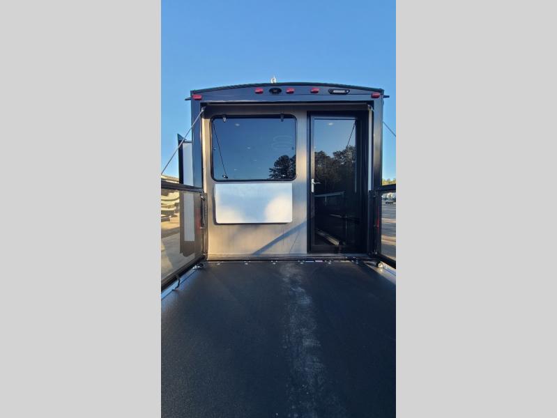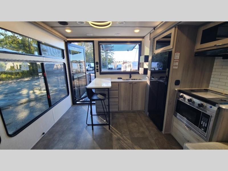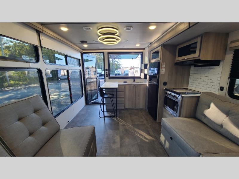 You'll love camping in this spacious trailer for three to four! There is a rear ramp door/patio so you can sit outdoors in your camp chairs, or you can sit under the side patio awning. The full kitchen includes a bar top with stools, a large sink, and a standard refrigerator to store perishables. A super lounge in the main living area will let you relax after a day of outdoor play, and the full bath will let you freshen up before bed. Speaking of bed, you'll be met with a king bed in the front bedroom for added comfort!
