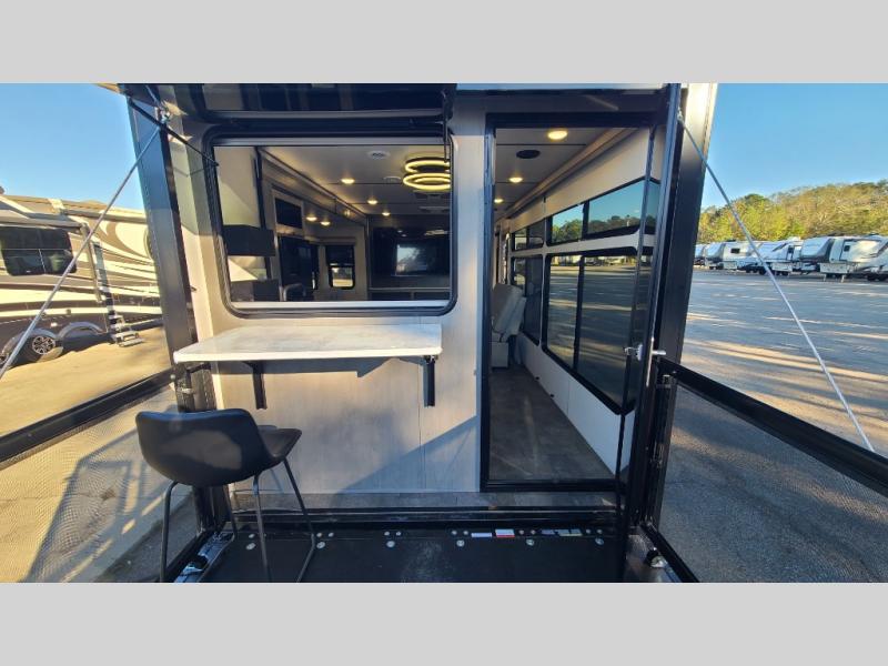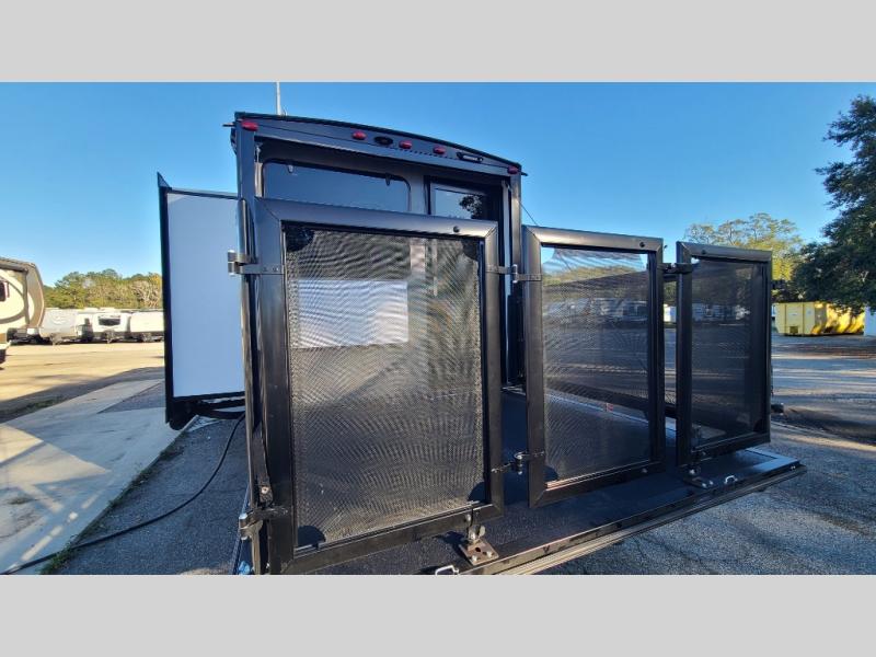 There is a rear ramp door/patio so you can sit outdoors in your camp chairs.