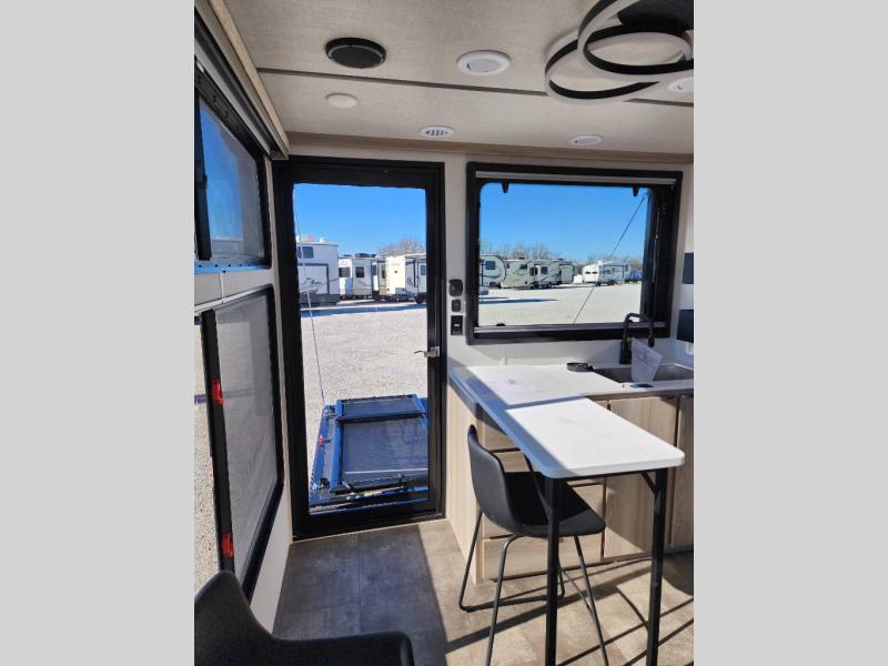 This versatile cargo trailer is one to remember! There is a ramp door that converts to a patio, a large slide out for more interior space, plus a front private bedroom just like at home. Your crew can relax on the super lounge across from the entertainment center or head outdoors to visit under the awning. The chef of your group will love cooking in the kitchen with ample counter space, including a bar top with two stools. There is also a kitchen bar window that will allow the cook to visit with those sitting on the patio, and if you need to bring bicycles along, you can easily load them in through the ramp door!