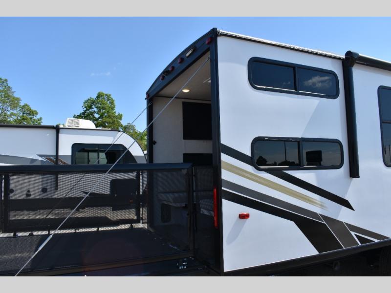 Take your adventures to the max in this MAX toy hauler with more space and features! Unload your dirt bikes from the 14' garage, then convert this space to the 1,500 lb. capacity patio. This model includes two sofa sleepers with a table to dine and let guests sleep over. The main living area will feel more like home with a fireplace, and the full kitchen will allow you to prepare meals for your whole group. If you enjoy cooking outdoors then you will love the outdoor griddle and refrigerator, plus there is an 18' power awning here for shade. After dinner is cleaned up, head to the front private bedroom for a great night's rest and plan to do it all over again tomorrow!