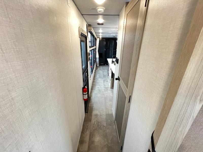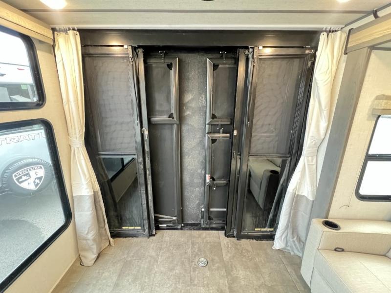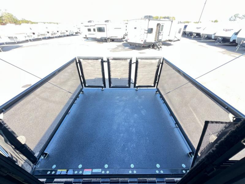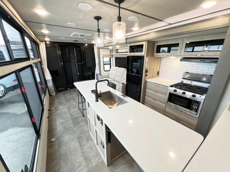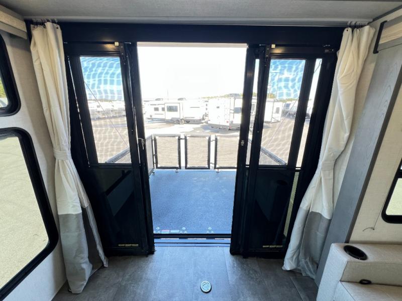 It will be so easy to enjoy camping trips in this spacious toy hauler for two! There are 1,500 lb. tie-downs to keep your toys secure during transport, and the ramp door will make it easier than ever to unload. Once the bikes are out, you can then set up the 1,500 lb. capacity patio! The main living area is made cozy thanks to the chaise lounge and theater seating directly across from the TV prep and movie projector with premium sound. The chef of your group will love the large island peninsula for more prep space plus the entire unit is carpet free for easy cleaning. And don't overlook the front private bedroom with a king bed plus a full bath close by to freshen up!