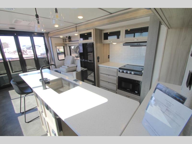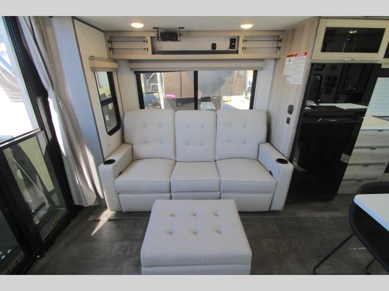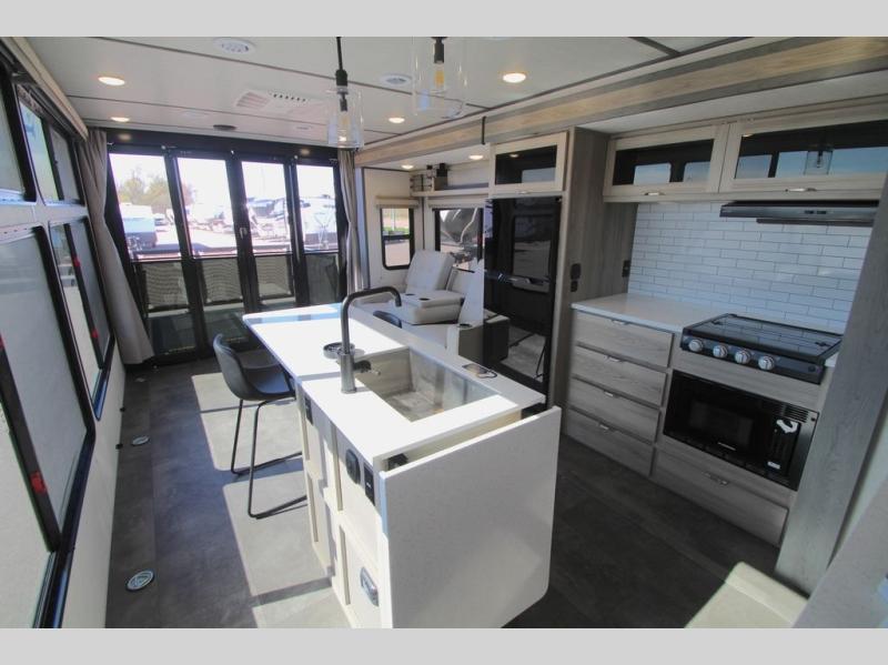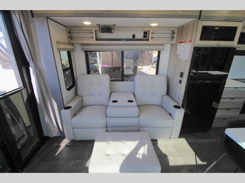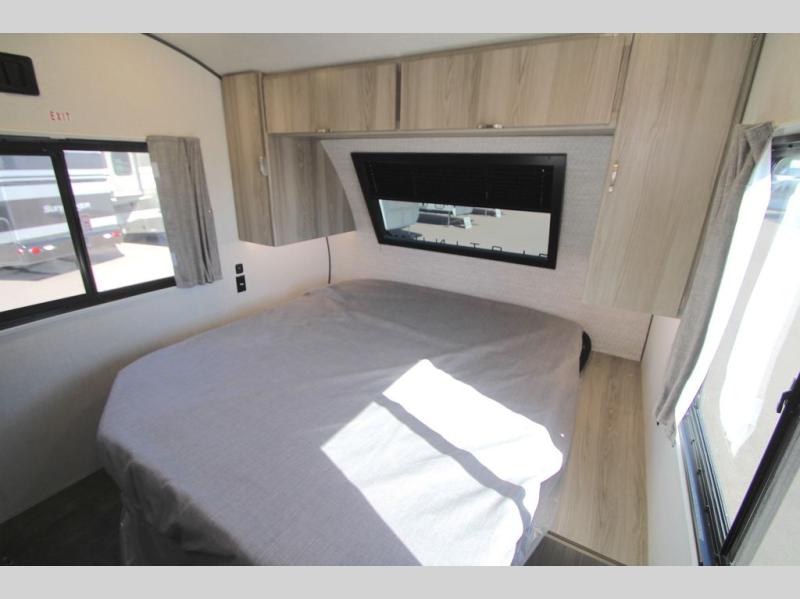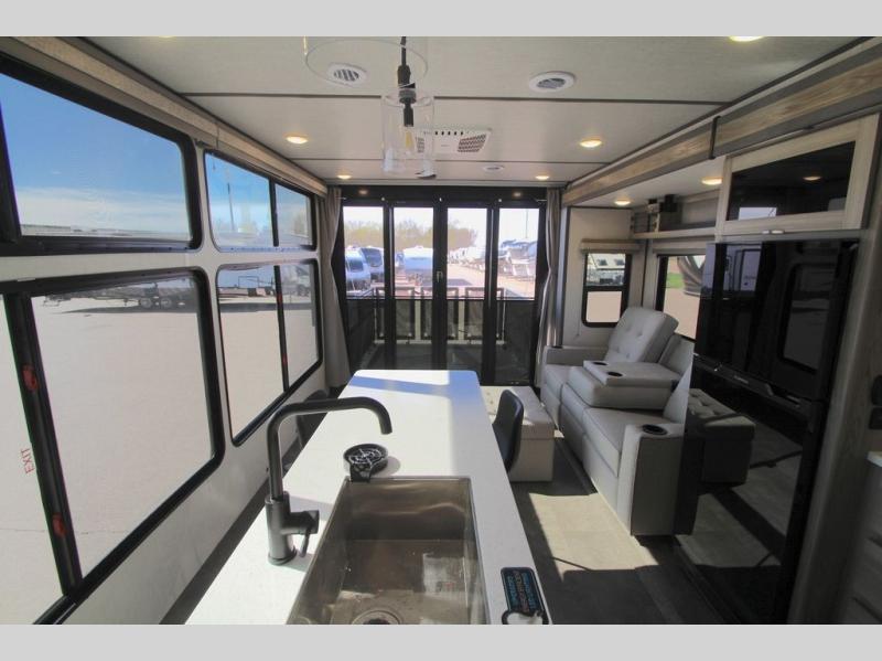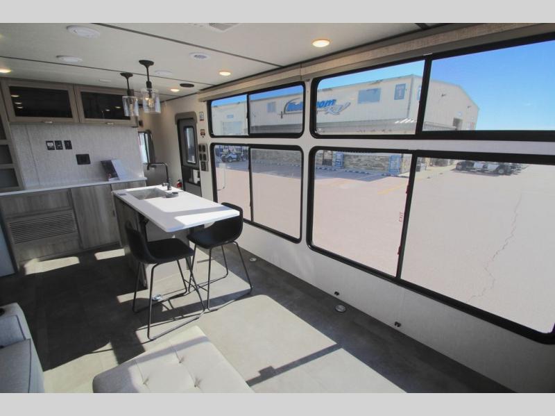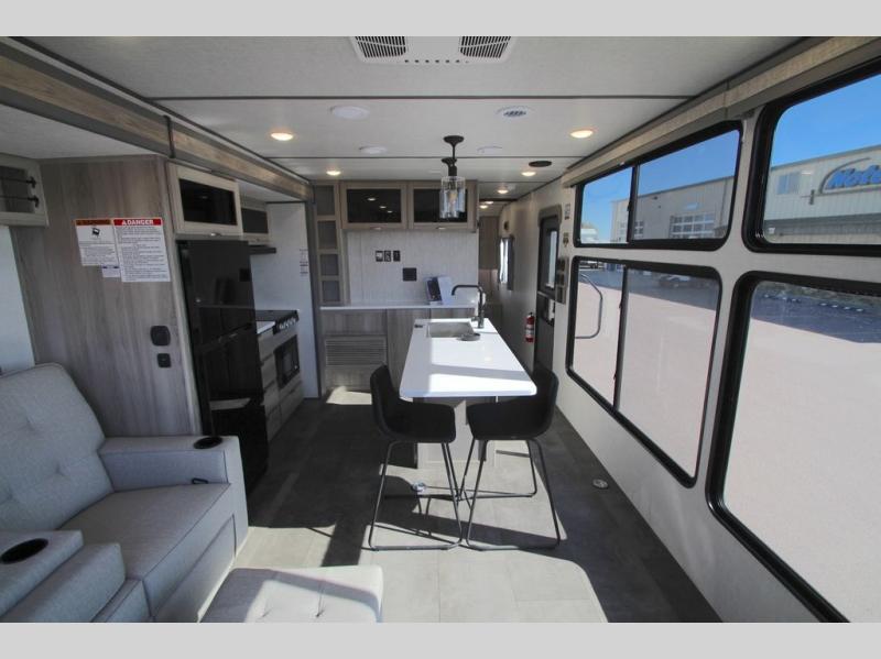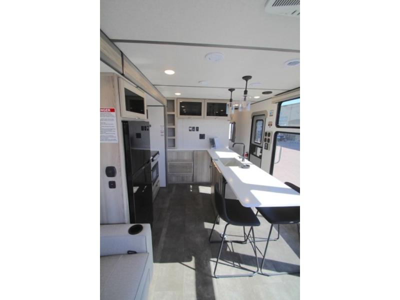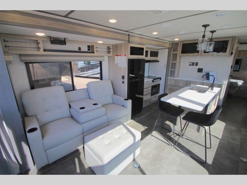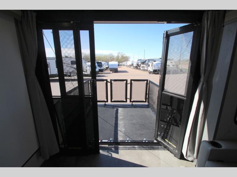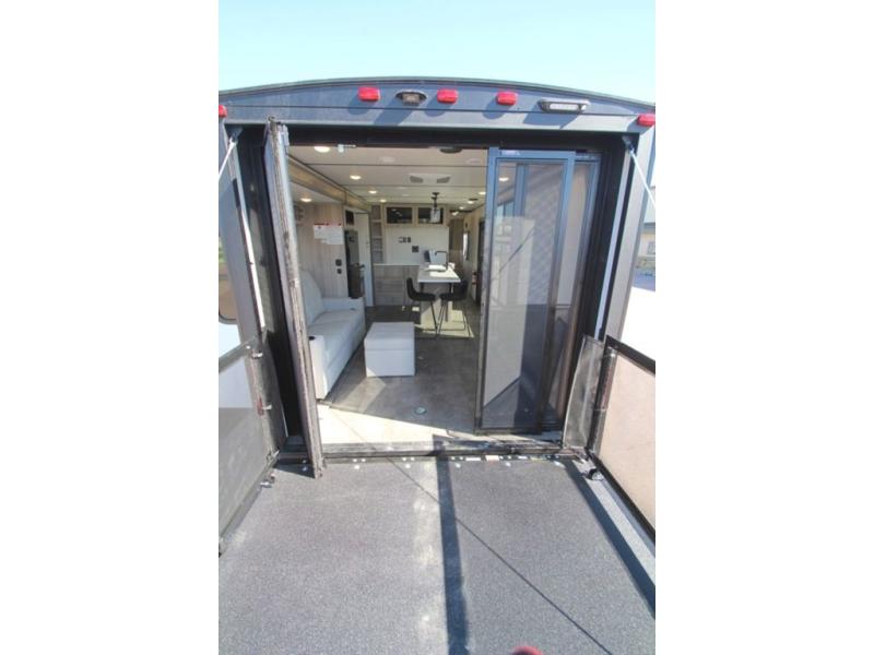 It will be so easy to enjoy camping trips in this spacious toy hauler for two! There are 1,500 lb. tie-downs to keep your toys secure during transport, and the ramp door will make it easier than ever to unload. Once the bikes are out, you can then set up the 1,500 lb. capacity patio! The main living area is made cozy thanks to the chaise lounge and theater seating directly across from the TV prep and movie projector with premium sound. The chef of your group will love the large island peninsula for more prep space plus the entire unit is carpet free for easy cleaning. And don't overlook the front private bedroom with a king bed plus a full bath close by to freshen up!