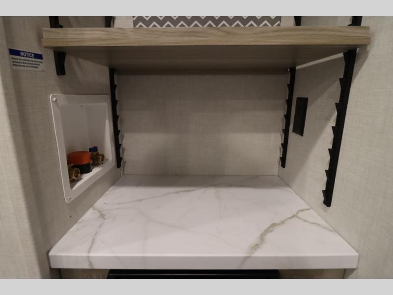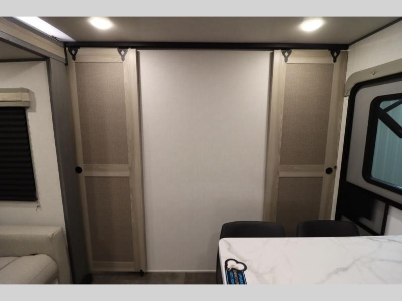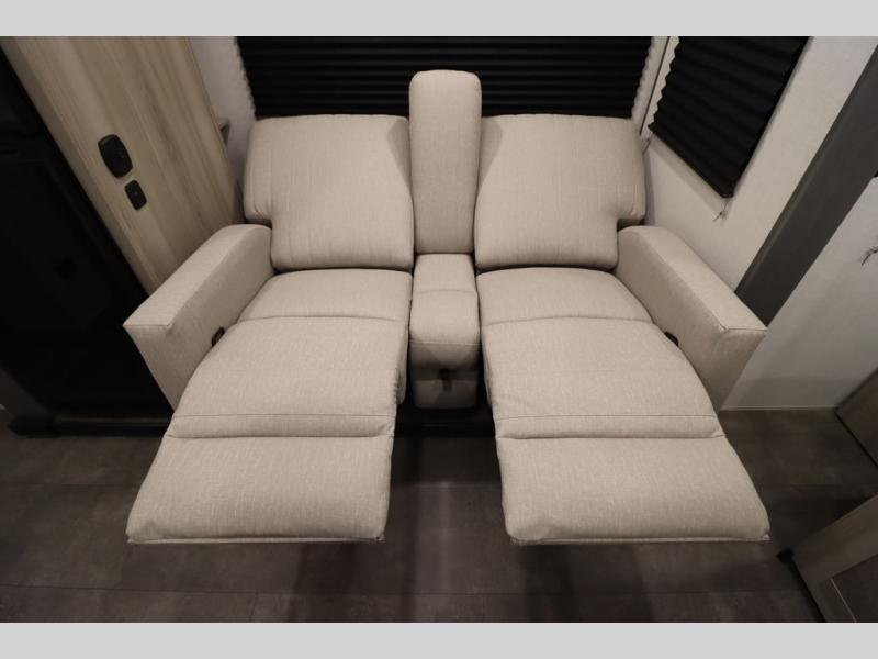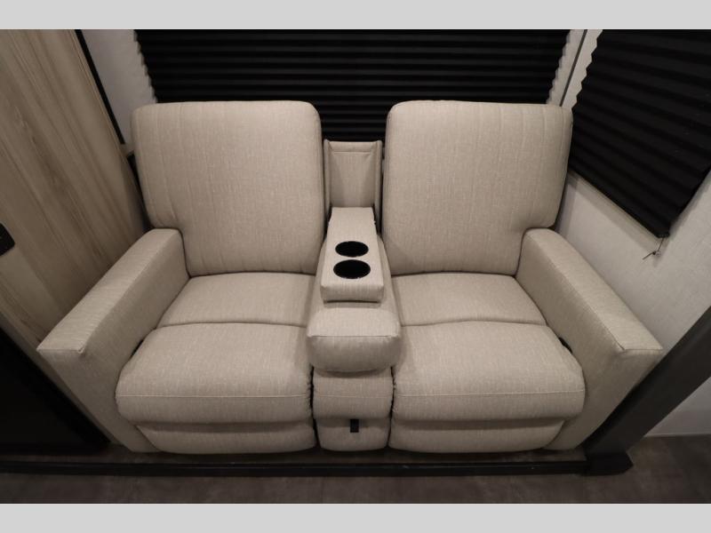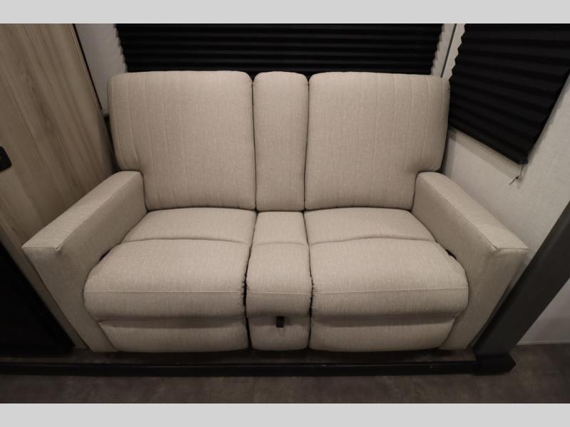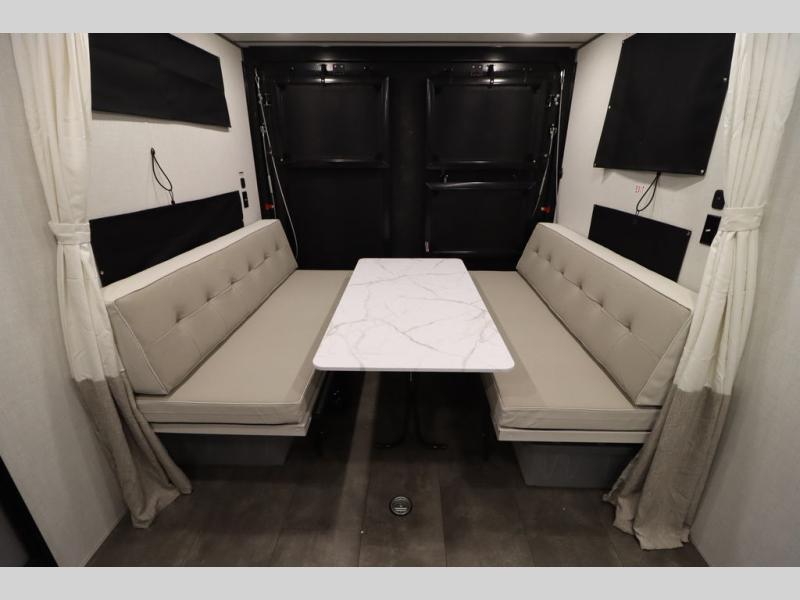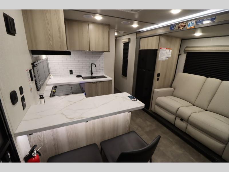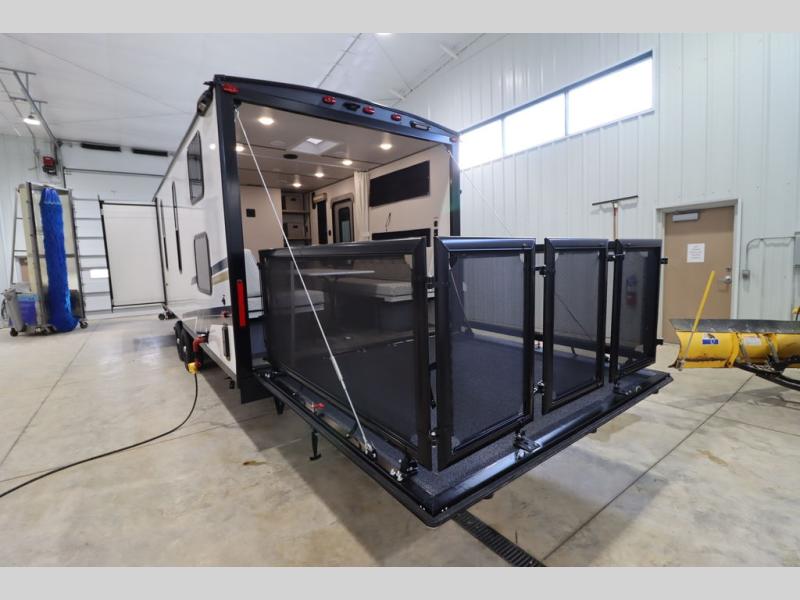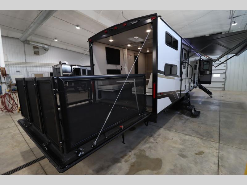 Enjoy a large garage that also functions as living space in this toy hauler! A pair of flip-out sofas flank the free-standing table, so you can eat meals there or convert them to sleeping space at night. The adjacent patio created by converting the rear ramp door offers a lovely outdoor living space. A fully equipped kitchen with counter seating is ready for meal prep, or you can use the outside kitchen as well. Relax on the tri-fold sofa, or retreat to the private front bedroom with its king bed.
