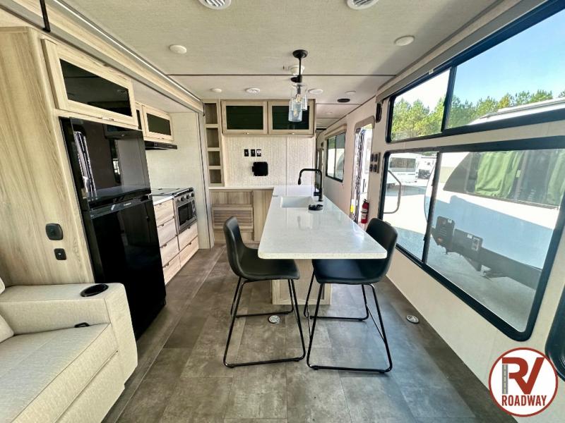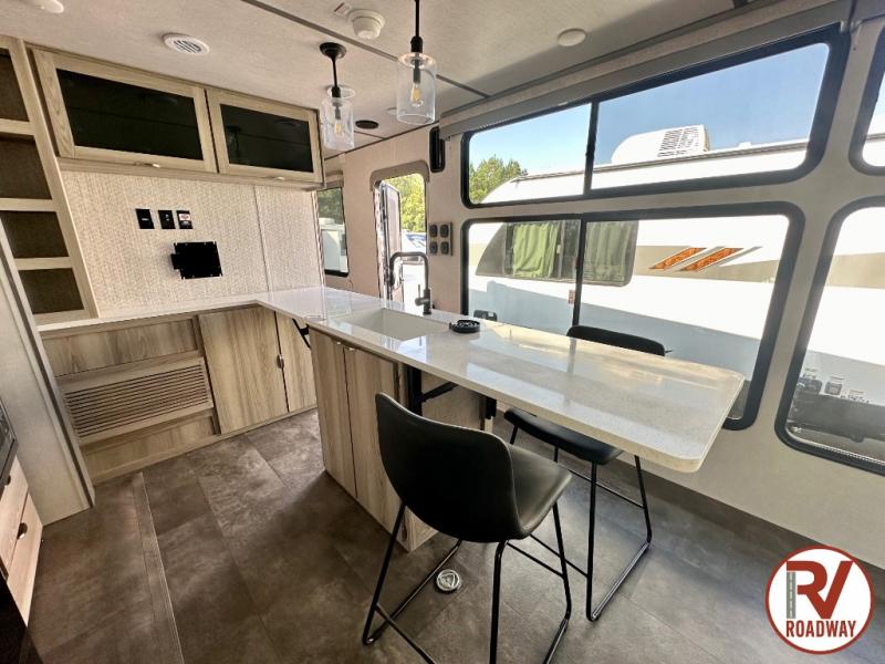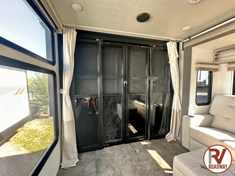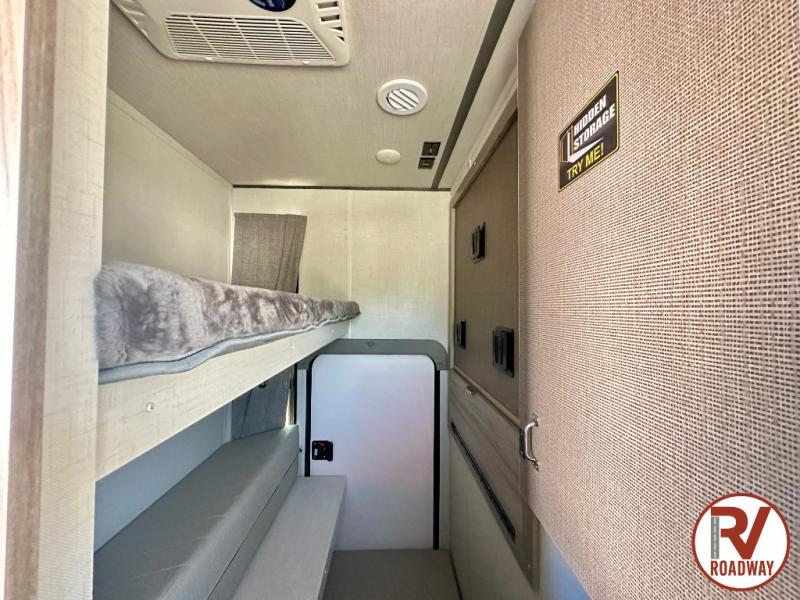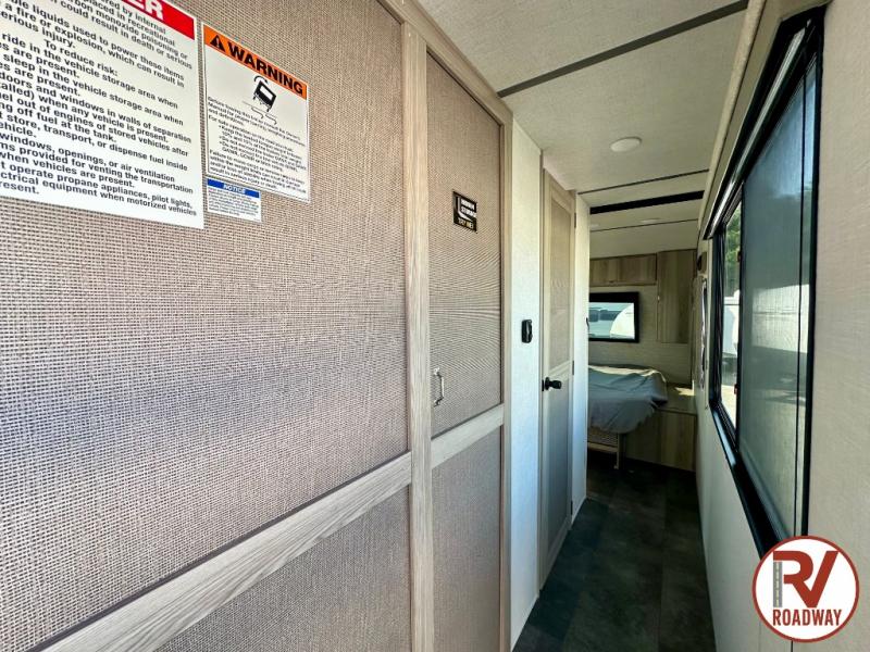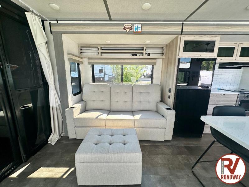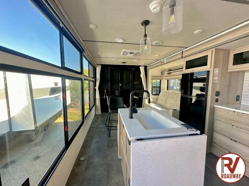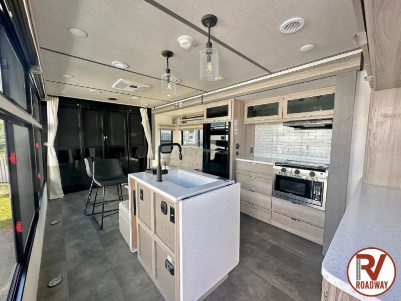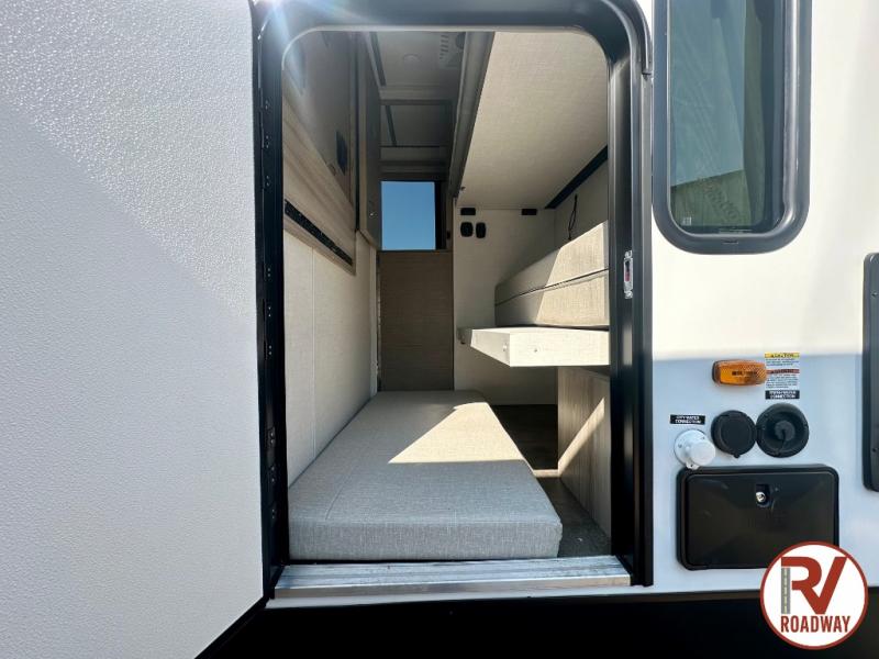There is a lot to love about this toy hauler! Starting with the 1,500 lb. capacity patio with a three seasons door that leads into the garage area. Once you remove your off-road toy from the 1,500 lb. tie downs, you can open up the slide that houses theater seating with a chaise lounge, a dual swinging 12V refrigerator, and cooktop. The kitchen also has a hutch and island with sink and flip-up countertop. You even have a movie theater projector with premium sound to watch your favorite movies in style. The set of bunk beds have their own privacy with a secret door to access them and a bike door for outside access. Everyone can freshen up with the large shower in the full bathroom. The front private bedroom has a king bed with Versa tilt, wardrobes on either side of the bed, and another wardrobe to keep your clothes looking their best!