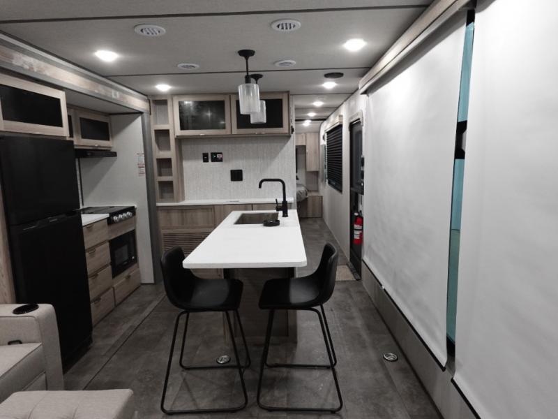 There is a lot to love about this toy hauler! Starting with the 1,500 lb. capacity patio with a three seasons door that leads into the garage area. Once you remove your off-road toy from the 1,500 lb. tie downs, you can open up the slide that houses theater seating with a chaise lounge, a dual swinging 12V refrigerator, and cooktop. The kitchen also has a hutch and island with sink and flip-up countertop. You even have a movie theater projector with premium sound to watch your favorite movies in style. The set of bunk beds have their own privacy with a secret door to access them and a bike door for outside access. Everyone can freshen up with the large shower in the full bathroom. The front private bedroom has a king bed with Versa tilt, wardrobes on either side of the bed, and another wardrobe to keep your clothes looking their best!