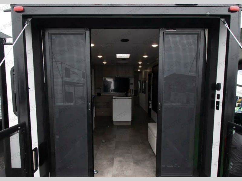 There is a lot to love about this versatile cargo trailer! Starting with the 1,500 lb. capacity patio with a three seasons door that leads into the living area with available space for smaller toys. You can open up the slide that houses theater seating with a chaise lounge, a dual swinging 12V refrigerator, and cooktop. The kitchen also has a hutch and island with sink and flip-up countertop. You even have a movie theater projector with premium sound to watch your favorite movies in style. The set of bunk beds have their own privacy with a secret door to access them and a bike door for outside access. Everyone can freshen up with the large shower in the full bathroom. The front private bedroom has a king bed with Versa tilt, wardrobes on either side of the bed, and another wardrobe to keep your clothes looking their best!