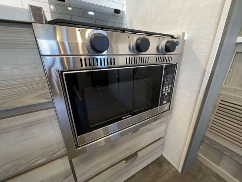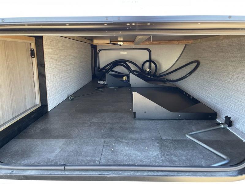 There is a lot to love about this toy hauler! Starting with the 1,500 lb. capacity patio with a three seasons door that leads into the garage area. Once you remove your off-road toy from the 1,500 lb. tie downs, you can open up the slide that houses theater seating with a chaise lounge, a dual swinging 12V refrigerator, and cooktop. The kitchen also has a hutch and island with sink and flip-up countertop. You even have a movie theater projector with premium sound to watch your favorite movies in style. The set of bunk beds have their own privacy with a secret door to access them and a bike door for outside access. Everyone can freshen up with the large shower in the full bathroom. The front private bedroom has a king bed with Versa tilt, wardrobes on either side of the bed, and another wardrobe to keep your clothes looking their best!