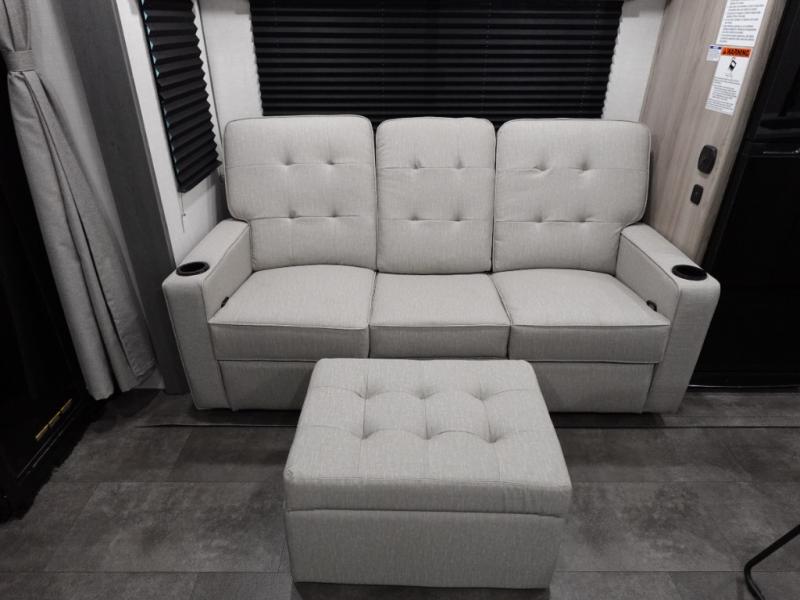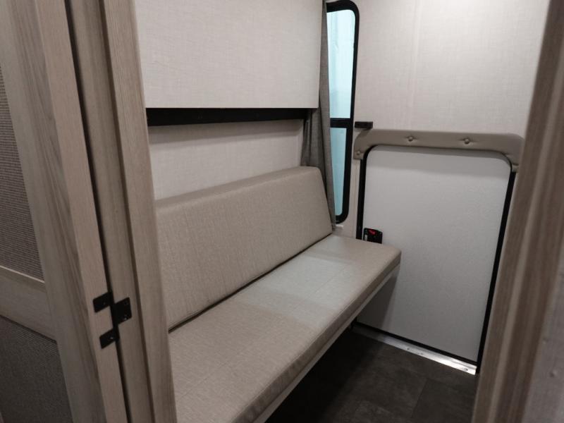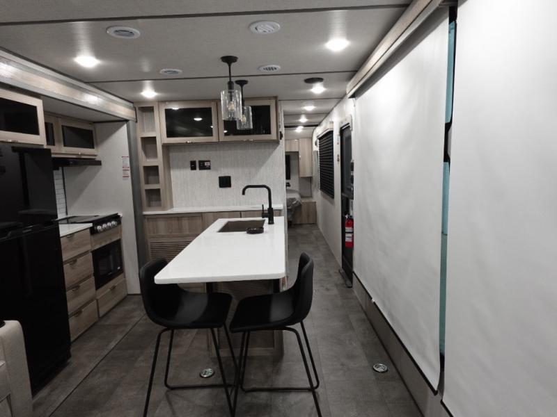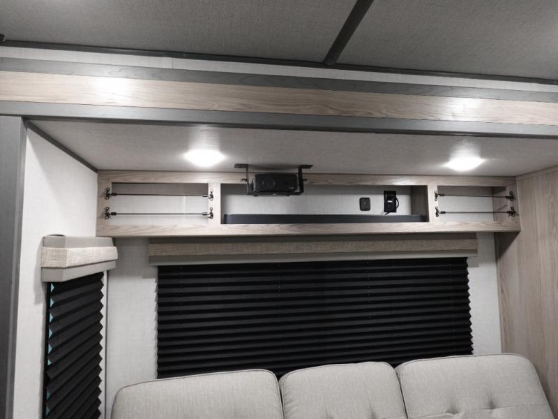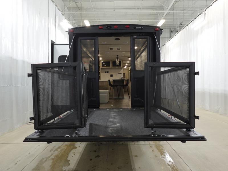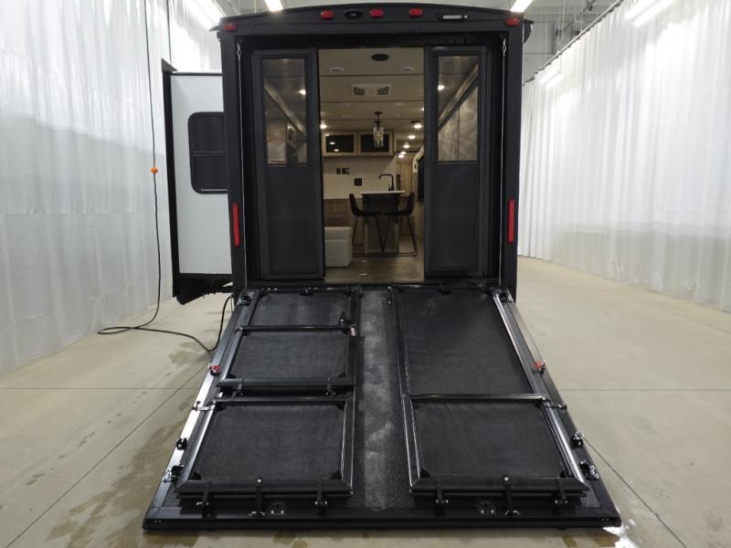 There is a lot to love about this versatile cargo trailer! Starting with the 1,500 lb. capacity patio with a three seasons door that leads into the living area with available space for smaller toys. You can open up the slide that houses theater seating with a chaise lounge, a dual swinging 12V refrigerator, and cooktop. The kitchen also has a hutch and island with sink and flip-up countertop. You even have a movie theater projector with premium sound to watch your favorite movies in style. The set of bunk beds have their own privacy with a secret door to access them and a bike door for outside access. Everyone can freshen up with the large shower in the full bathroom. The front private bedroom has a king bed, wardrobes on either side of the bed, and another wardrobe to keep your clothes looking their best!