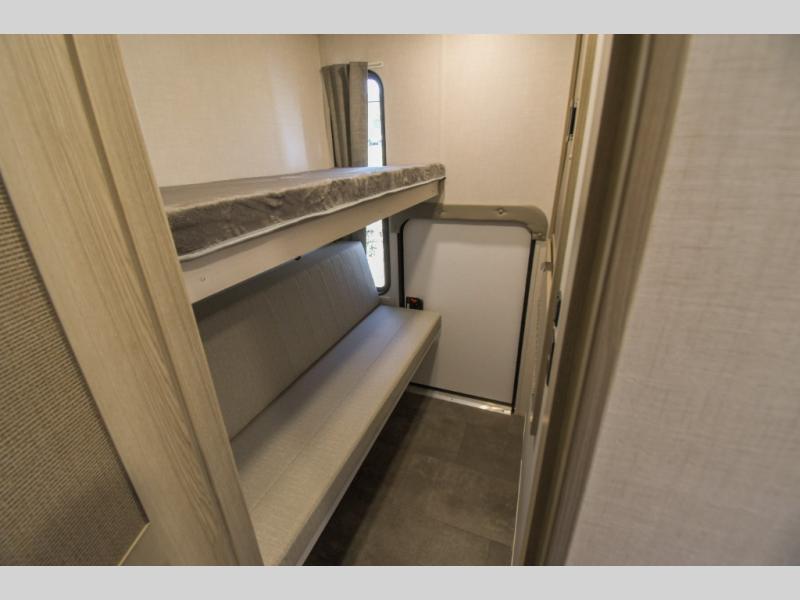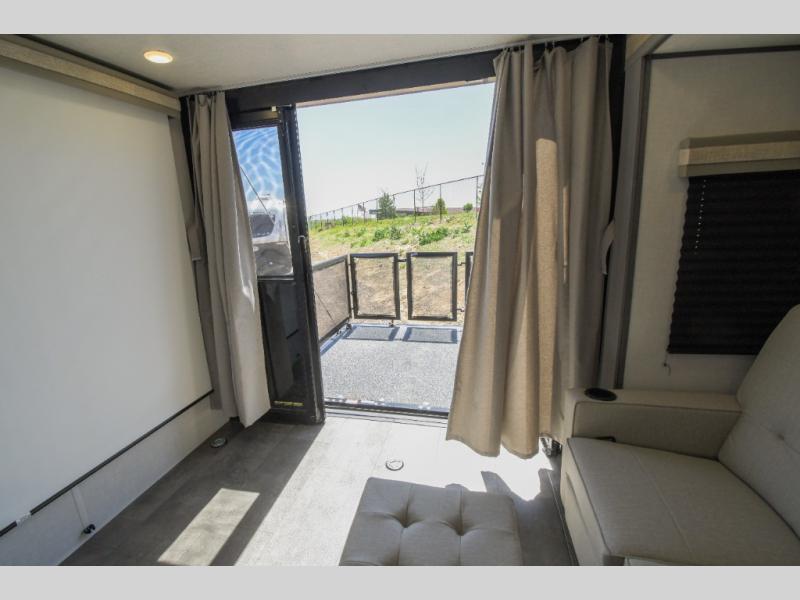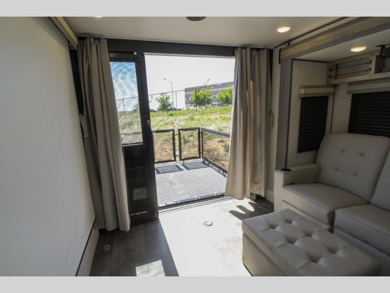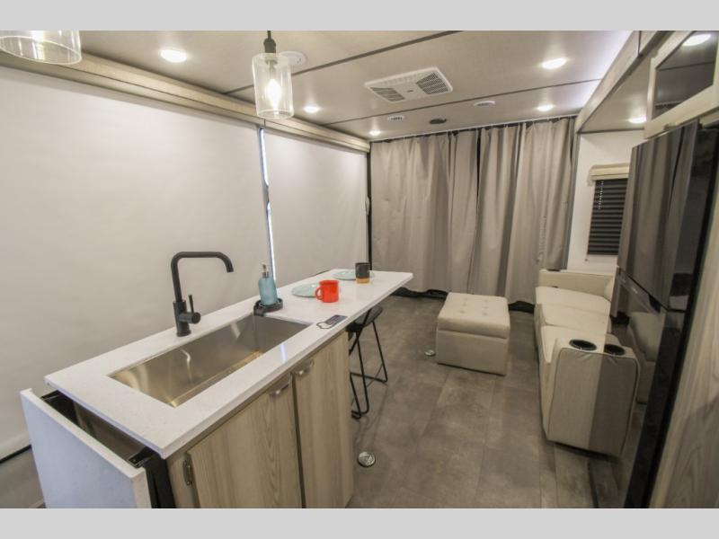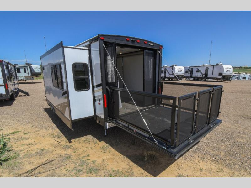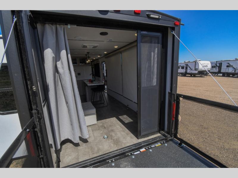 There is a lot to love about this versatile cargo trailer! Starting with the 1,500 lb. capacity patio with a three seasons door that leads into the living area with available space for smaller toys. You can open up the slide that houses theater seating with a chaise lounge, a dual swinging 12V refrigerator, and cooktop. The kitchen also has a hutch and island with sink and flip-up countertop. You even have a movie theater projector with premium sound to watch your favorite movies in style. The set of bunk beds have their own privacy with a secret door to access them and a bike door for outside access. Everyone can freshen up with the large shower in the full bathroom. The front private bedroom has a king bed with Versa tilt, wardrobes on either side of the bed, and another wardrobe to keep your clothes looking their best!