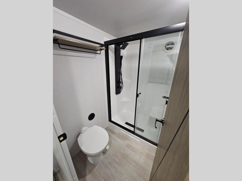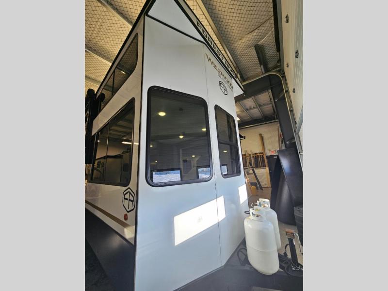 With any Wildwood Grand Lodge destination trailer by Forest River, you can enjoy extended stays wherever you go! There is 4K awning blade lighting outside, along with slide out awning toppers, plus a heated and enclosed Accessibelly for added protection. Inside, you'll love the stylish backsplash update, elegant curtain rods and curtains, TFL black walnut entertainment shelves, and stainless steel kitchen appliances. A Serta mattress in the bedroom(s) will provide comfort to each journey, and there is a tankless water heater for hot water when you need it.