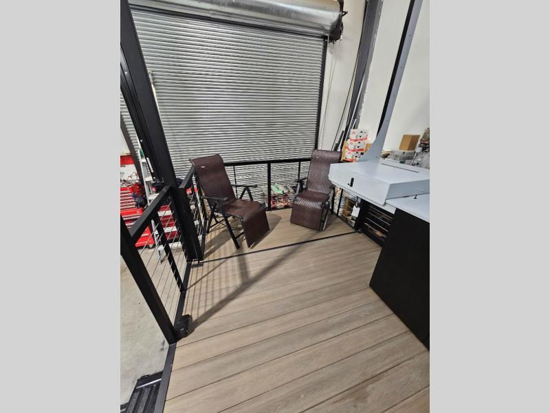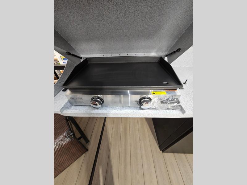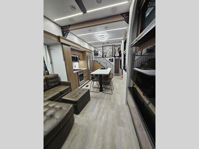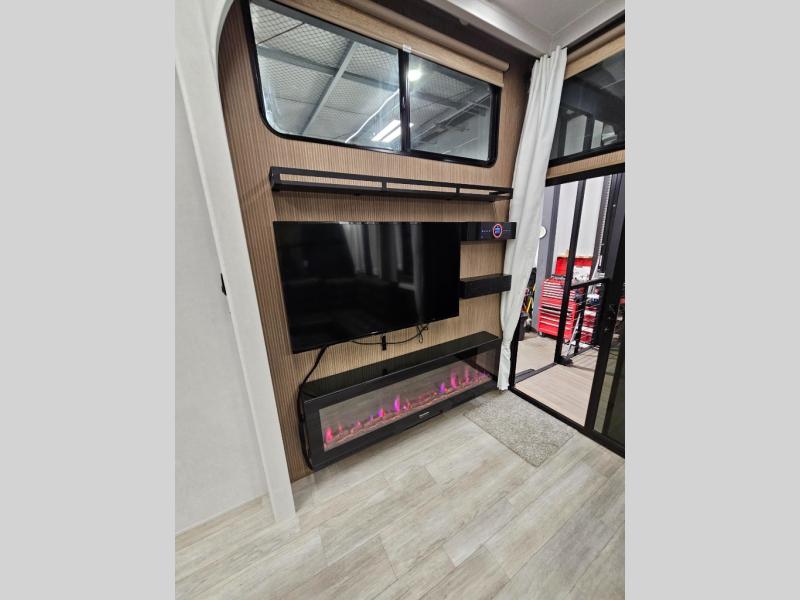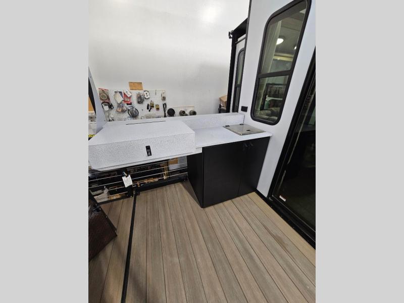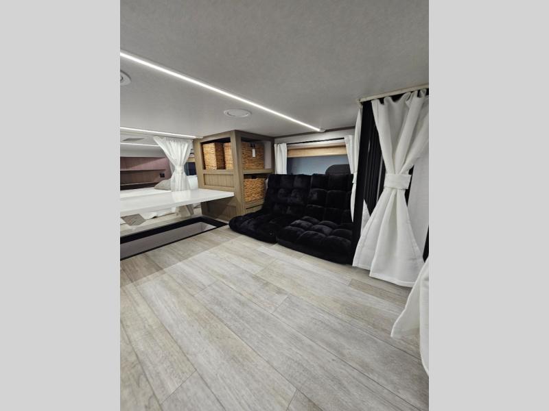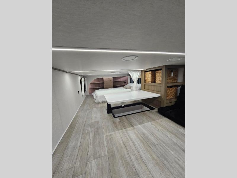 One look at this destination trailer and you'll be sold! The rear porch/veranda includes an outdoor kitchen with a cooktop and sink plus a ceiling fan so you can sit out back and visit with friends. The L-shaped sofa with an ottoman inside will provide cozy seating space, especially with the fireplace right across the room. Your crew can dine at the kitchen island with four chairs, and there is a large pantry where snacks can be kept for game night. When it's time to call it a night, the front private bedroom with a Versa-Tilt custom king bed is sure to bring comfort, and there is a dresser and wardrobe for your things. A third wardrobe includes washer and dryer prep if you choose to add those appliances. Any guests that aren't sleeping on the sofa can sleep in the loft with a queen bed, large front cabinet with shelves, and an additional cabinet for storage. You will also find a table with space below for your feet, so the kids can color, eat, and play games!