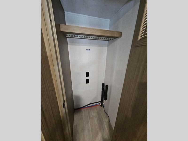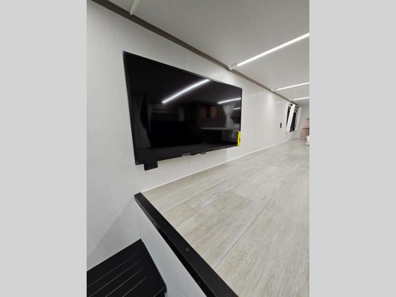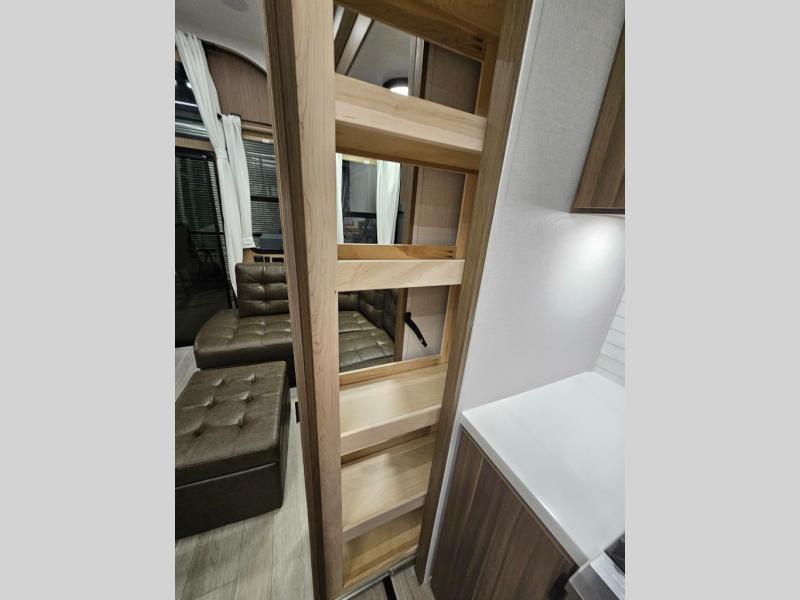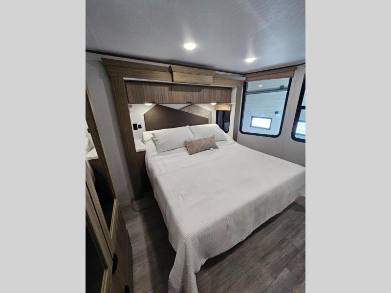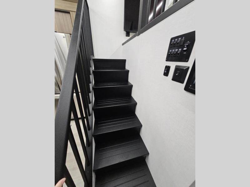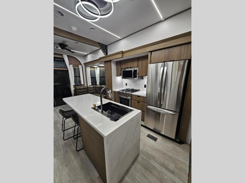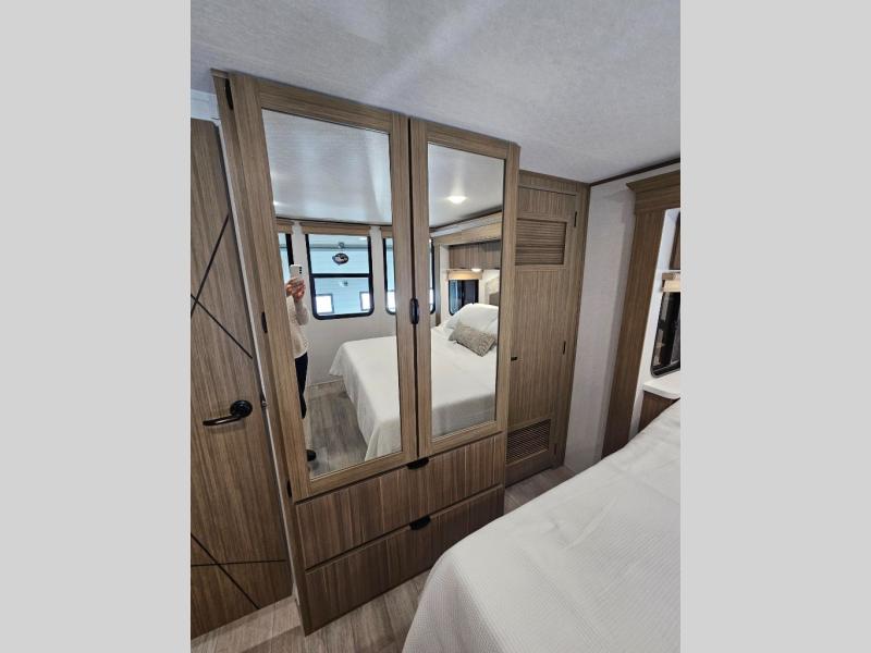 One look at this destination trailer and you'll be sold! The rear porch/veranda includes an outdoor kitchen with a cooktop and sink plus a ceiling fan so you can sit out back and visit with friends. The L-shaped sofa with an ottoman inside will provide cozy seating space, especially with the fireplace right across the room. Your crew can dine at the kitchen island with four chairs, and there is a large pantry where snacks can be kept for game night. When it's time to call it a night, the front private bedroom with a Versa-Tilt custom king bed is sure to bring comfort, and there is a dresser and wardrobe for your things. A third wardrobe includes washer and dryer prep if you choose to add those appliances. Any guests that aren't sleeping on the sofa can sleep in the loft with a queen bed, large front cabinet with shelves, and an additional cabinet for storage. You will also find a table with space below for your feet, so the kids can color, eat, and play games!